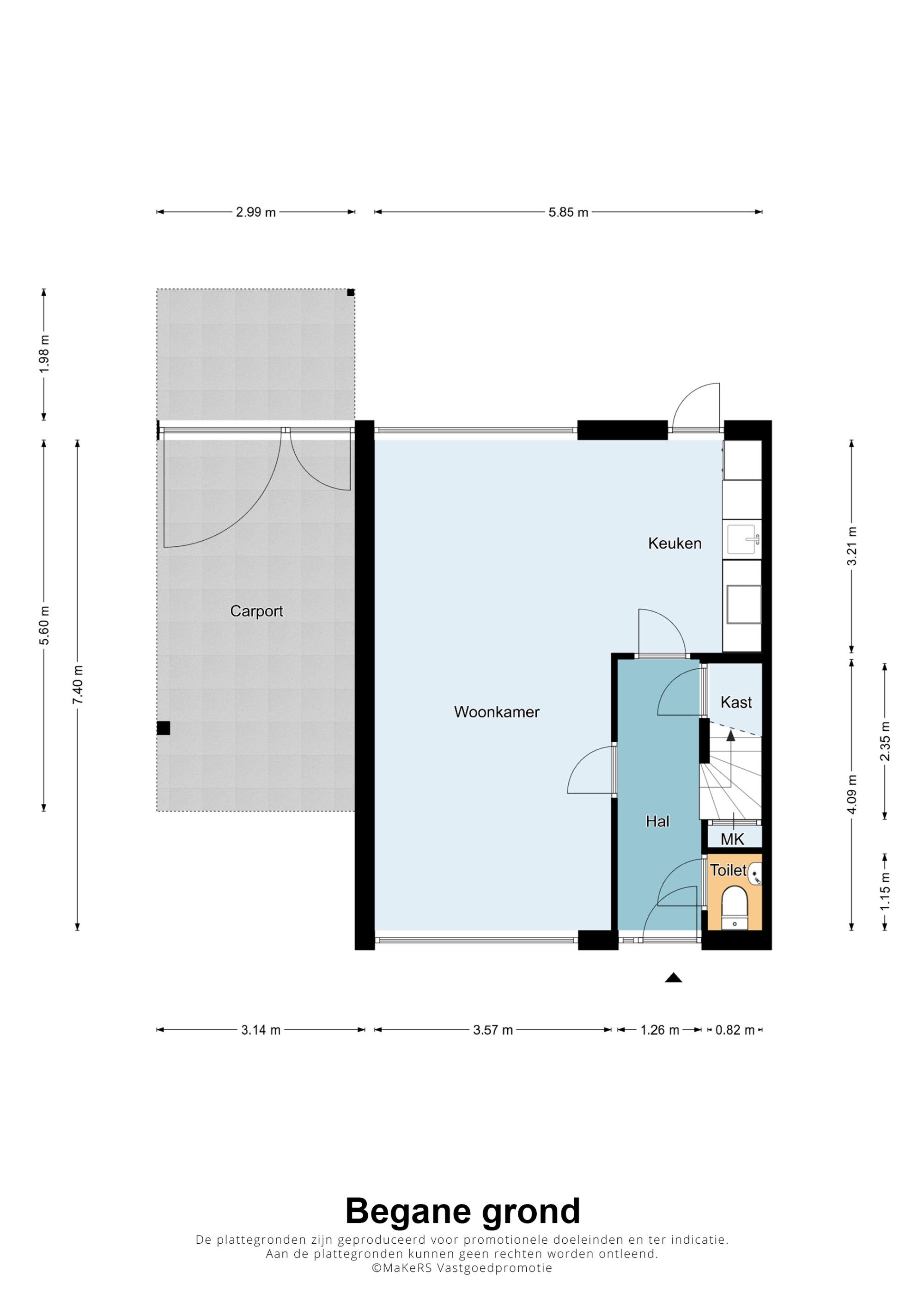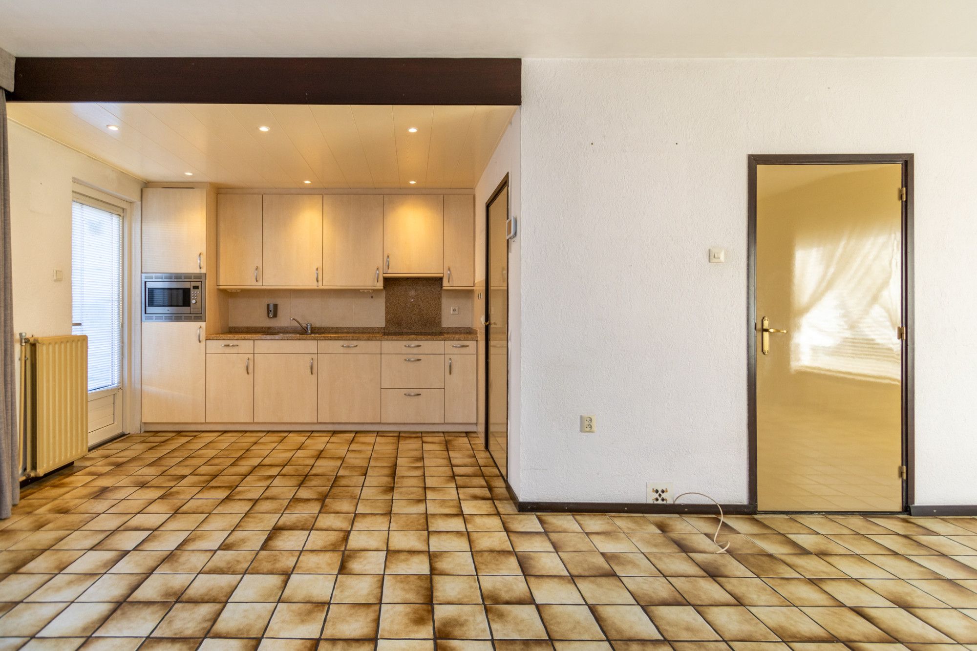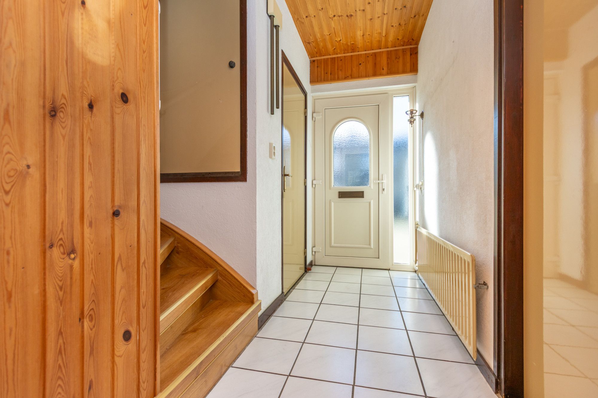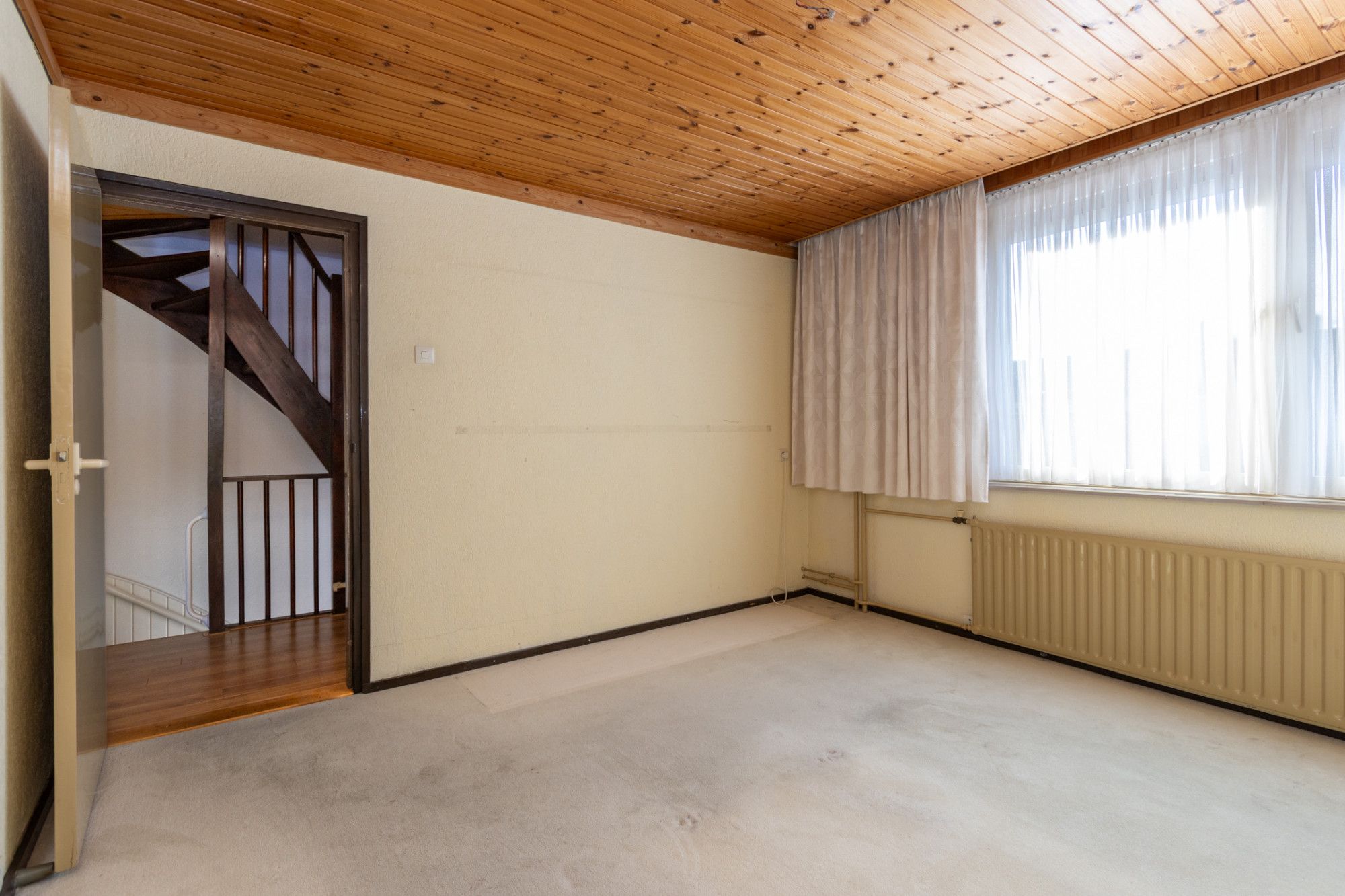 Via de entree aan de voorzijde kom je in de hal, waar zich de trapopgang met weggewerkte meterkast, het toilet en de toegang tot zowel de woonkamer als de keuken bevinden. De woonkamer is licht en ruim dankzij de grote raampartijen en biedt een prettig uitzicht op zowel de voor- als achterzijde van de woning. De ruimte vormt een uitstekende basis om geheel naar eigen smaak te moderniseren en eventueel uit te bouwen.