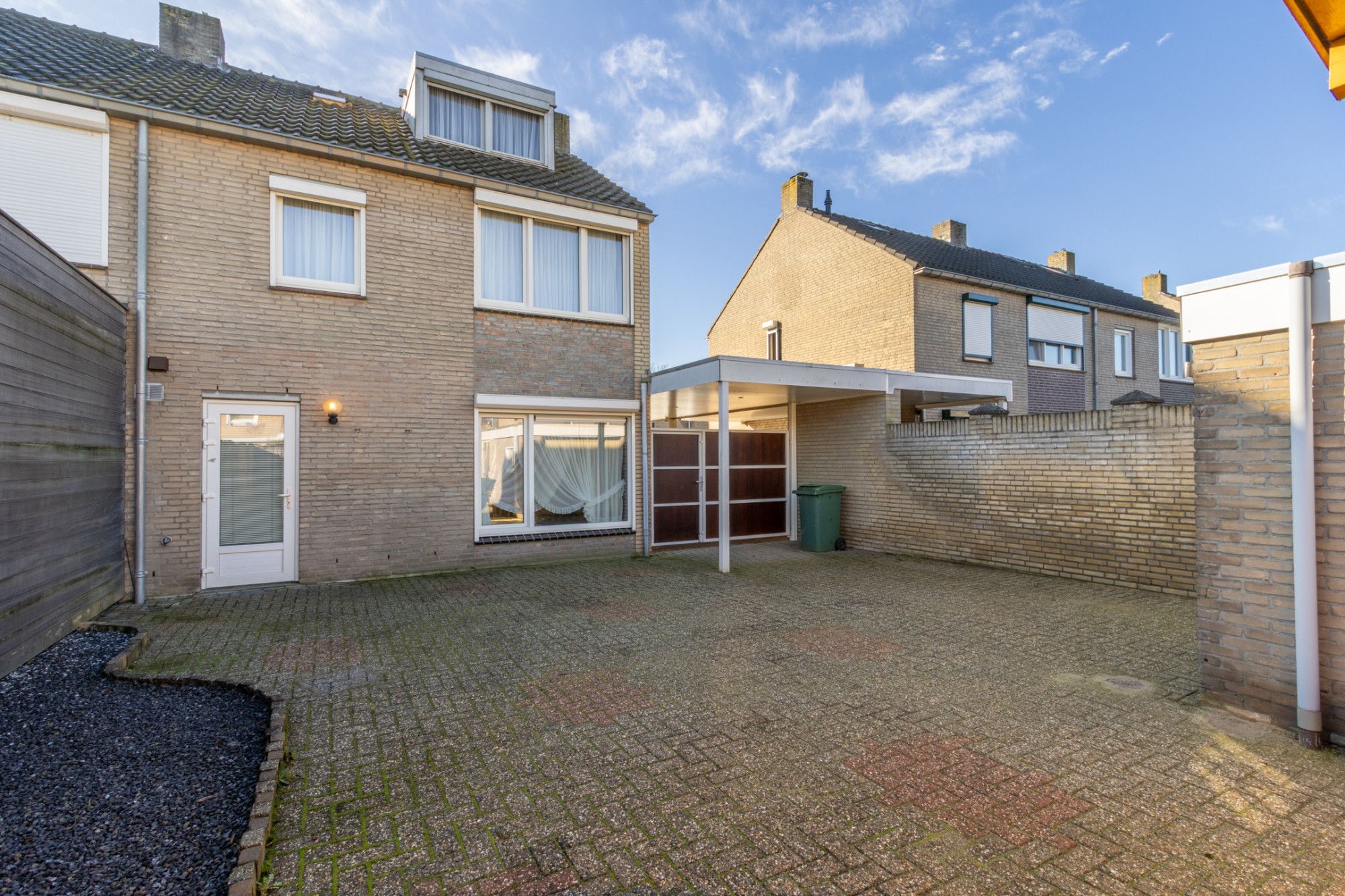 Aan de zijkant van de woning ligt de diepe oprit met carport en de vrijstaande garage. Deze biedt volop bergruimte en mogelijkheden als hobbyruimte, opslag of het stallen van fietsen en gereedschap.