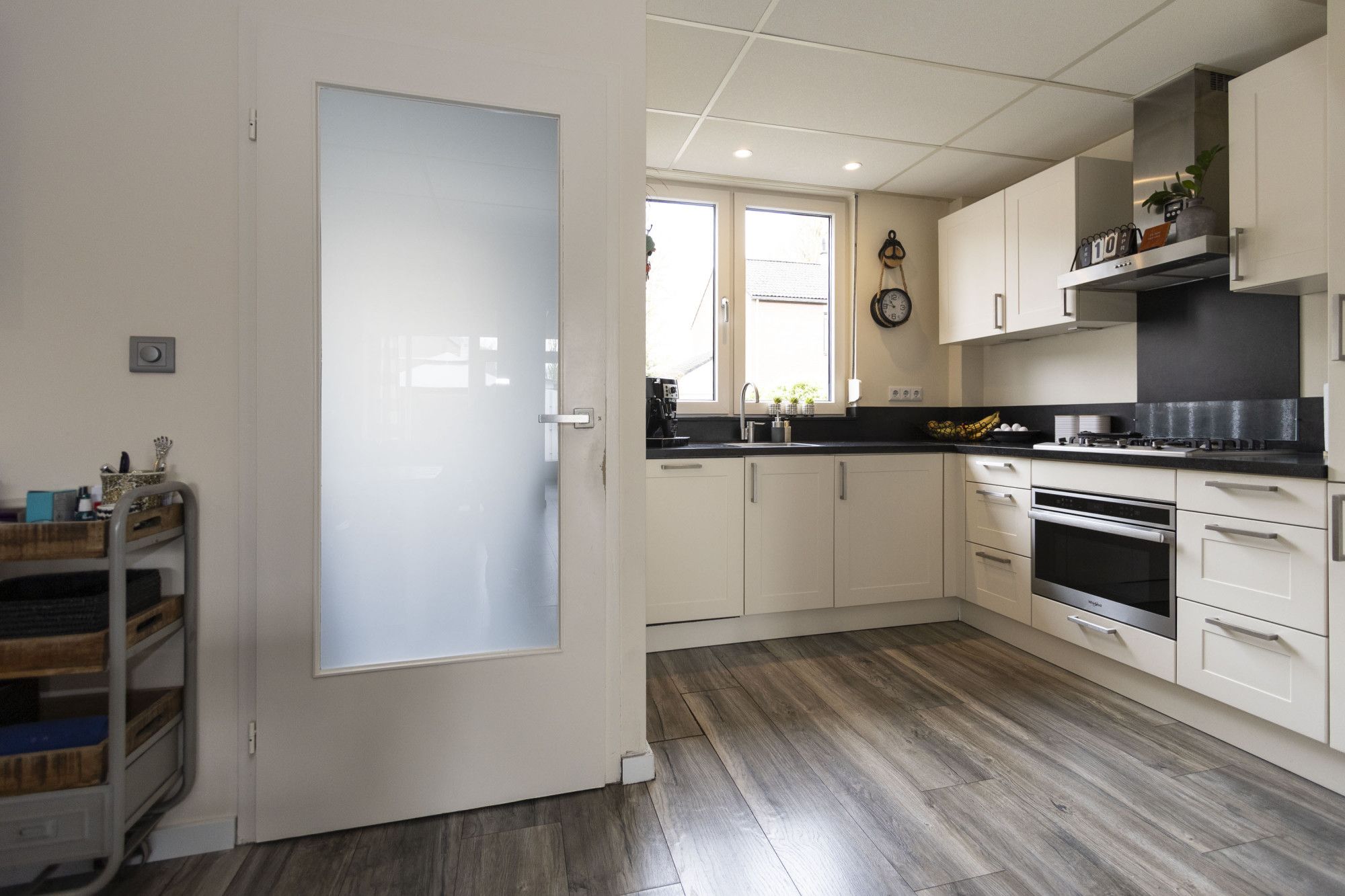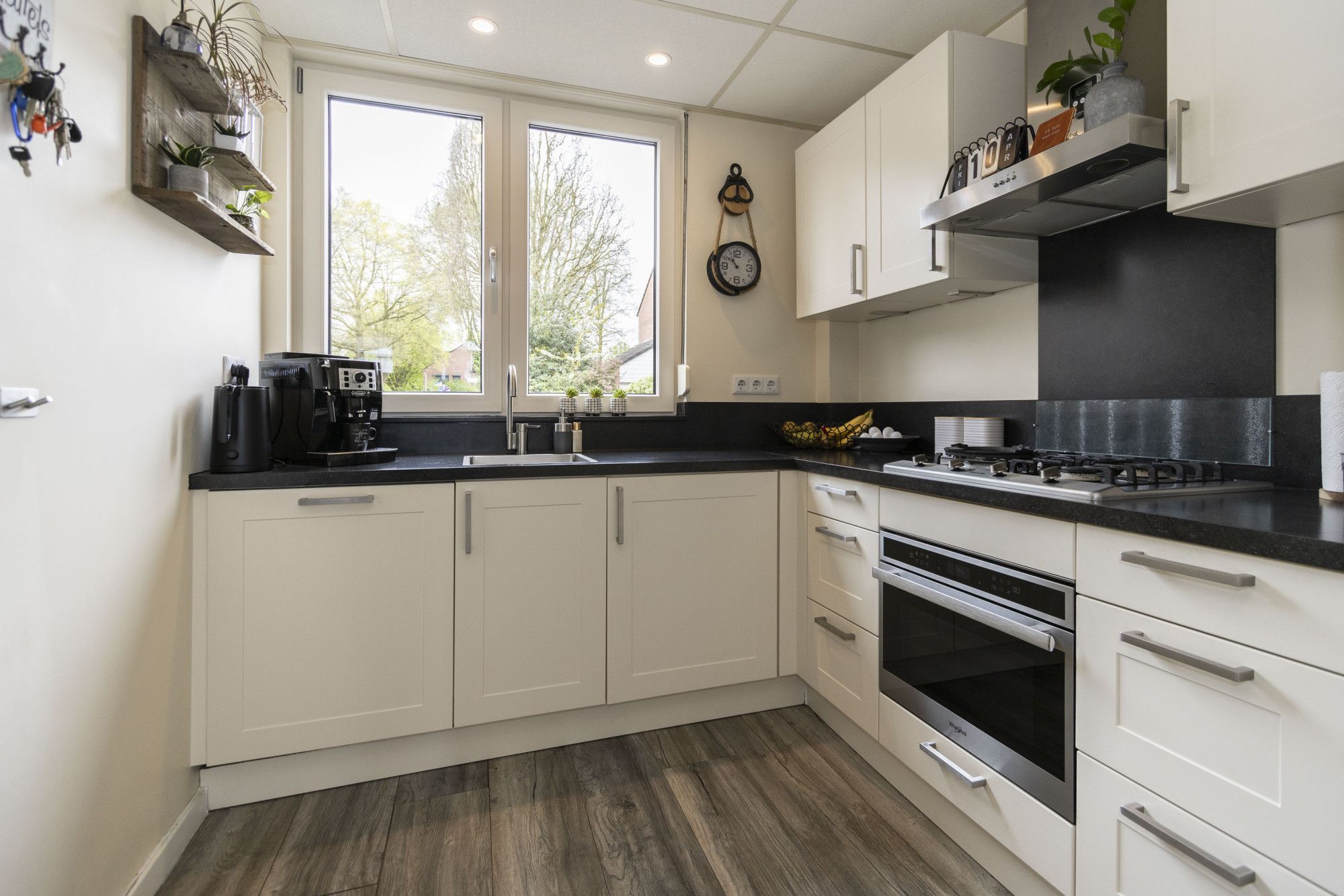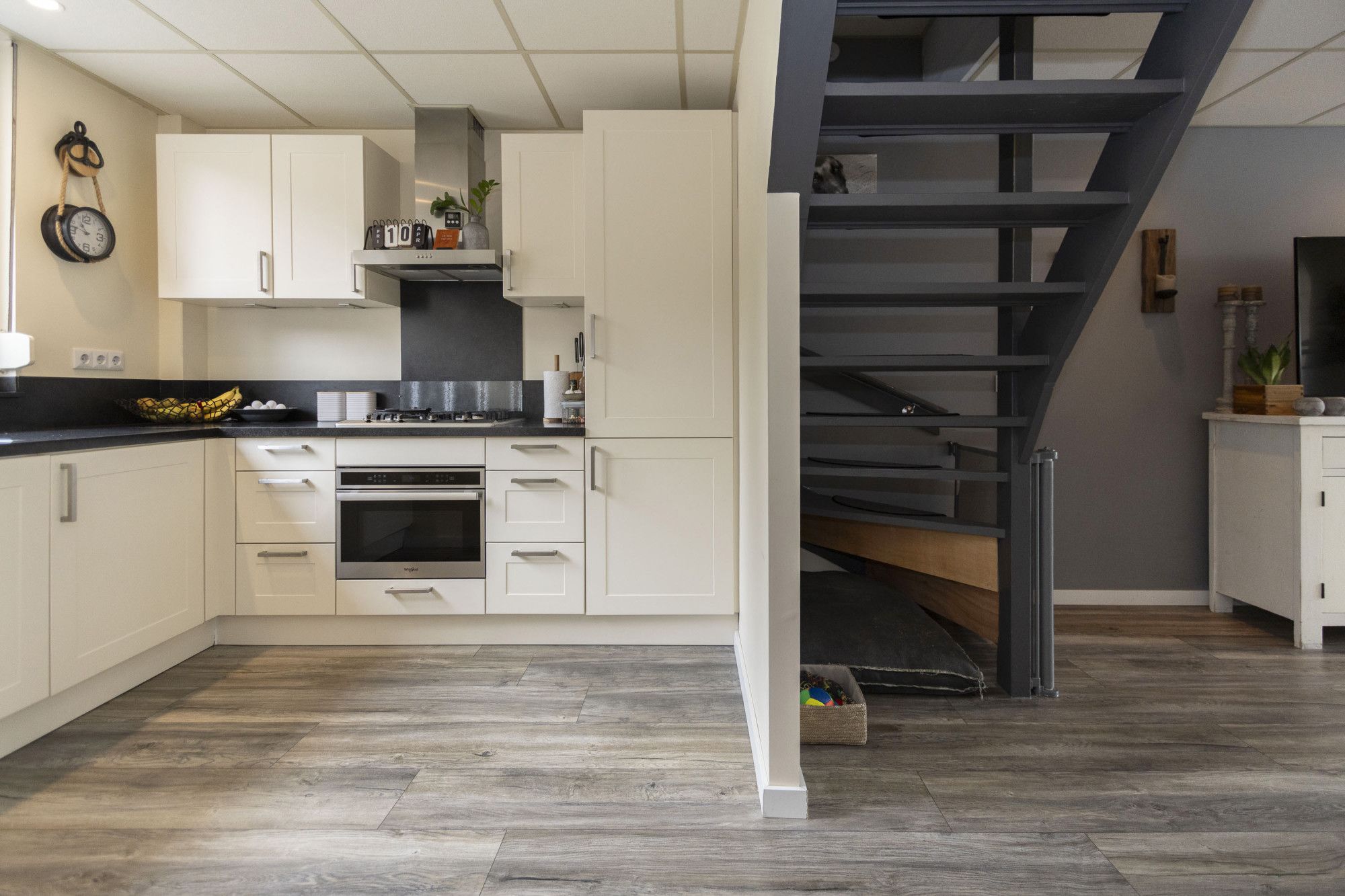De open keuken is modern uitgevoerd en voorzien van diverse inbouwapparatuur, waaronder een combi-oven, gaskookplaat, afzuigkap, koelkast en vaatwasser. De keuken heeft veel werkruimte en een frisse uitstraling.