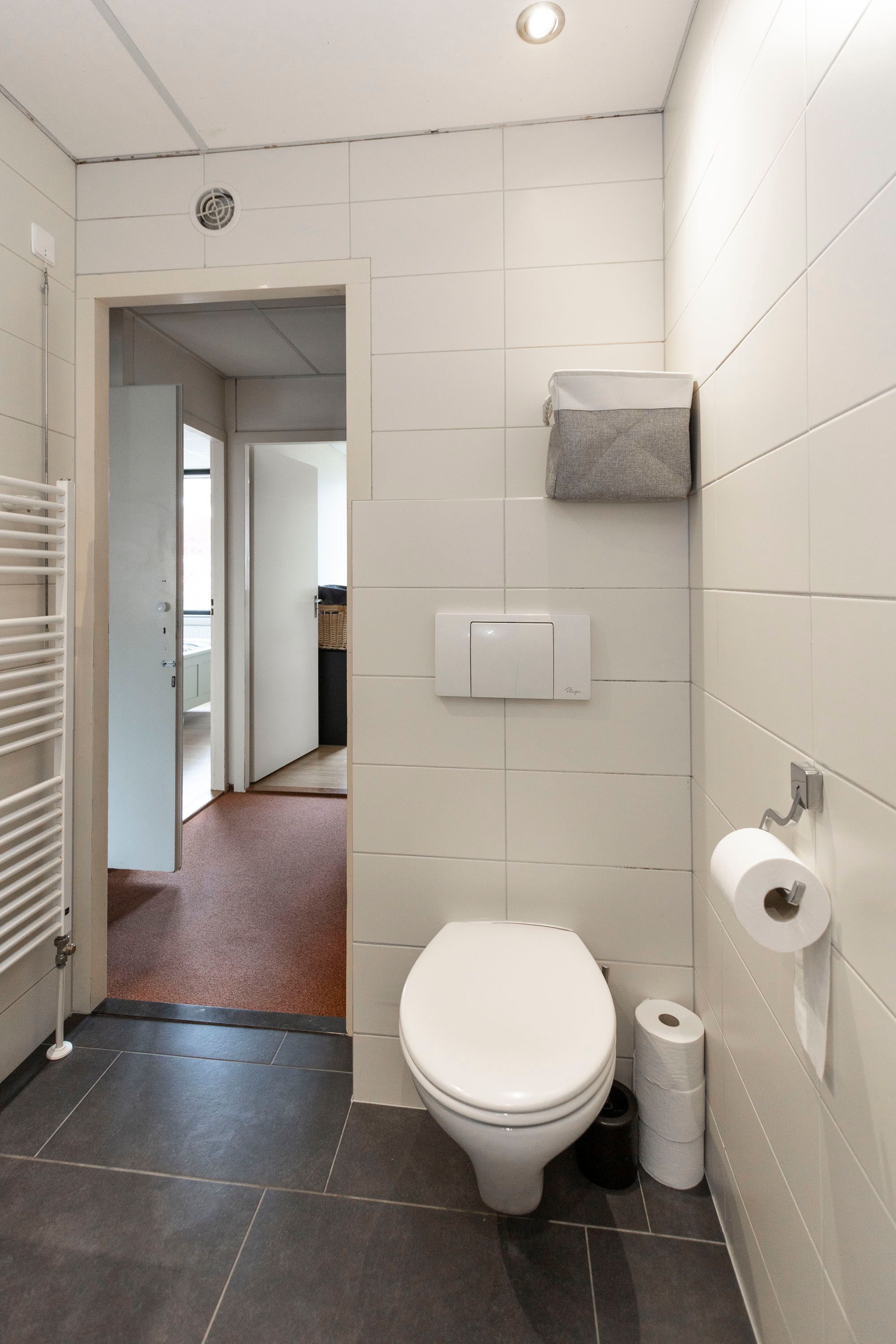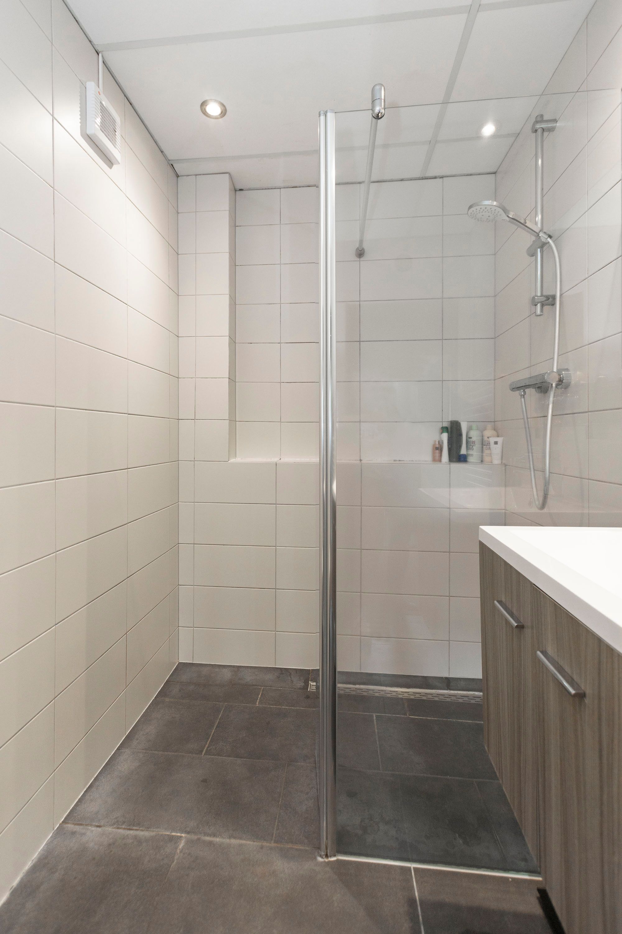 • Nette, tijdloze badkamer met inloopdouche, wandcloset en wastafelmeubel
