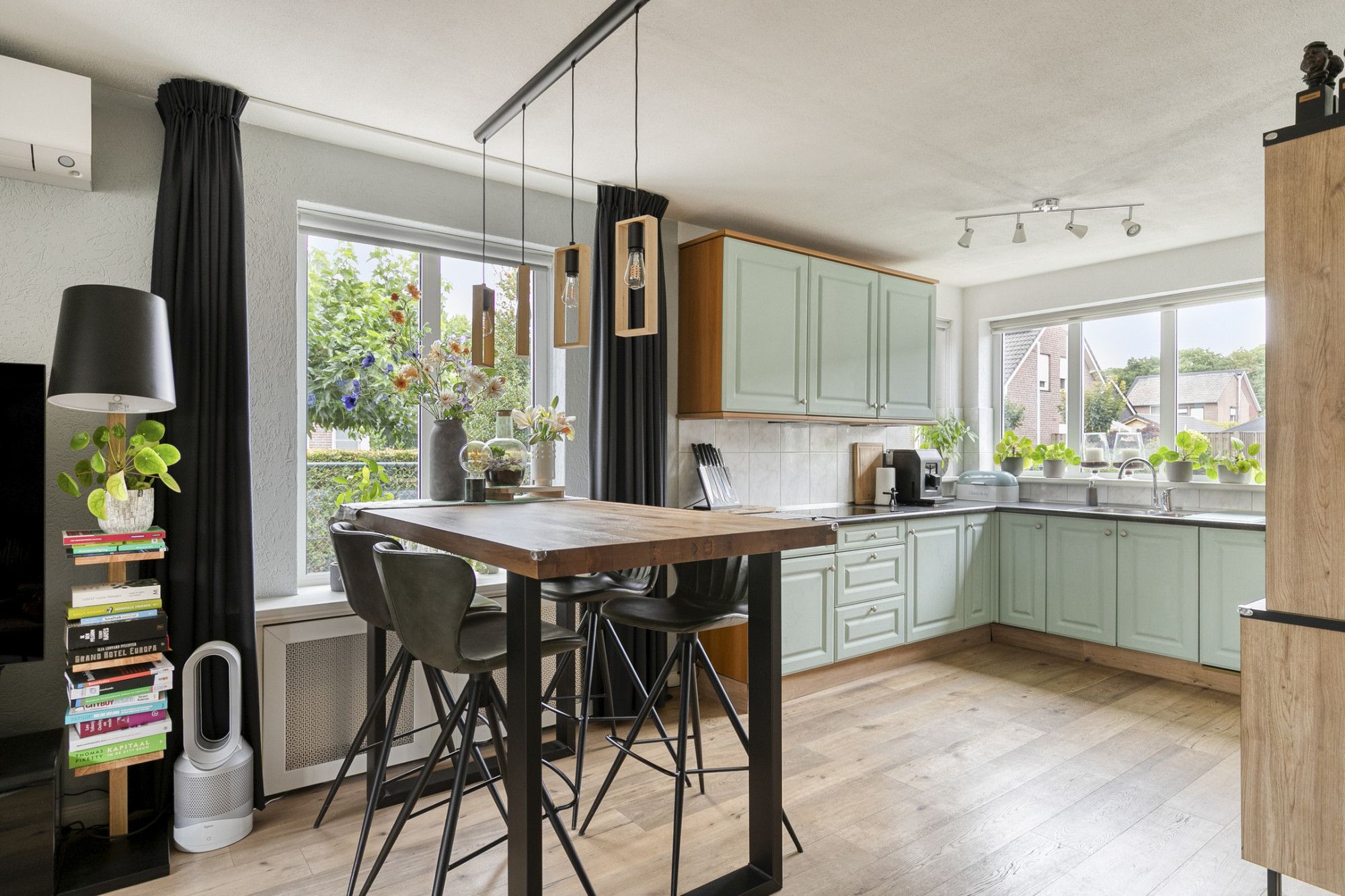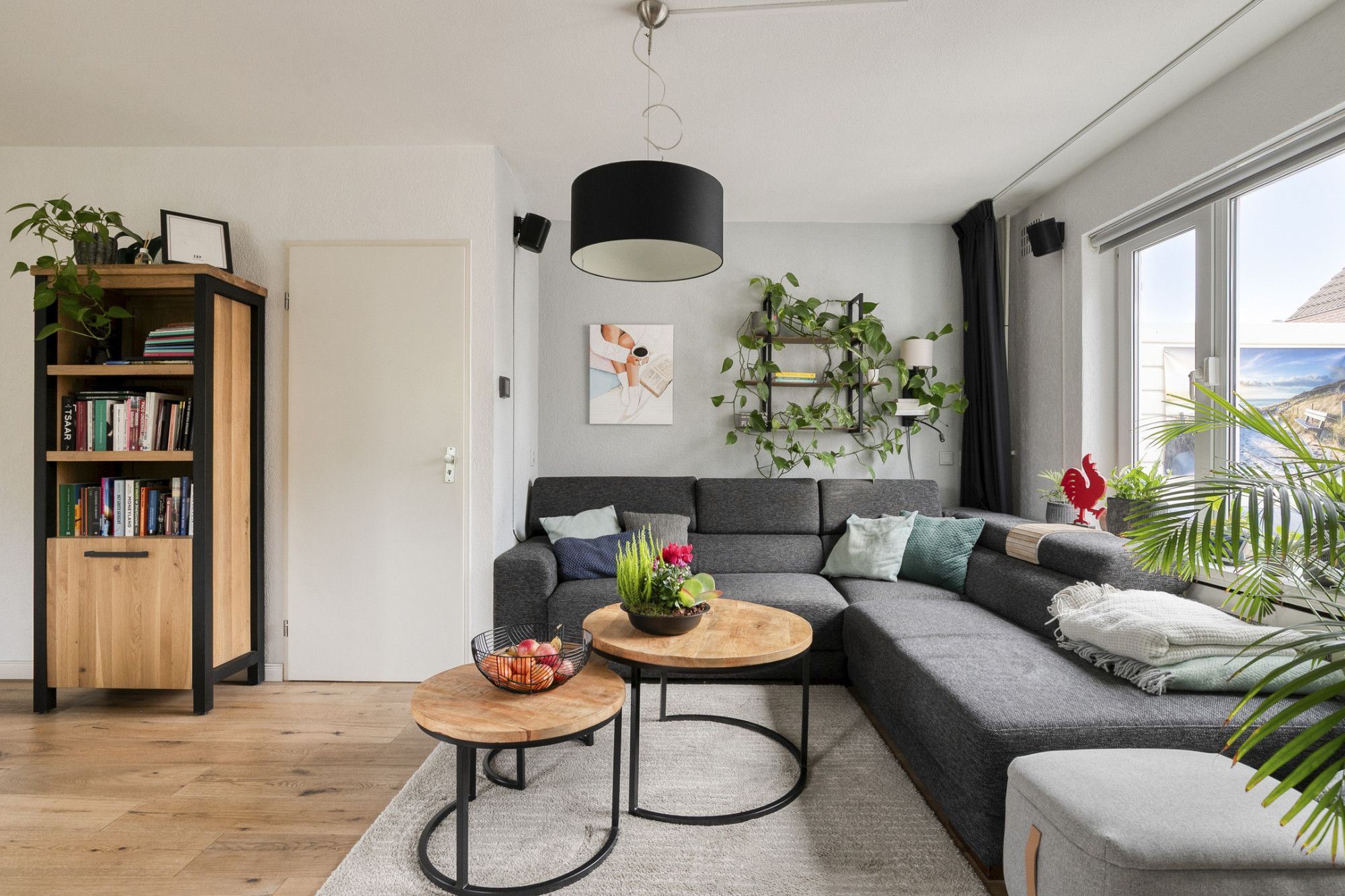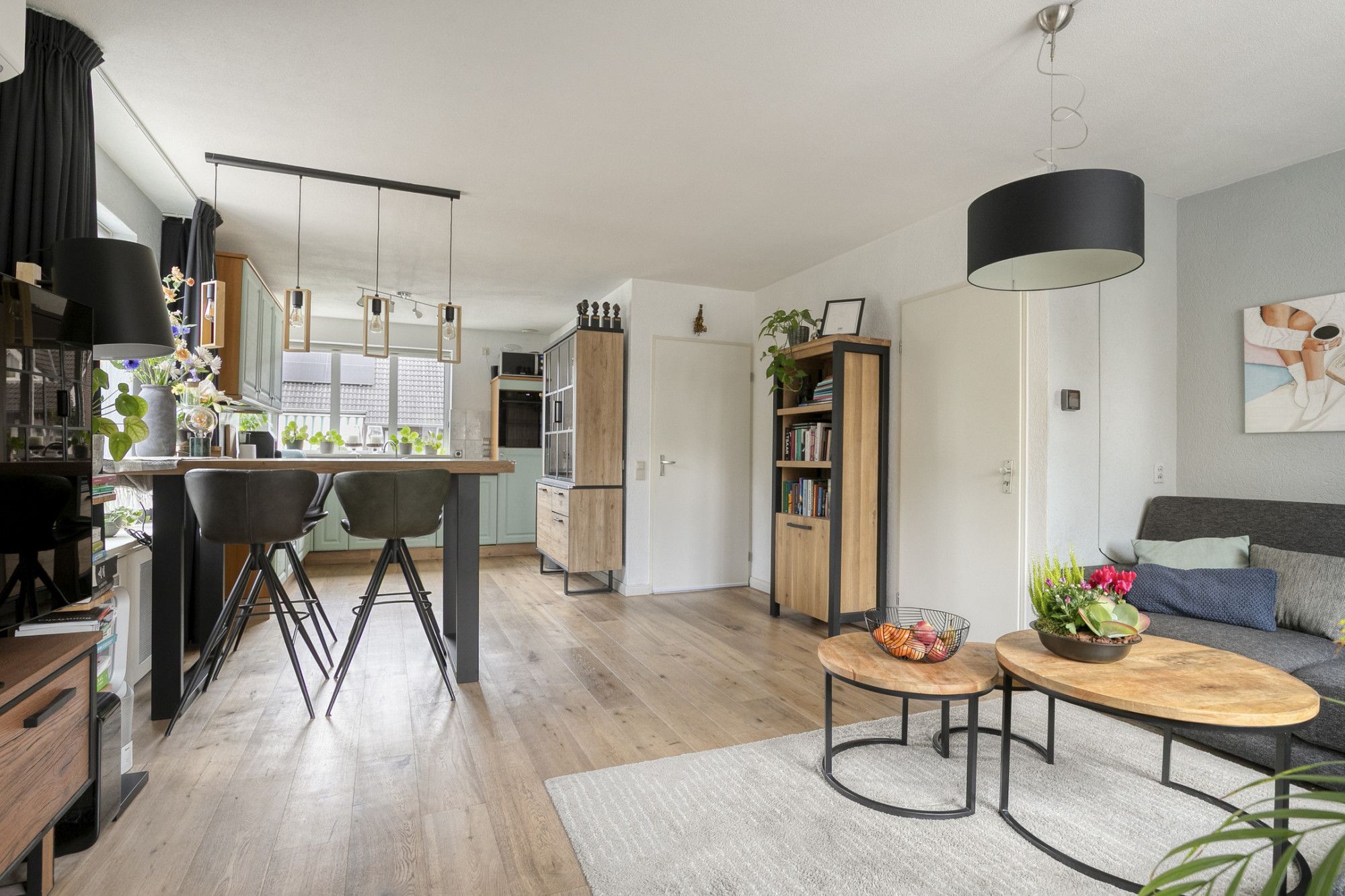 De woonkamer is ruim opgezet (circa 39 m²) en geniet van veel lichtinval door de grote raampartijen. De ruimte beschikt over een trapkast, airconditioning en is ingedeeld met een zithoek en een eethoek. De afwerking is verzorgd en sluit mooi aan op de open keuken.