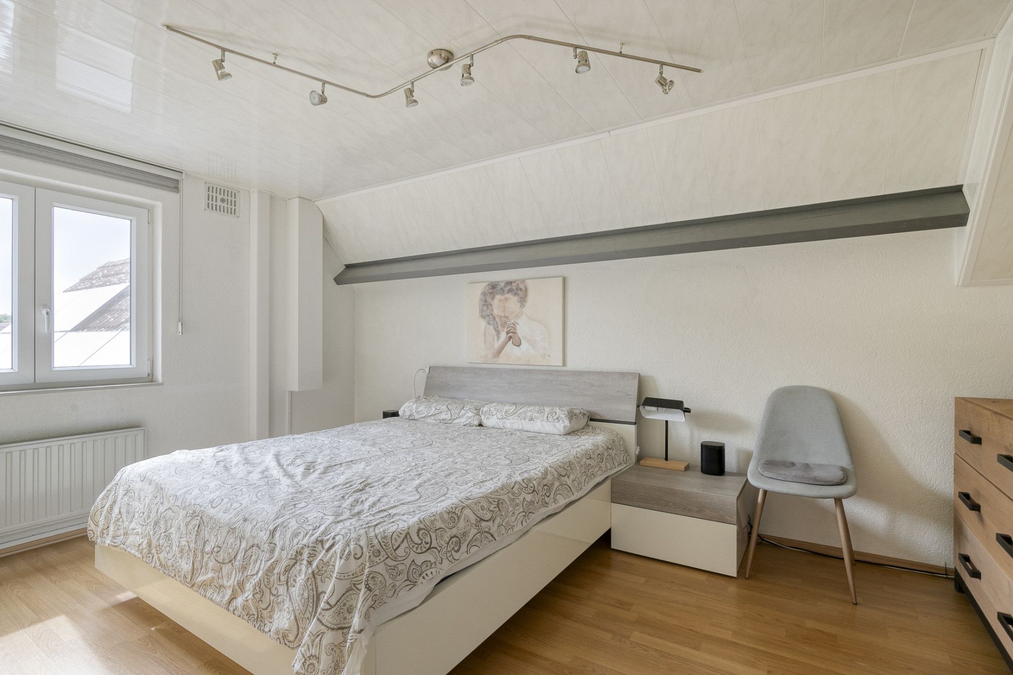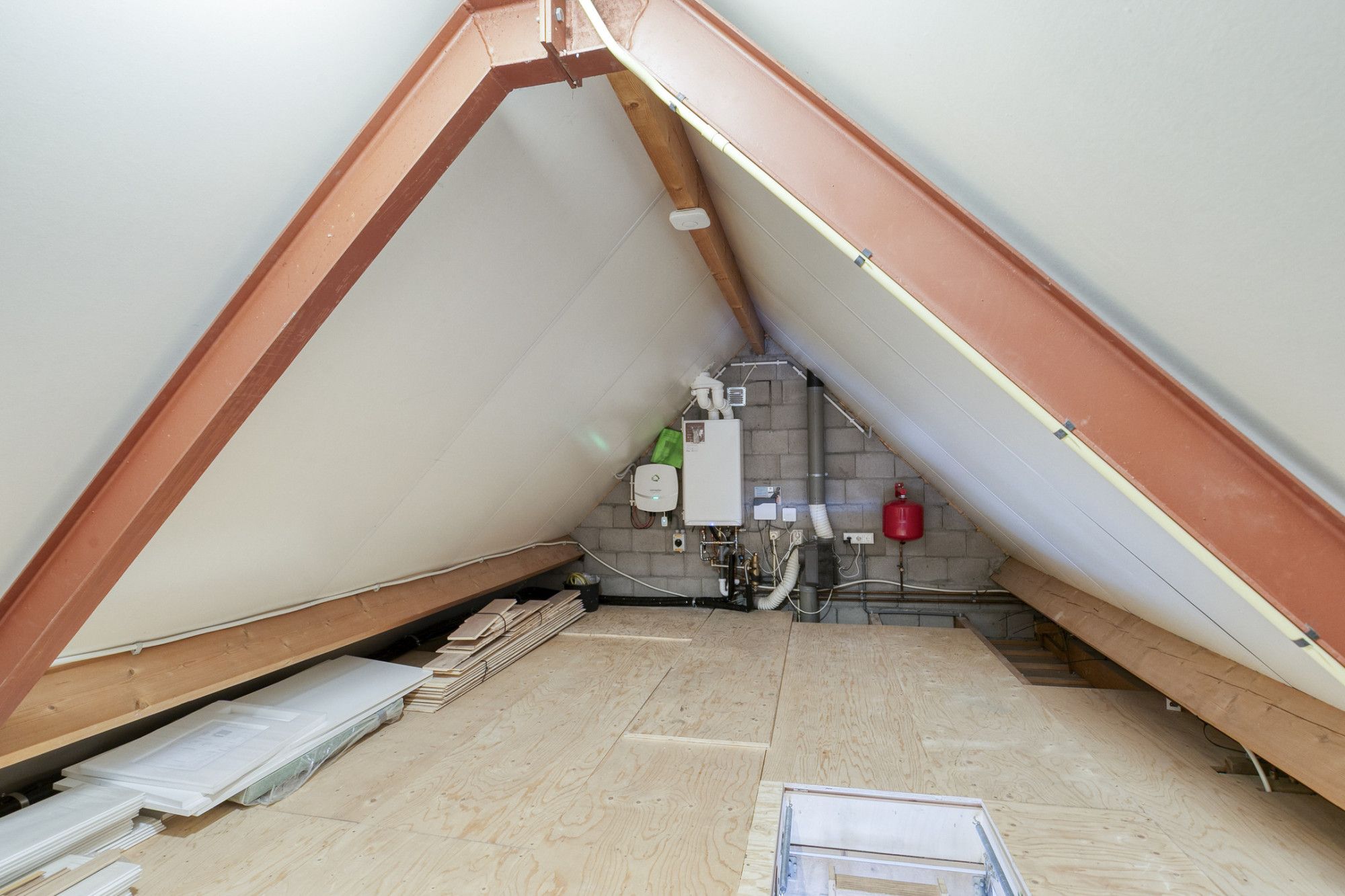 Via de vlizotrap op de overloop van de eerste verdieping is de bergzolder bereikbaar. Hier zijn de cv-installatie (Intergas, 2022) en de tweede omvormer (2023) voor 14 zonnepanelen geplaatst.