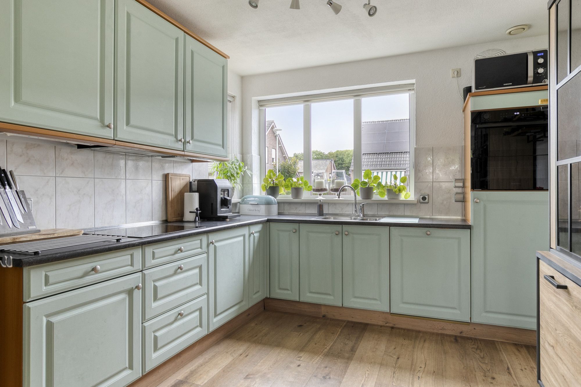 De open keuken heeft een praktische hoekopstelling en is uitgerust met een keramische kookplaat, inbouwvaatwasser (2023), inbouwoven (2024) en een koelkast (2020).
