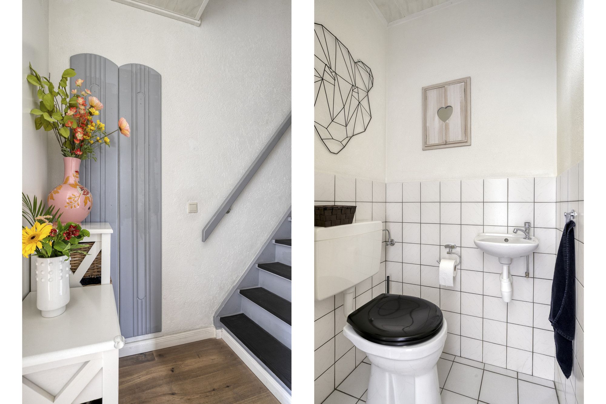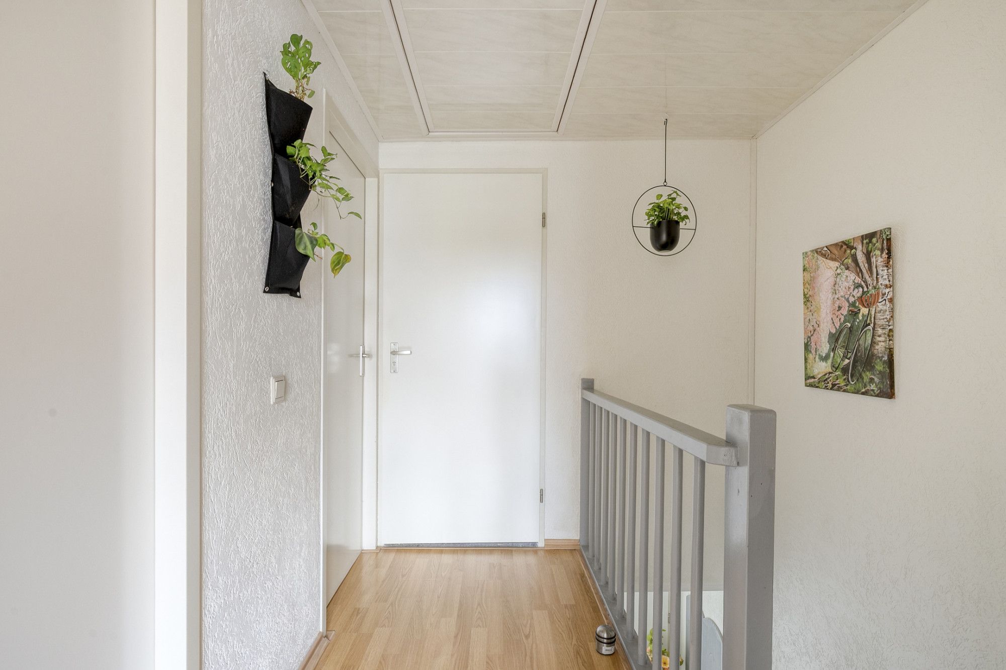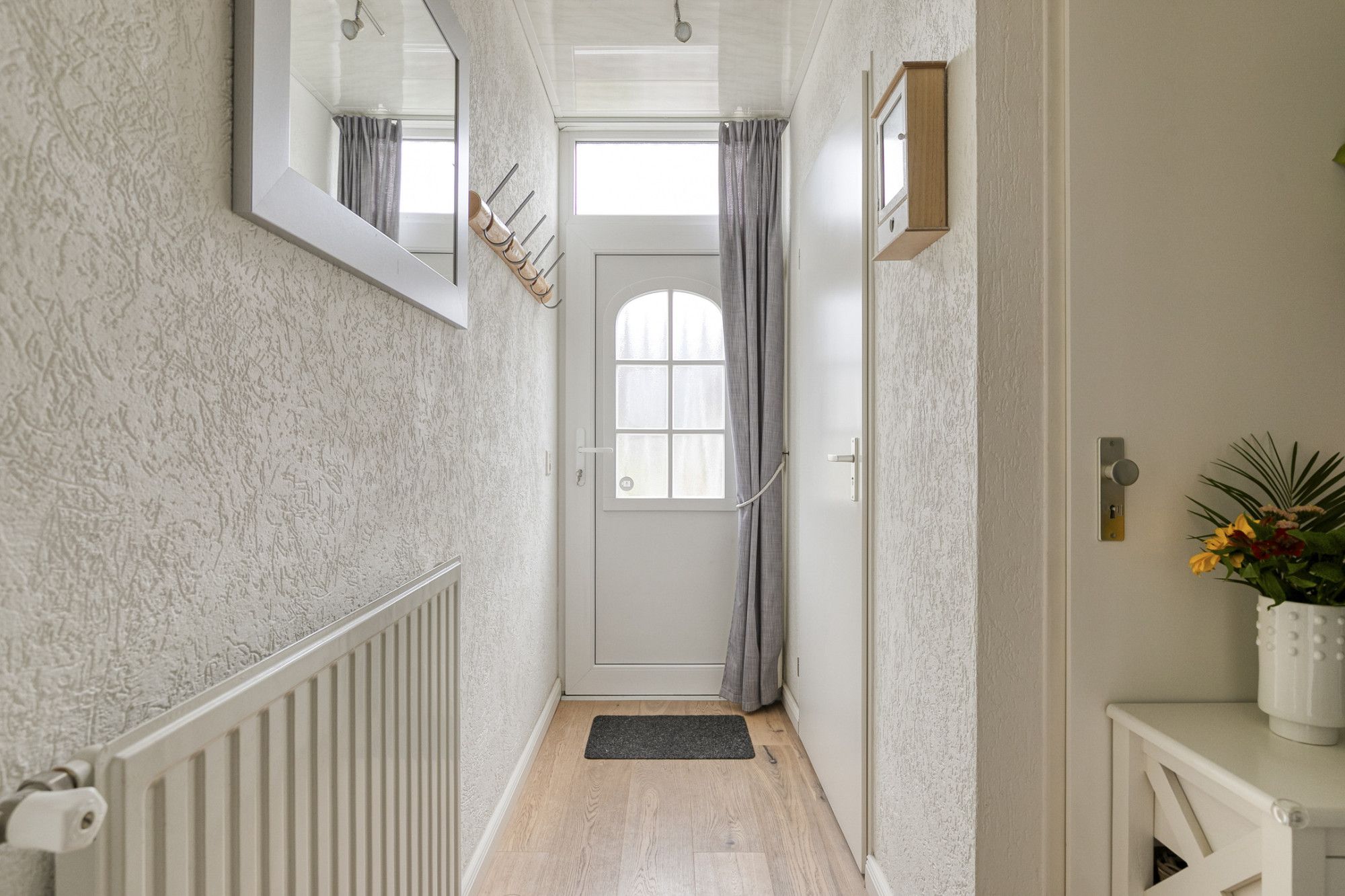 Via de voordeur kom je binnen in de hal, waar zich de vernieuwde meterkast bevindt. Vanuit hier zijn de woonkamer en trap naar de eerste verdieping bereikbaar.