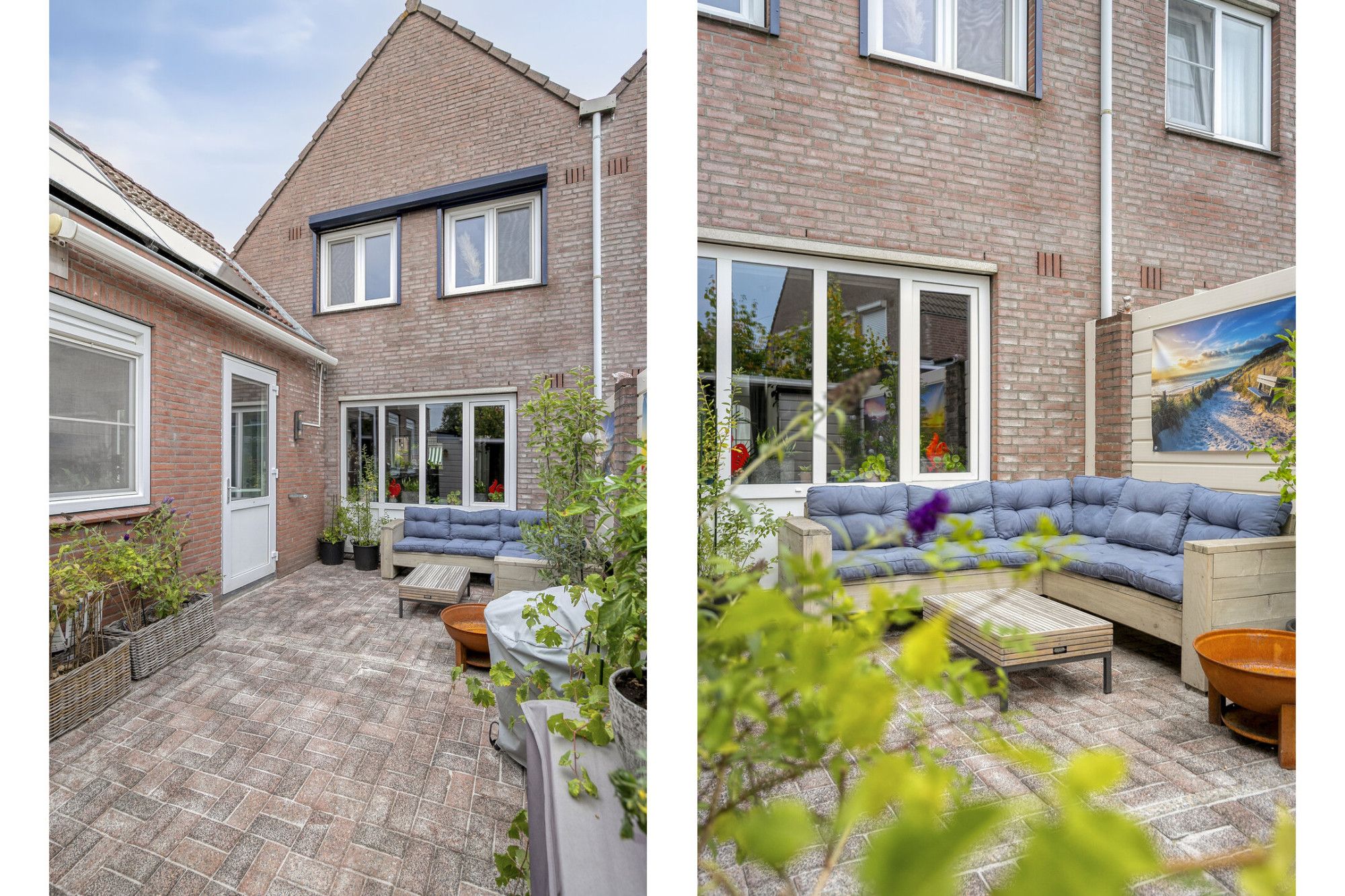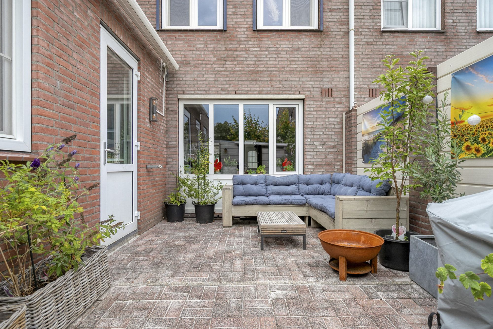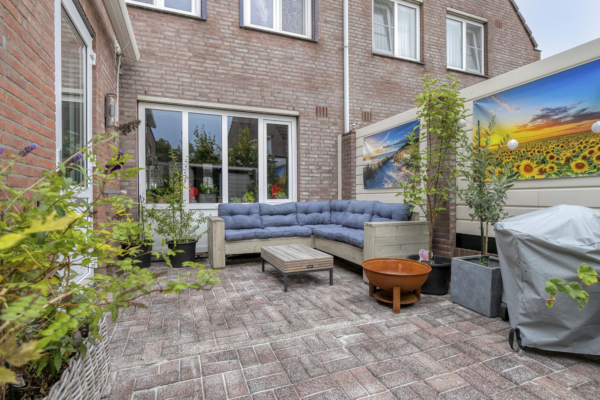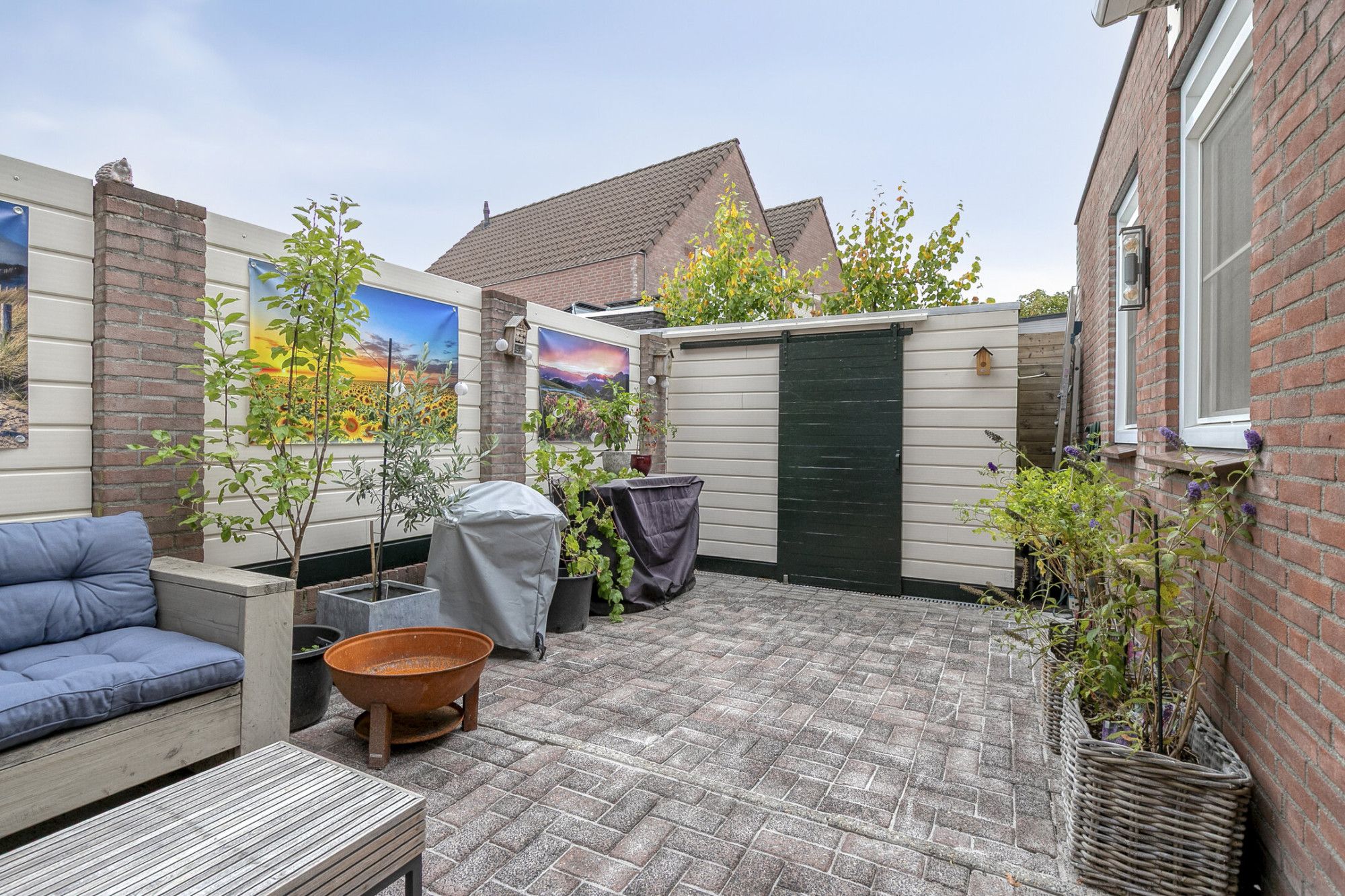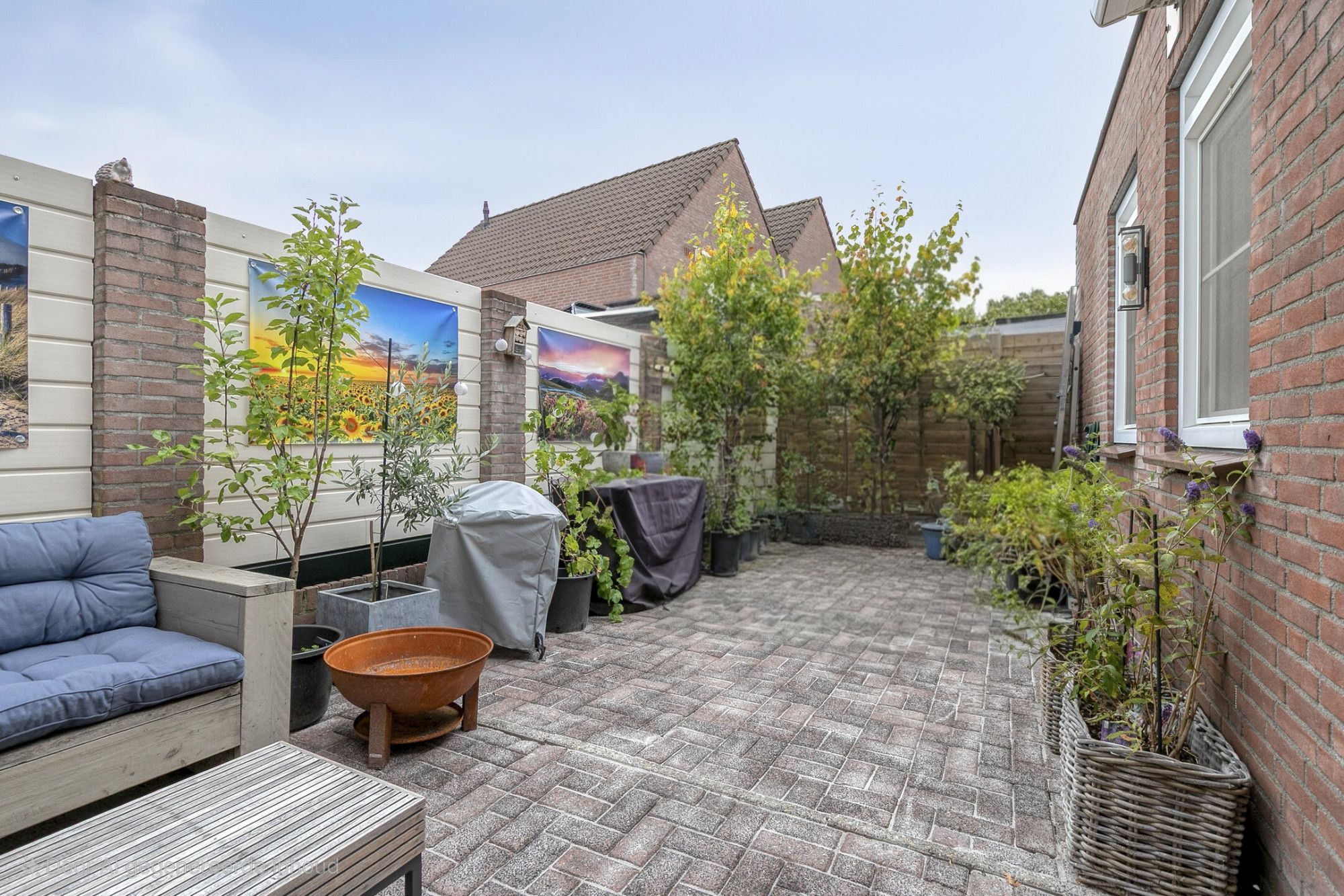De tuin is zoals het gezegde gaat "klein maar fijn" maar toch groot genoeg om heerlijk buiten te zitten en de barbecue aan te steken. De tuin ligt op het zuidwesten, waardoor je van de zon kunt genieten vanaf de late ochtend tot in de namiddag. Bovendien is de tuin voorzien van een zonneluifel. In de tuin staat een houten berging. Op 1 van de tuinfoto's is een impressie gemaakt hoe de tuin eruit zou zien als de berging wordt verwijderd. Voor de ruimte hoeft u deze namelijk niet te houden want bergruimte is er volop in de woning zelf. Aan de voorzijde van de woning bevindt zich een oprit met parkeergelegenheid voor twee auto’s en een afsluitbaar hek.