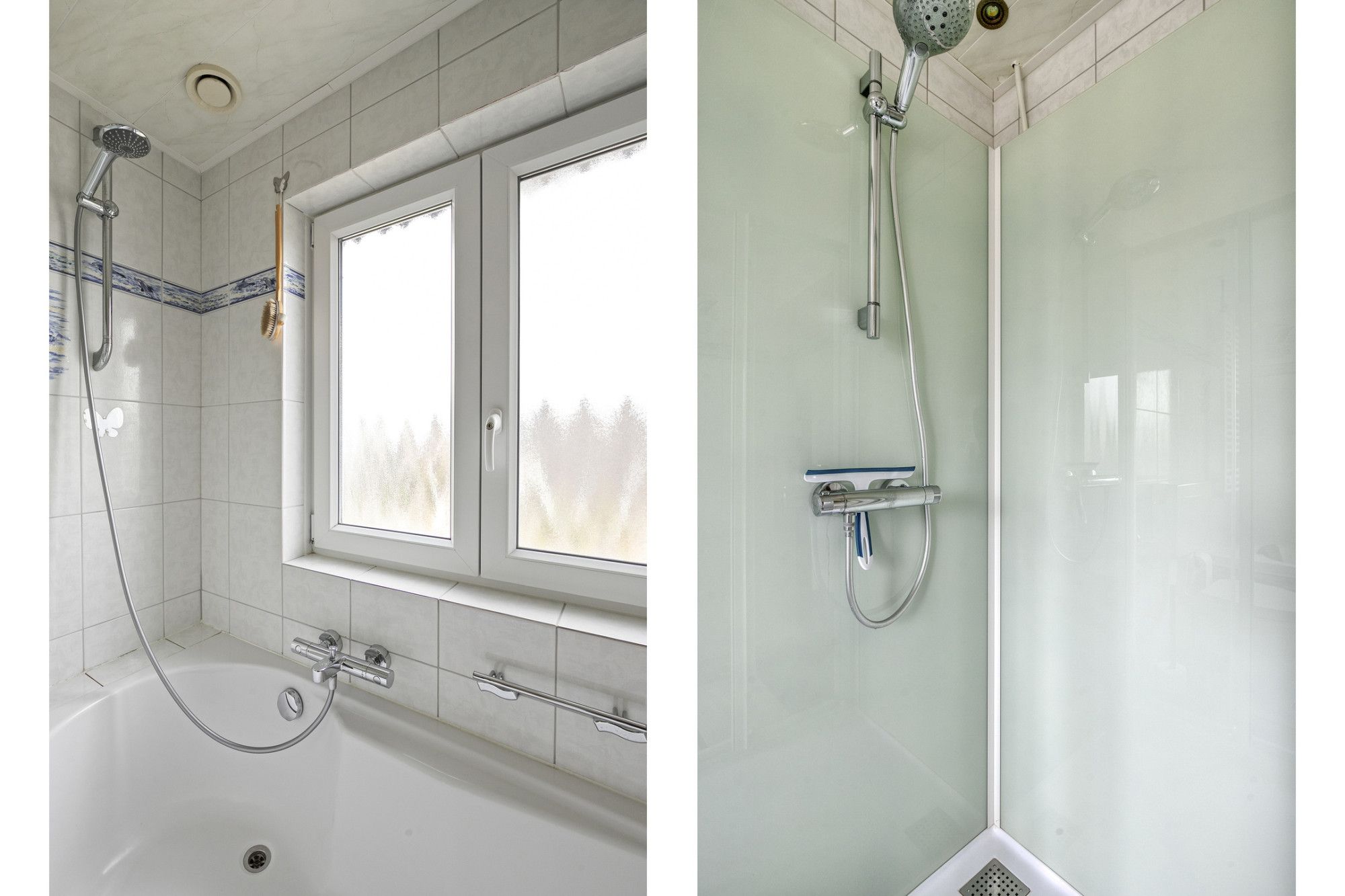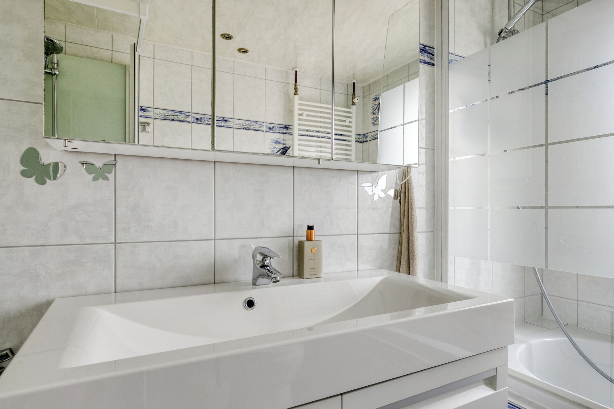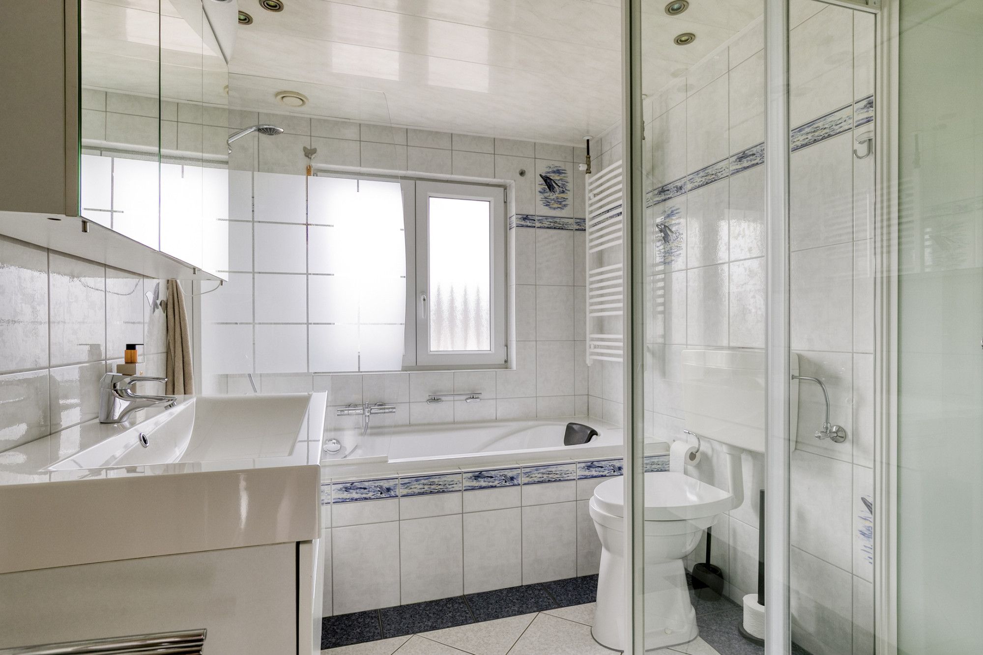 De badkamer is volledig betegeld en ingericht met een wastafelmeubel, douche/bad combinatie, aparte douchecabine, toilet, mechanische ventilatie, inbouwspots en een designradiator.