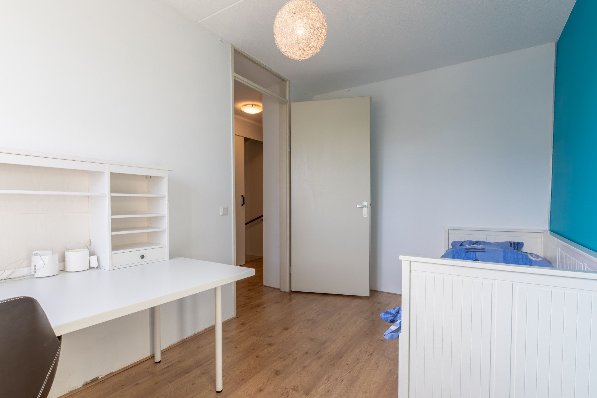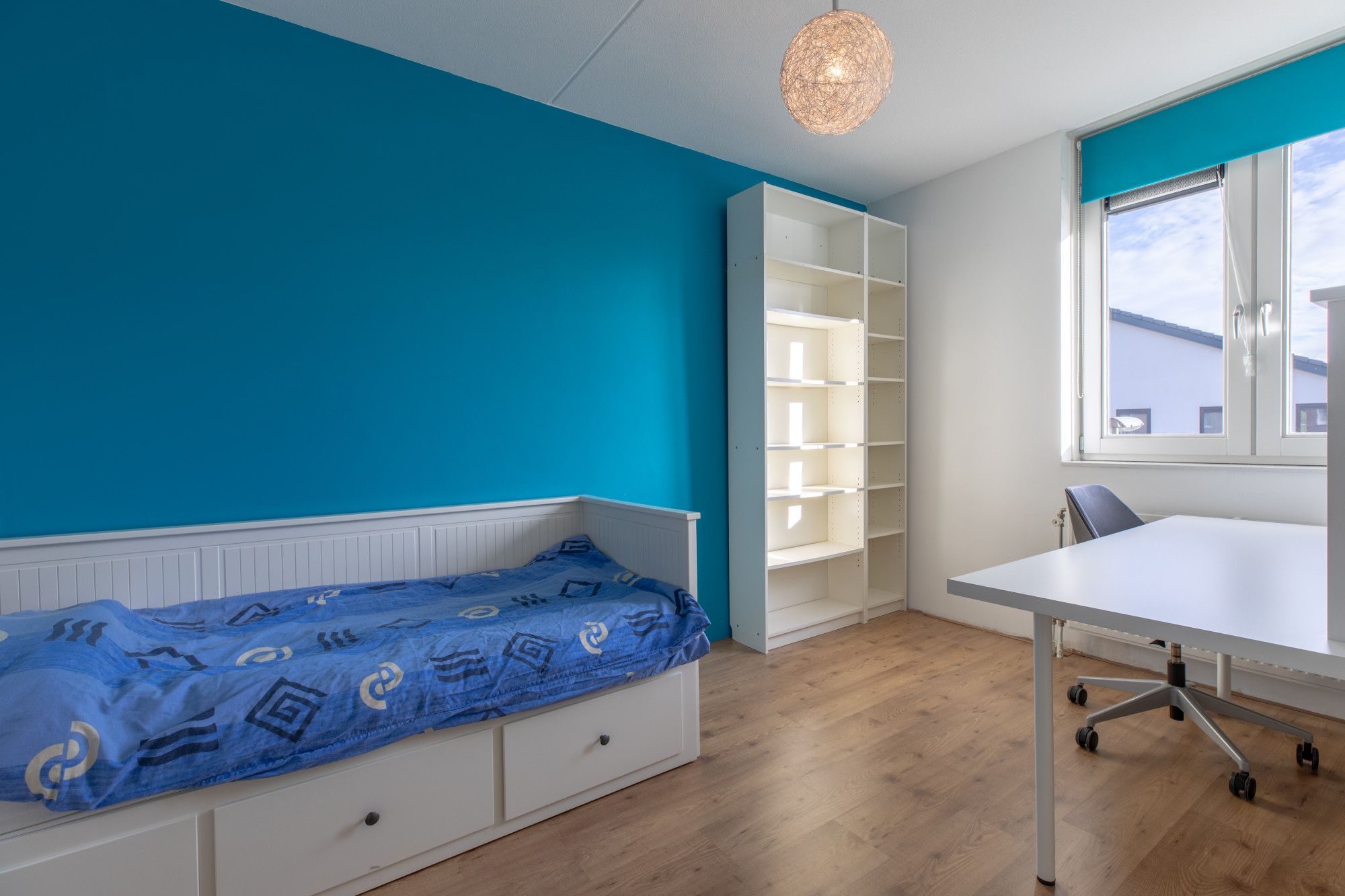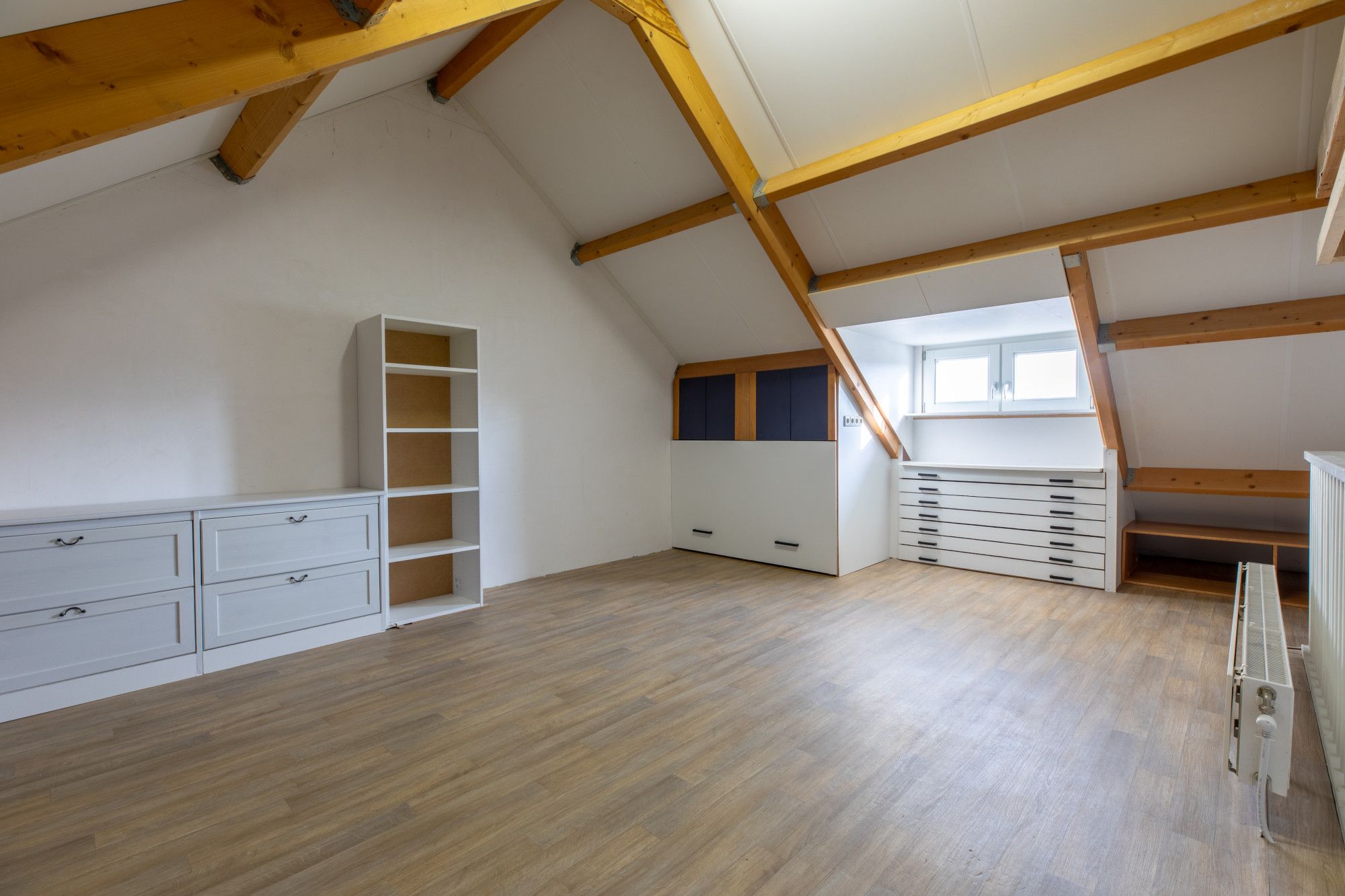 Slaapkamer 3/werkkamer (4.47 x 4.17 m) voorzien van laminaatvloer en een dakkapel.