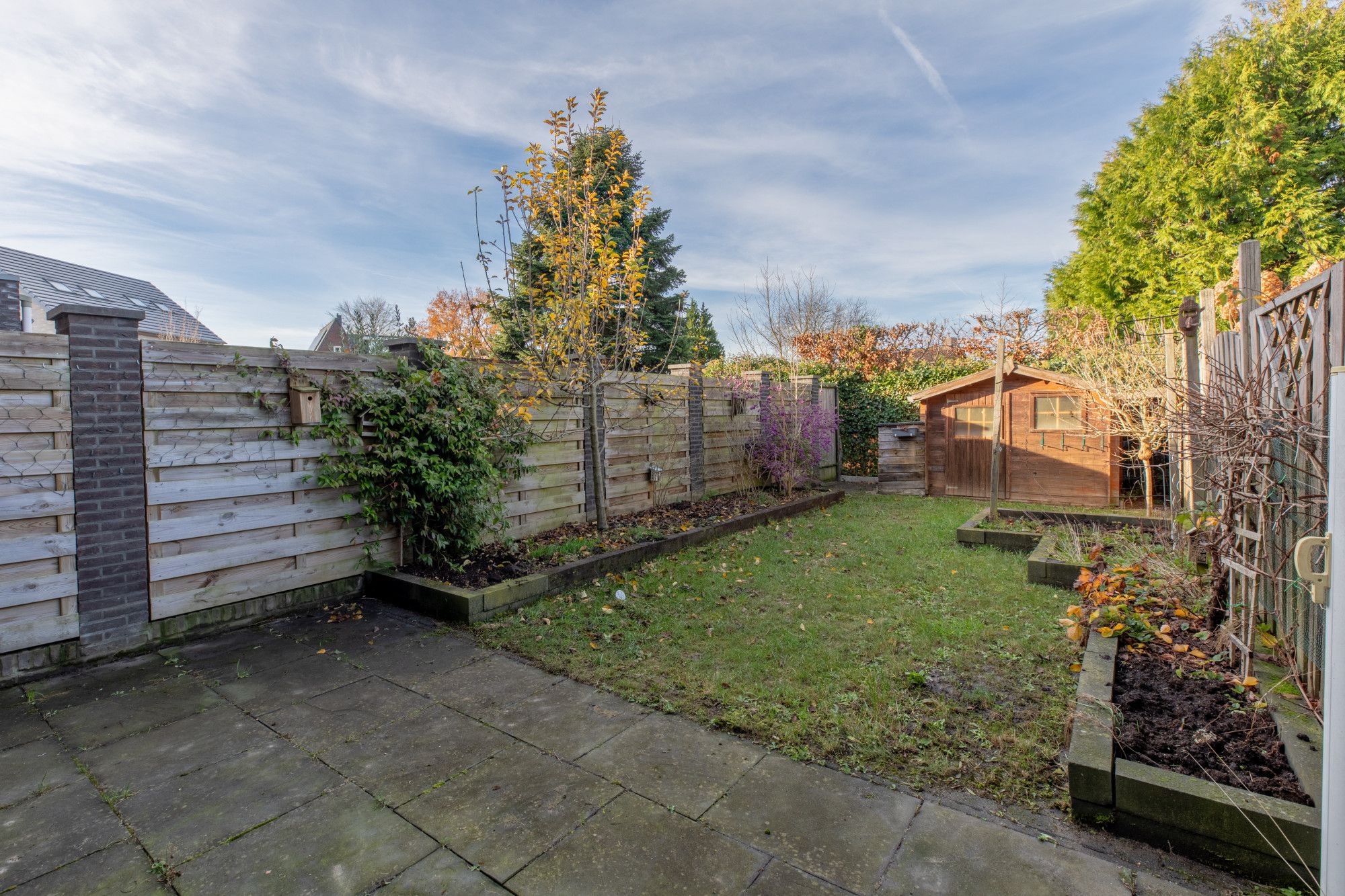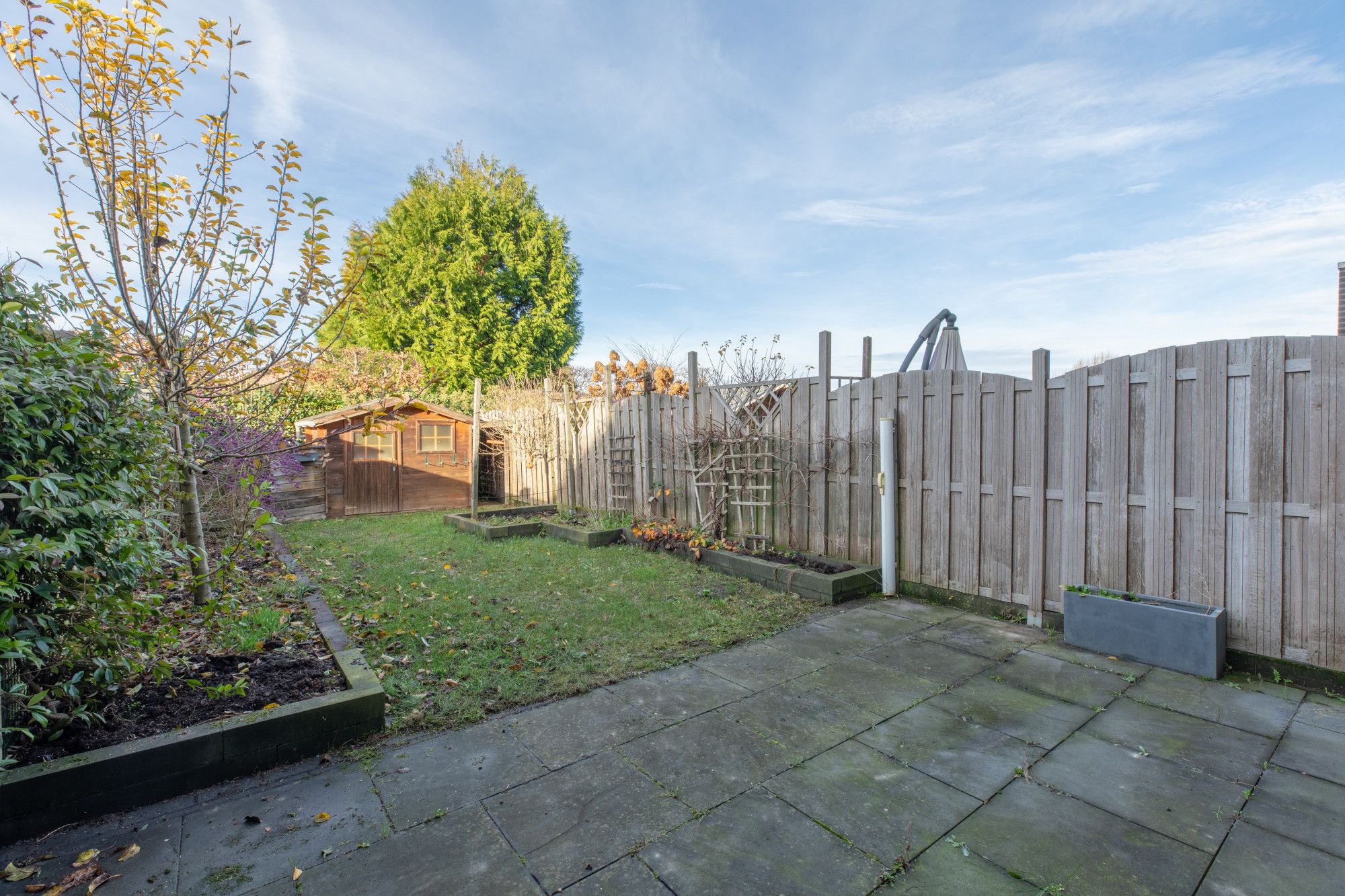 Fijne ruime achtertuin met terras, gazon, achter ingang en houten tuinberging. Het achter gelegen pad is mandelig.