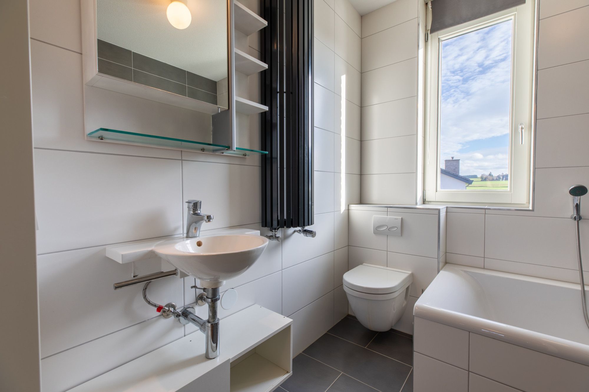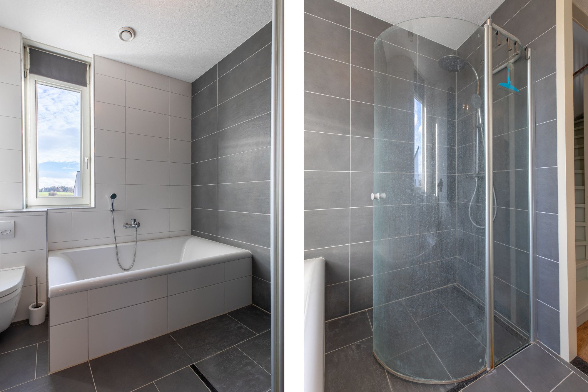 Geheel betegelde badkamer (2.47 x 2.13 m) met inloopdouche, ligbad, vaste wastafel en zwevend toilet.
