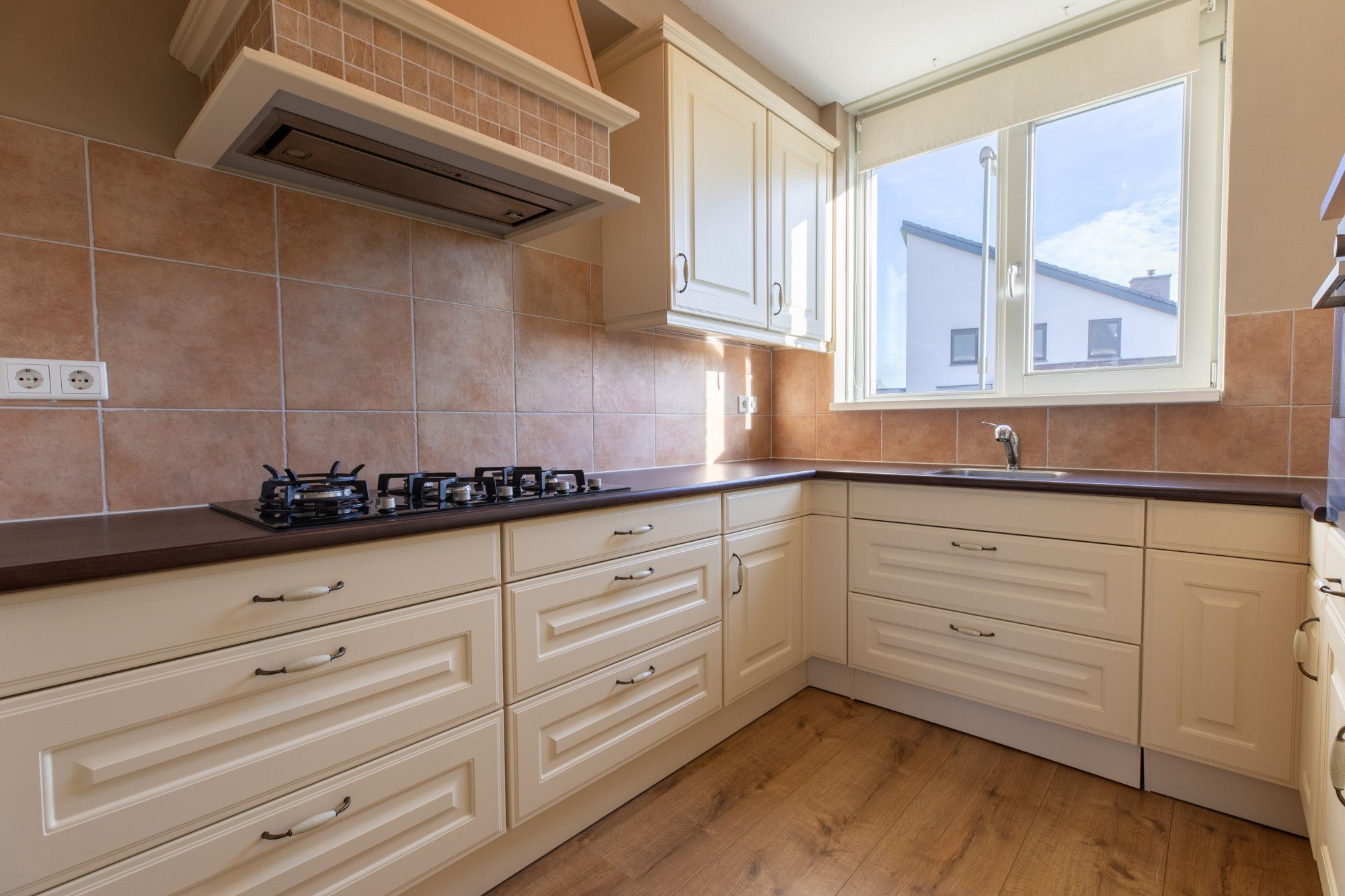 Half open keuken (3.65 x 2.52 m) voorzien van keurige keuken inrichting met diverse handige onder- en wandkasten en inbouwapparatuur te weten: 5 pits gas kookplaat, afzuigkap, combi oven, koelkast en vaatwasser.