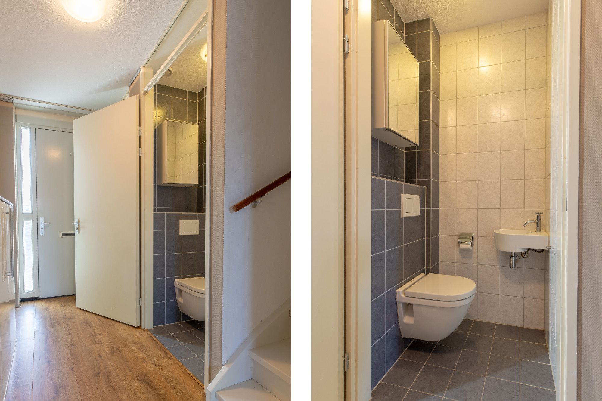 Modern afgewerkte toiletruimte geheel betegeld met zwevend toilet en fontein.