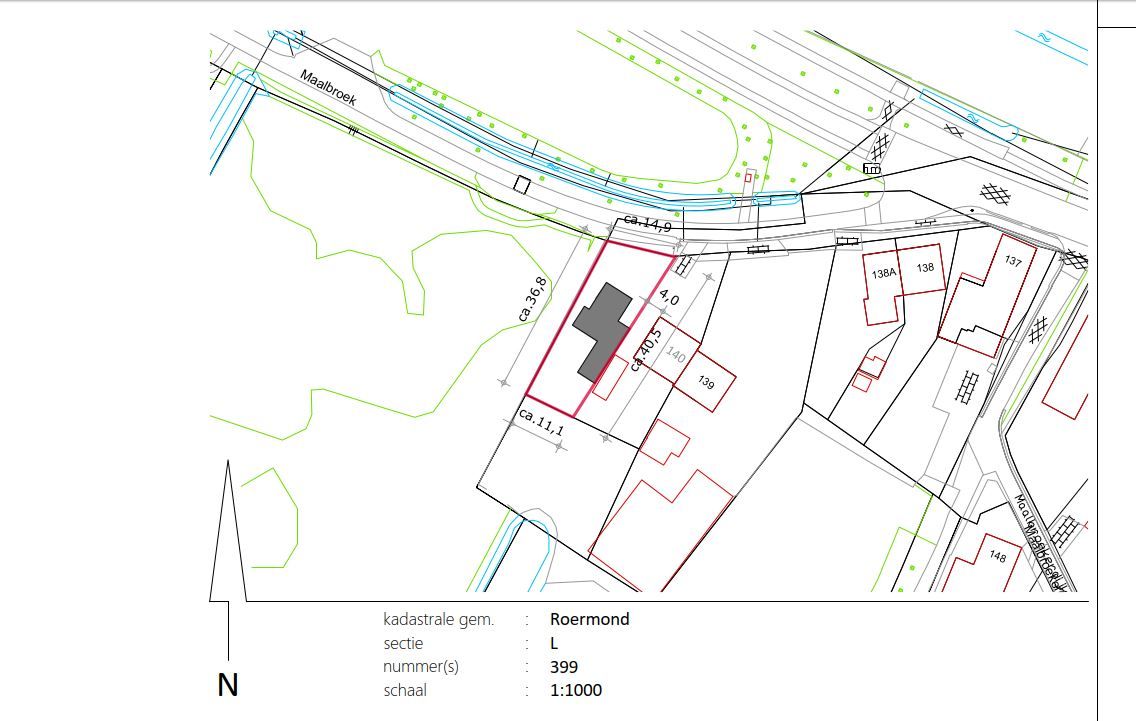 De breedte van het perceel aan de linkerzijde bedraagt ca. 36,8 meter;