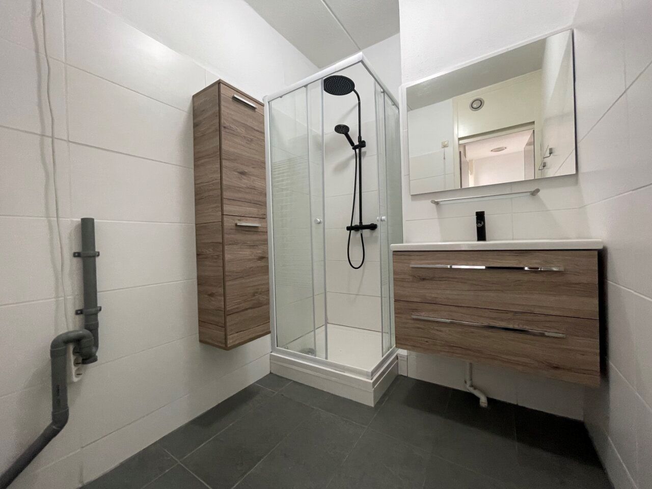 Half betegelde, moderne, badkamer (2,19 x 1,76 m) uitgerust met douchecabine en wastafel met ombouw, alwaar aansluiting wasautomaten.