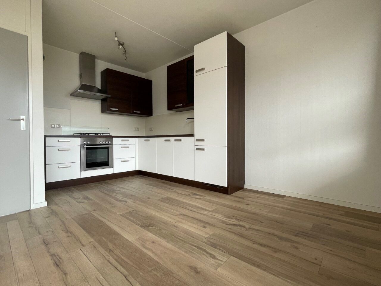 Open keuken (4,77 x 2,16 m) voorzien van pvc vloer en uitgerust met een moderne hoekopstelling met de volgende inbouw apparatuur: koelkast, oven, 4-pits gaskookplaat, afzuigkap en vaatwasser.