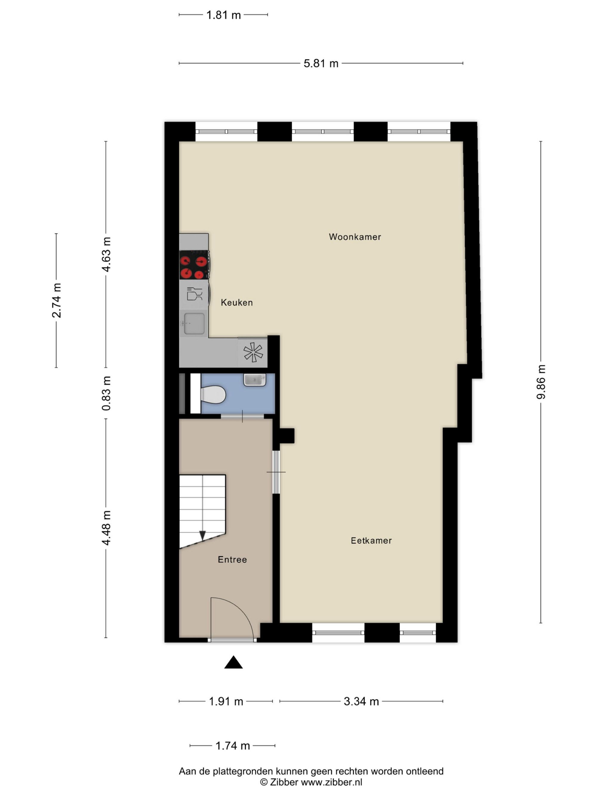 Ruime woon/eetklamer met open keuken (9.86 x 5.61/3.34 m) voorzien van luxe keuken installatie in hoekopstelling met diverse onder- en bovenkasten, inbouwapparatuur te weten: 4-pits keramische kookplaat, afzuigkap, vaatwasser, oven, koelkast en vriesvak.