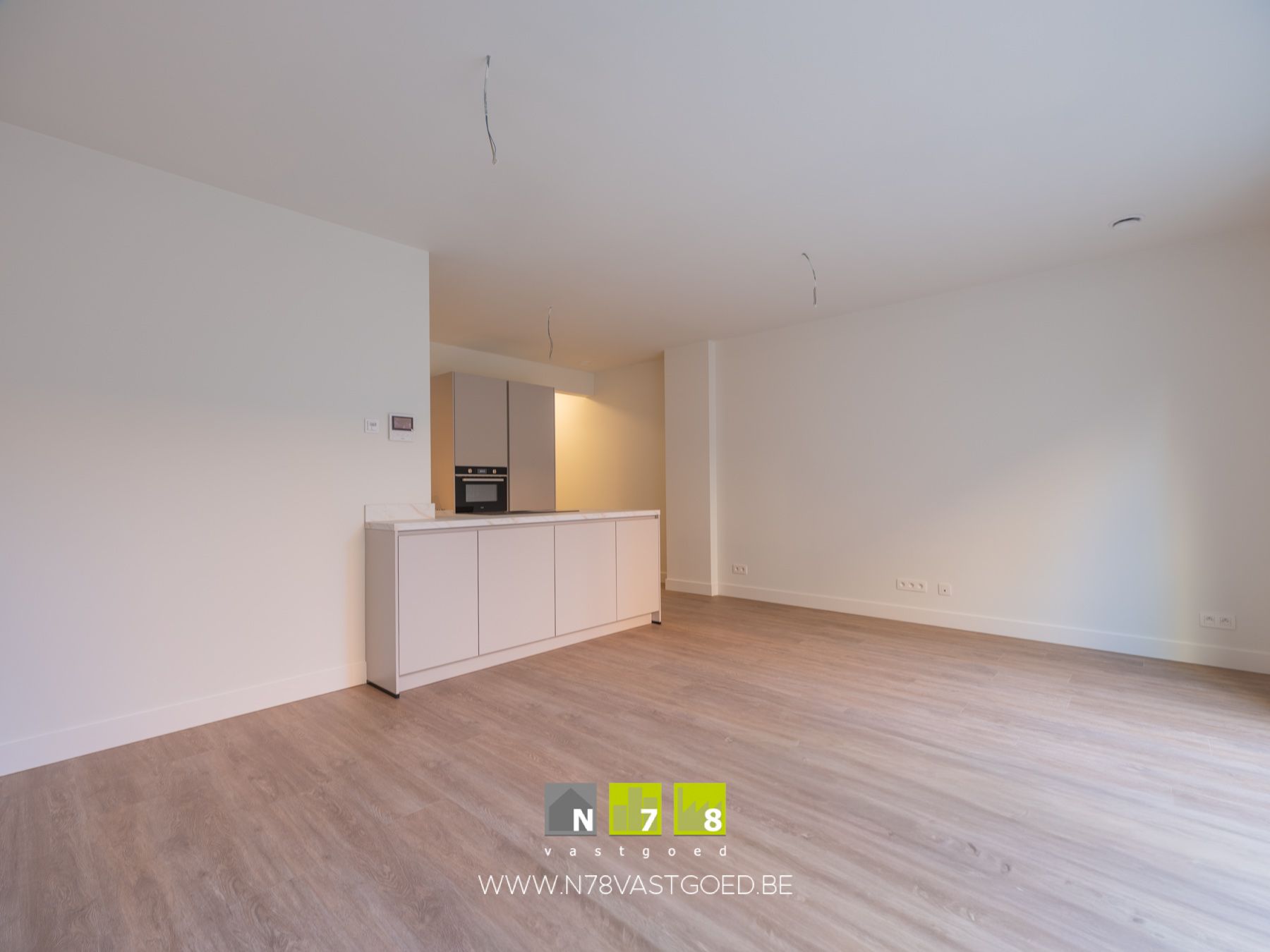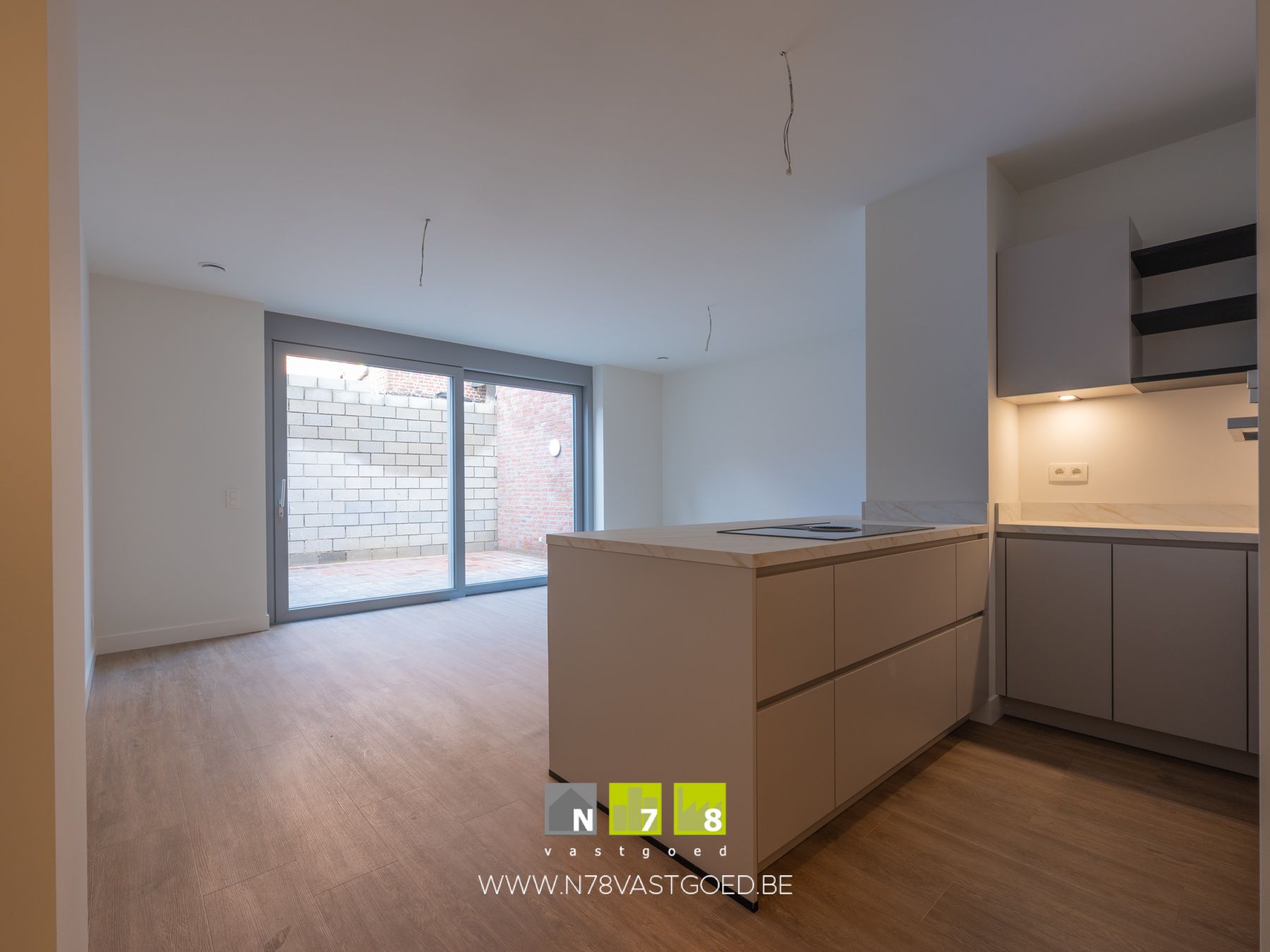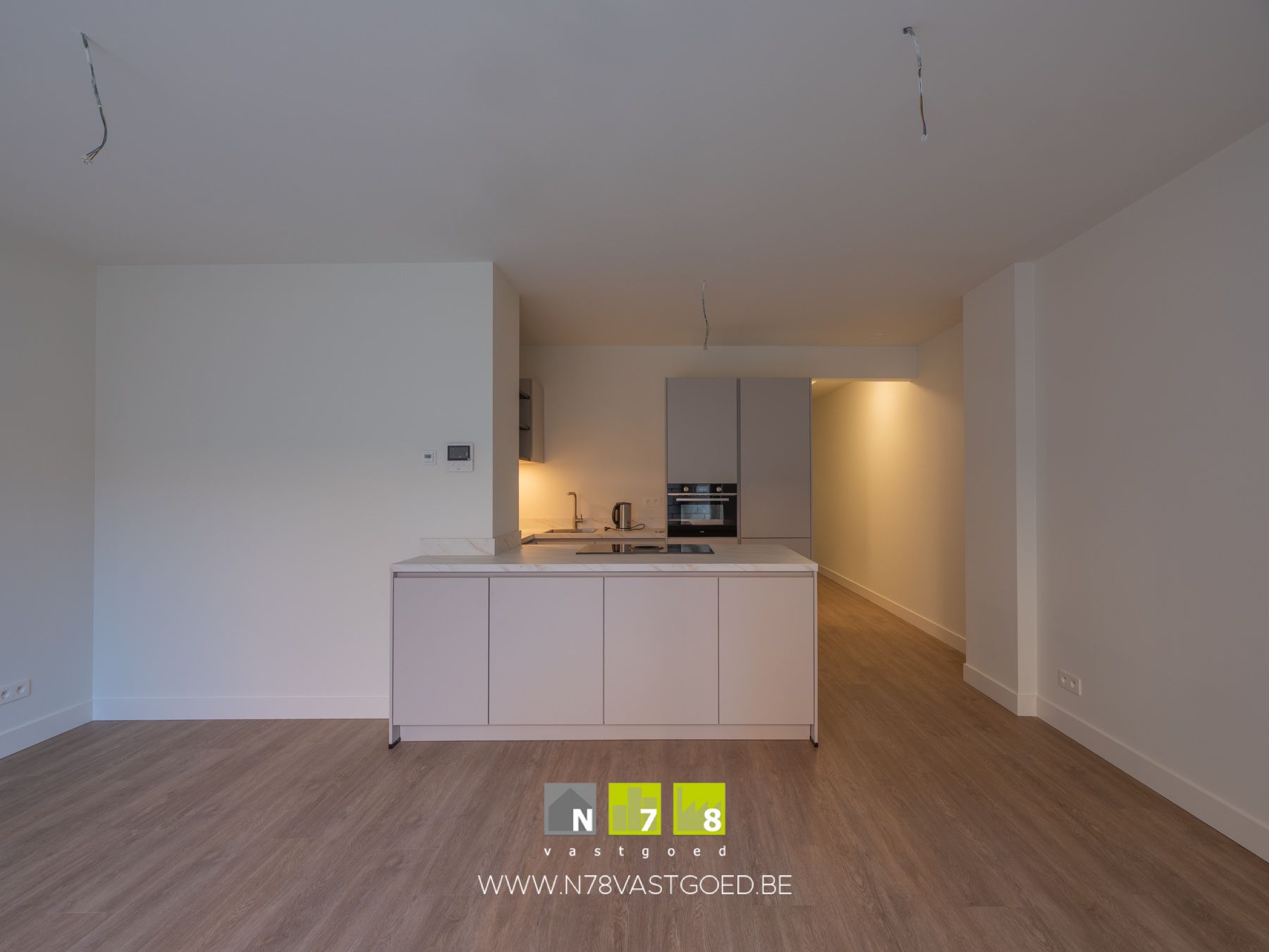 - Keuken (7,6m²): ingerichte keukenwand met onder- en bovenkasten, enkele lavabo, inductiekookplaat met dampkap, combi-oven, vaatwasser, koelkast, diepvries; kookeiland, pvc laminaat.