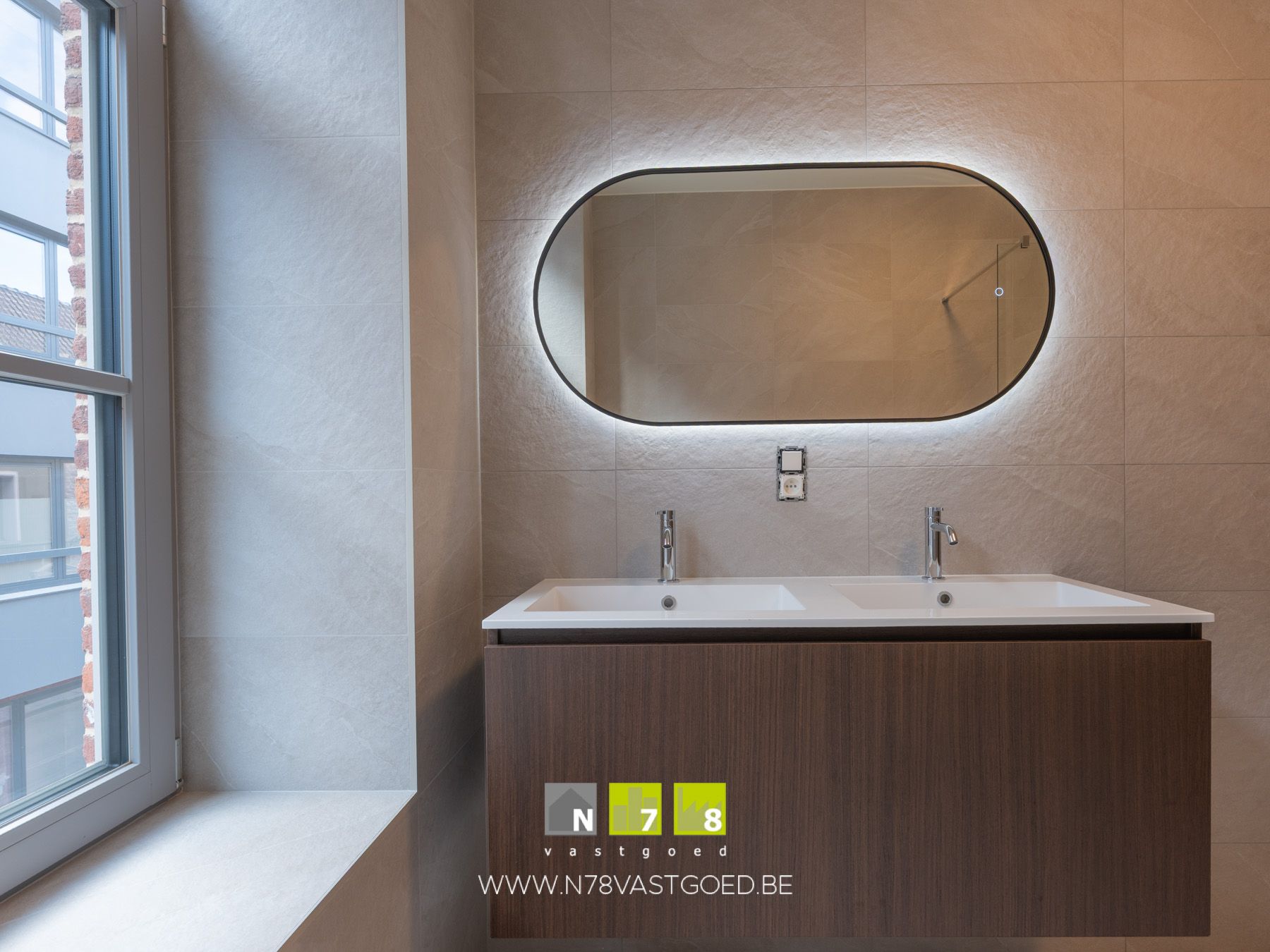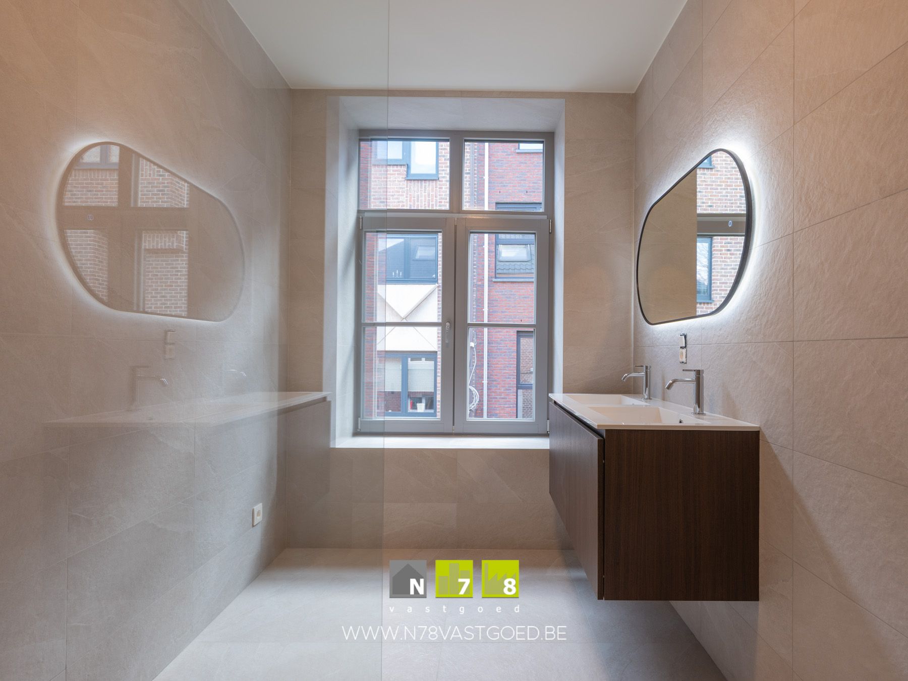 - Badkamer (6,4m²): douche, dubbele lavabo, onderkast, spiegel, wandbetegeling, tegelvloer.