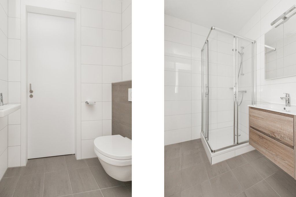 - Volledig betegelde badkamer met douche en wastafelmeubel.