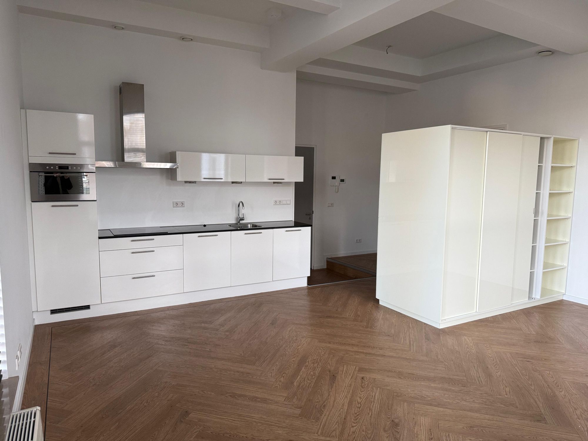 - Moderne hoogglans witte keuken, compleet met inbouwapparatuur: inductiekookplaat, afzuigkap, combi-oven, vaatwasser en koelkast. Lades en deuren zijn voorzien van soft-close waardoor deze geruisloos sluiten.