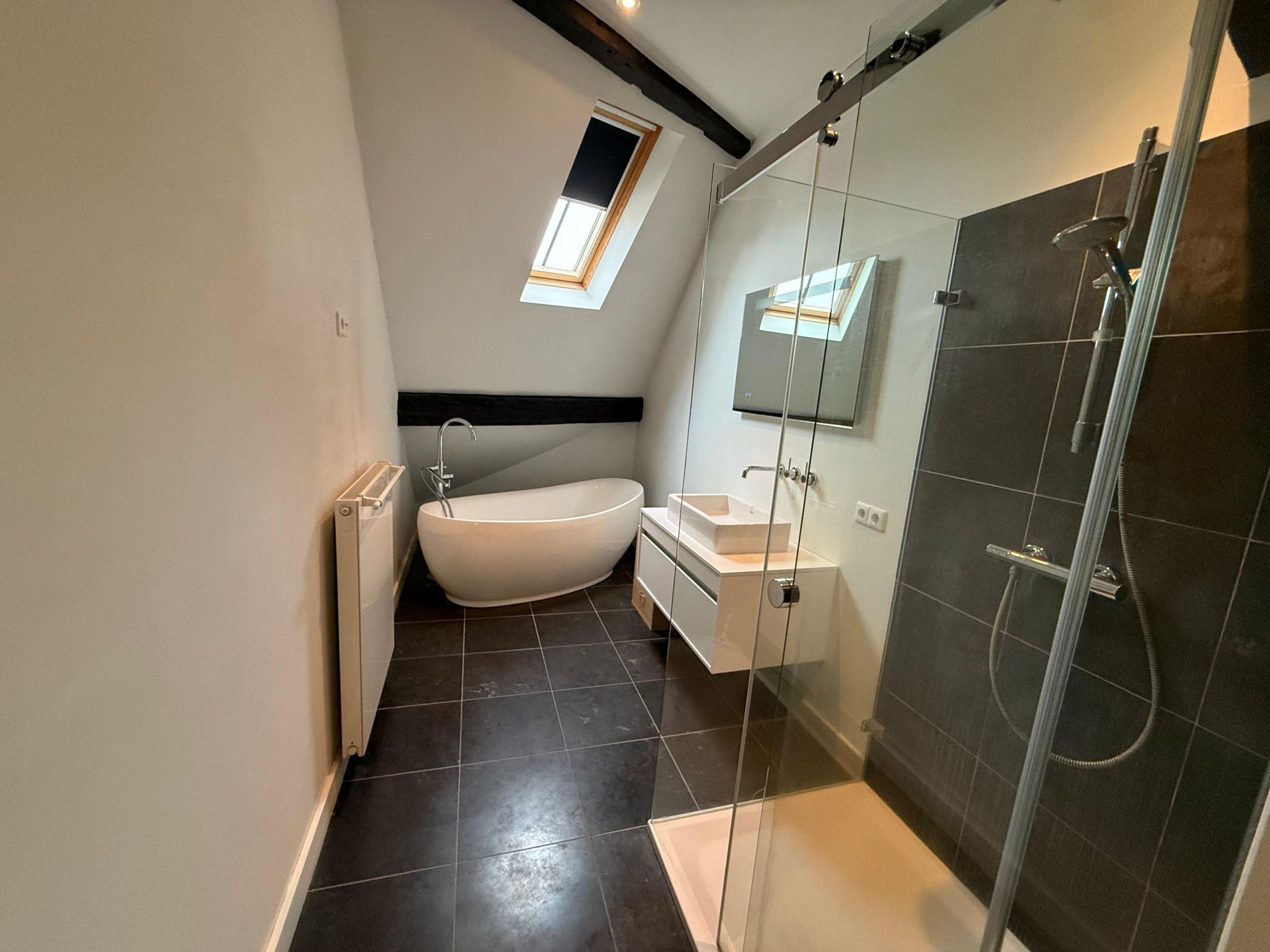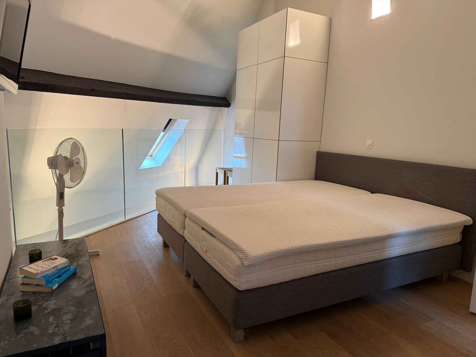 Via een inpandige trap is de vierde verdieping bereikbaar. Hier bevinden zich het slaapvertrek met vide en de luxe badkamer, uitgerust met zowel een ligbad als een separate douche.