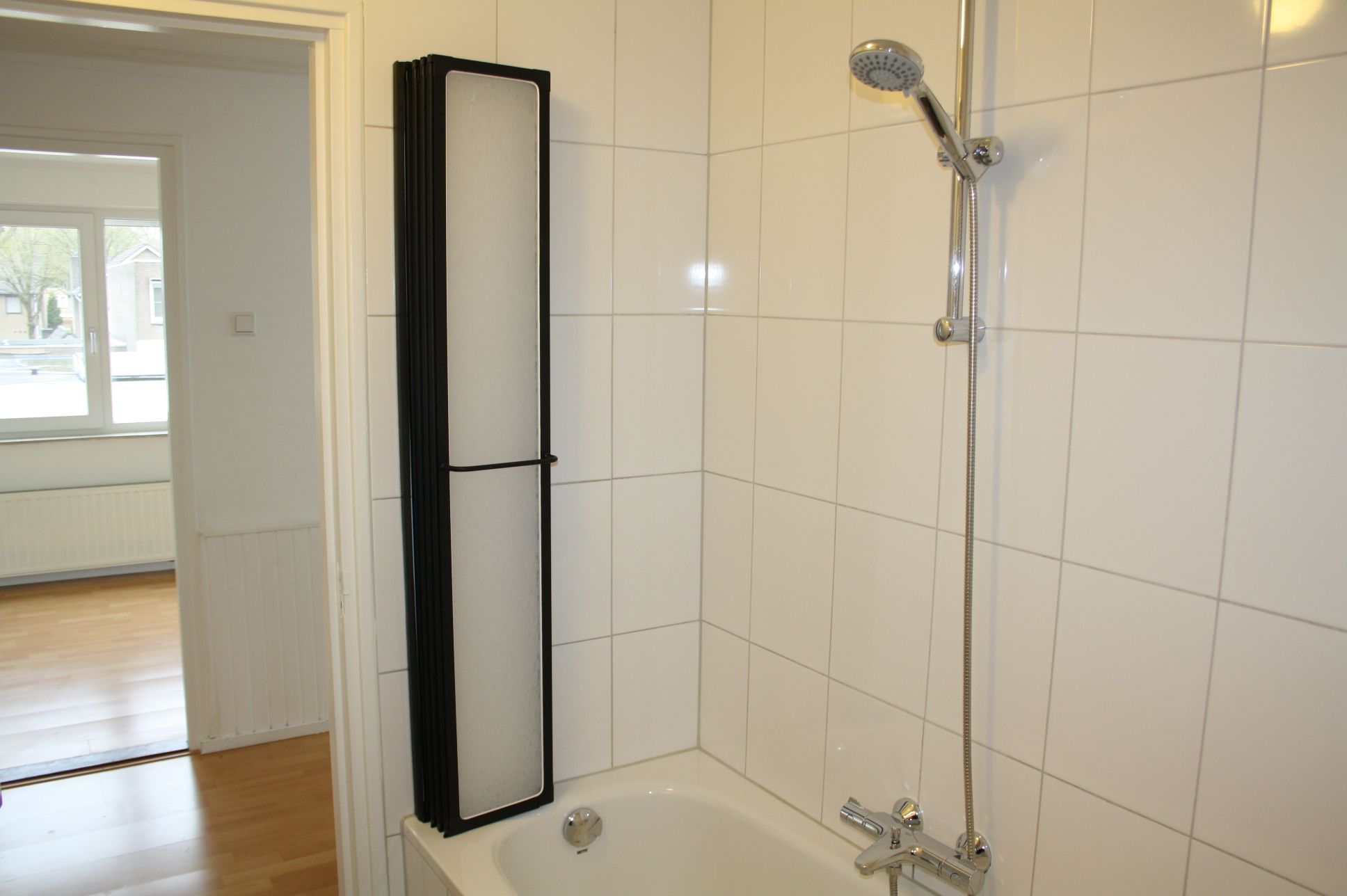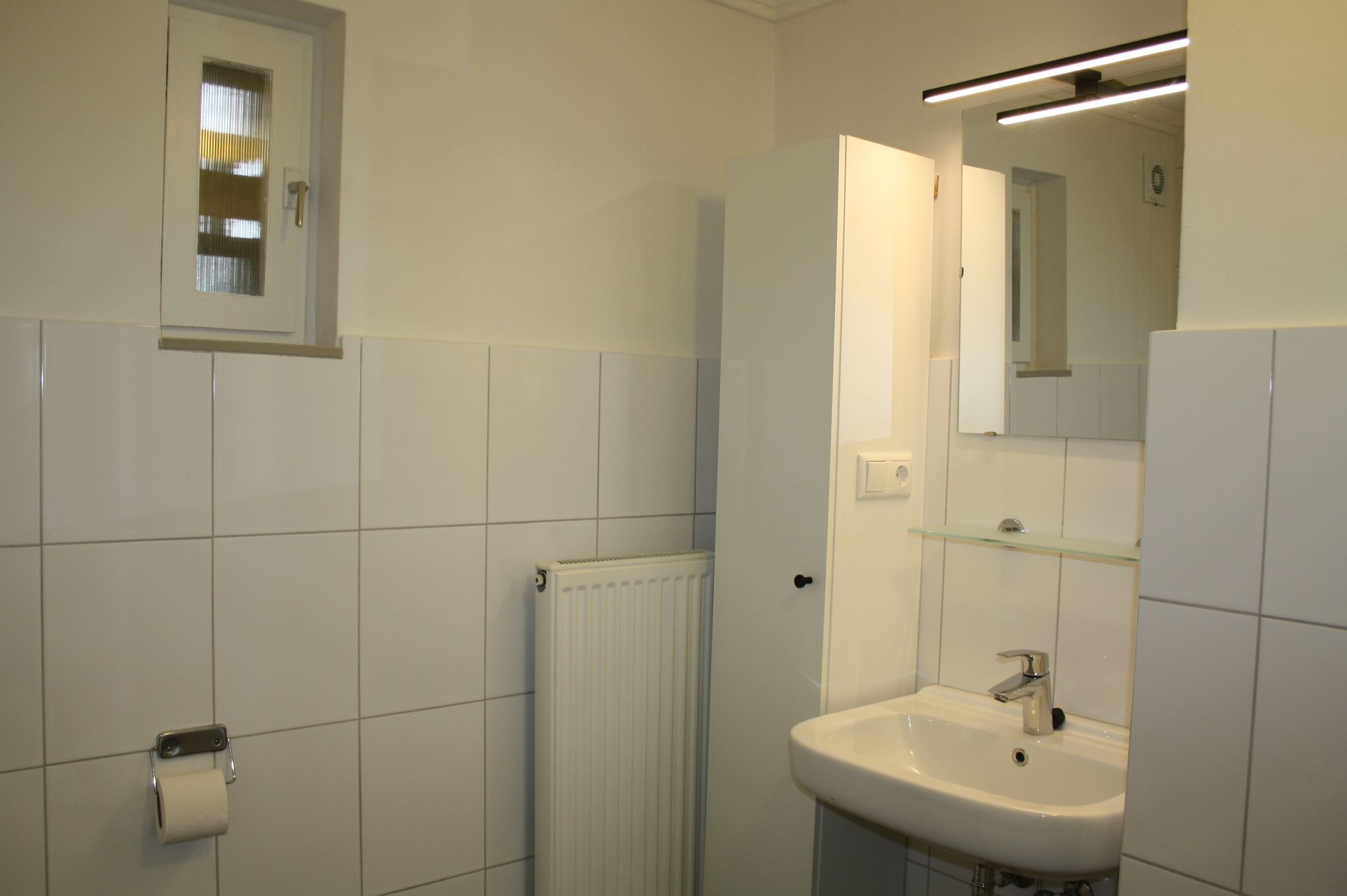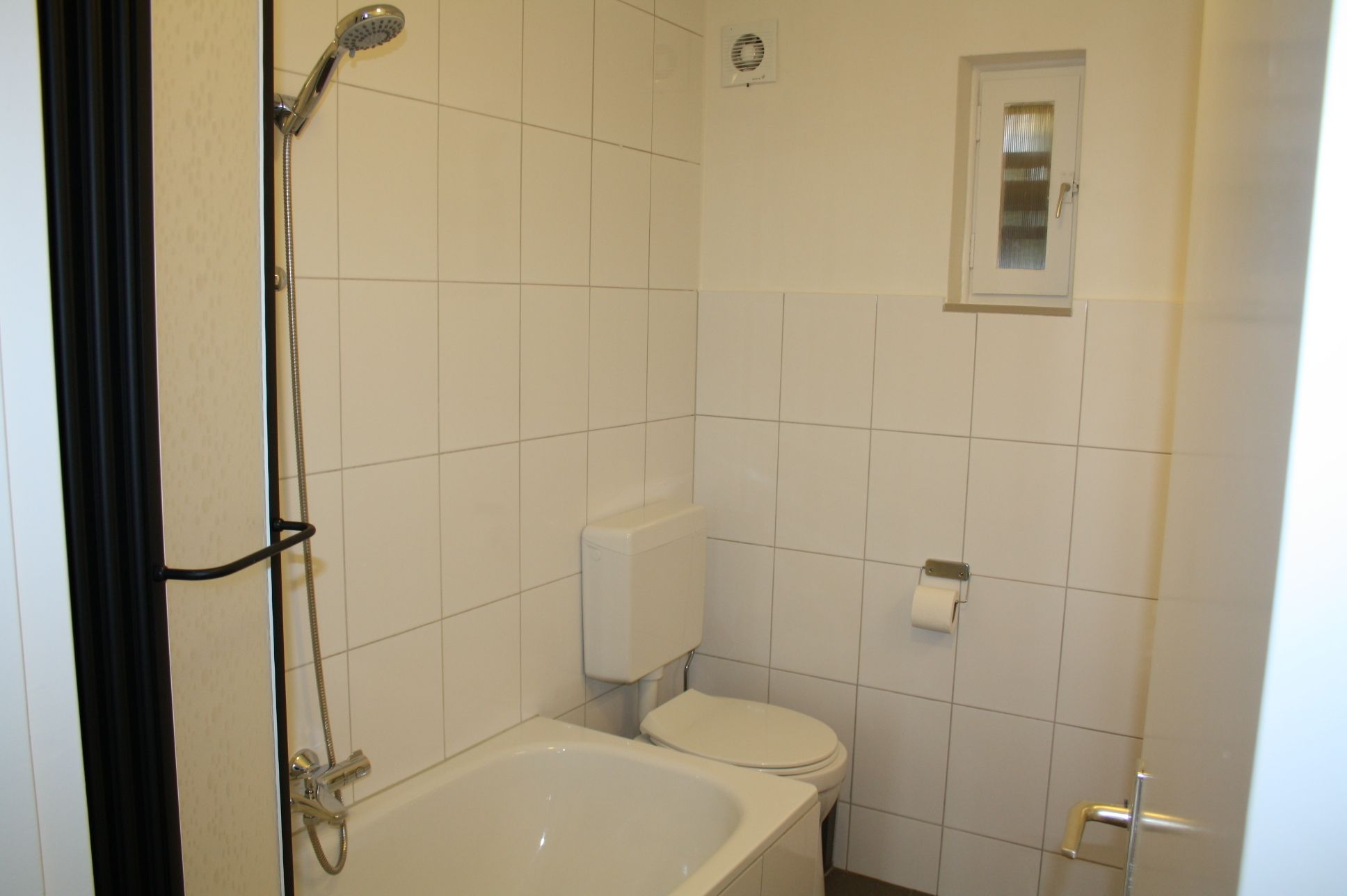 Half hoog betegelde badkamer (circa 4m2) met ligbad, douchescherm, wastafel met badmeubel en 2e toilet.