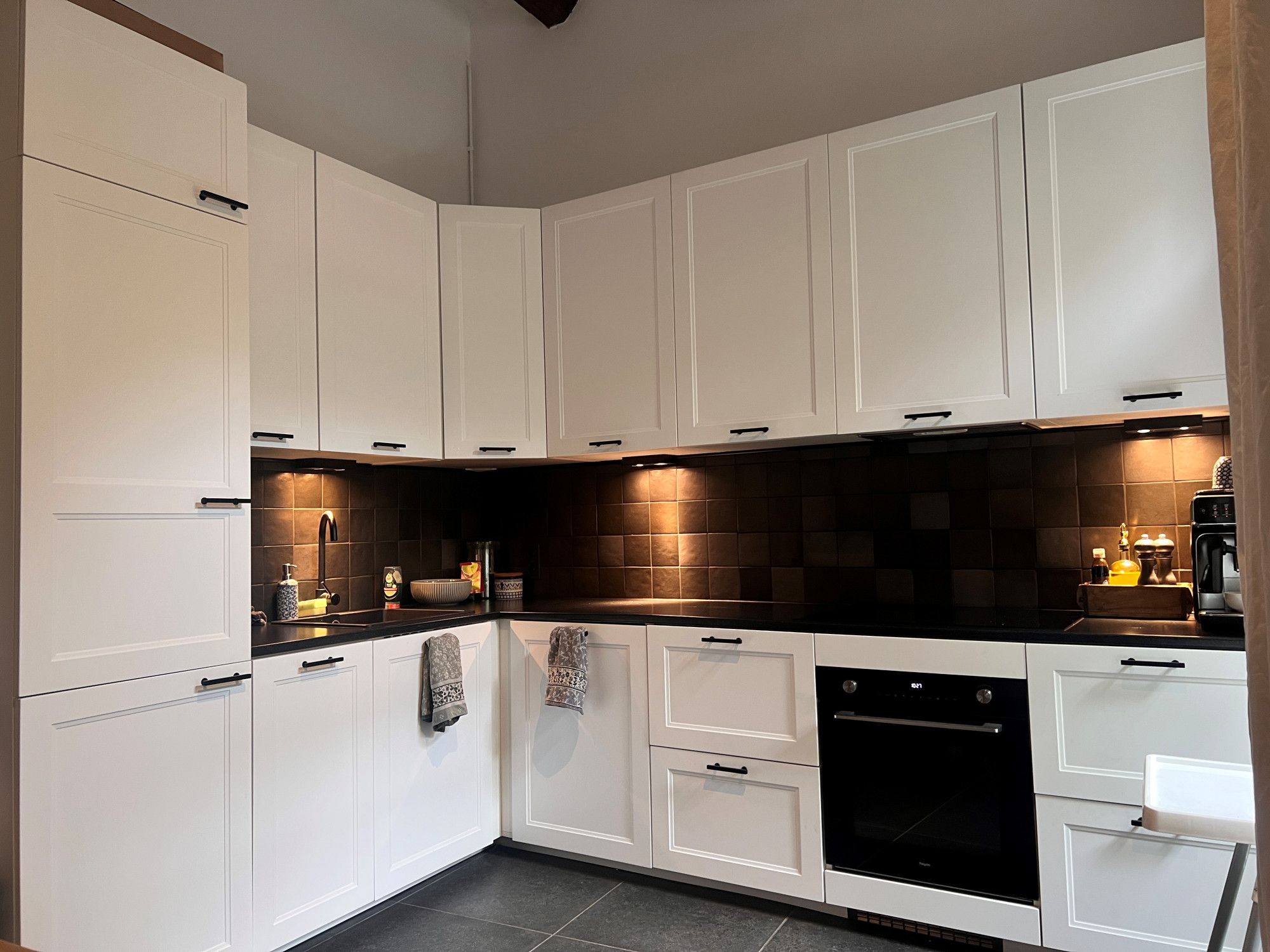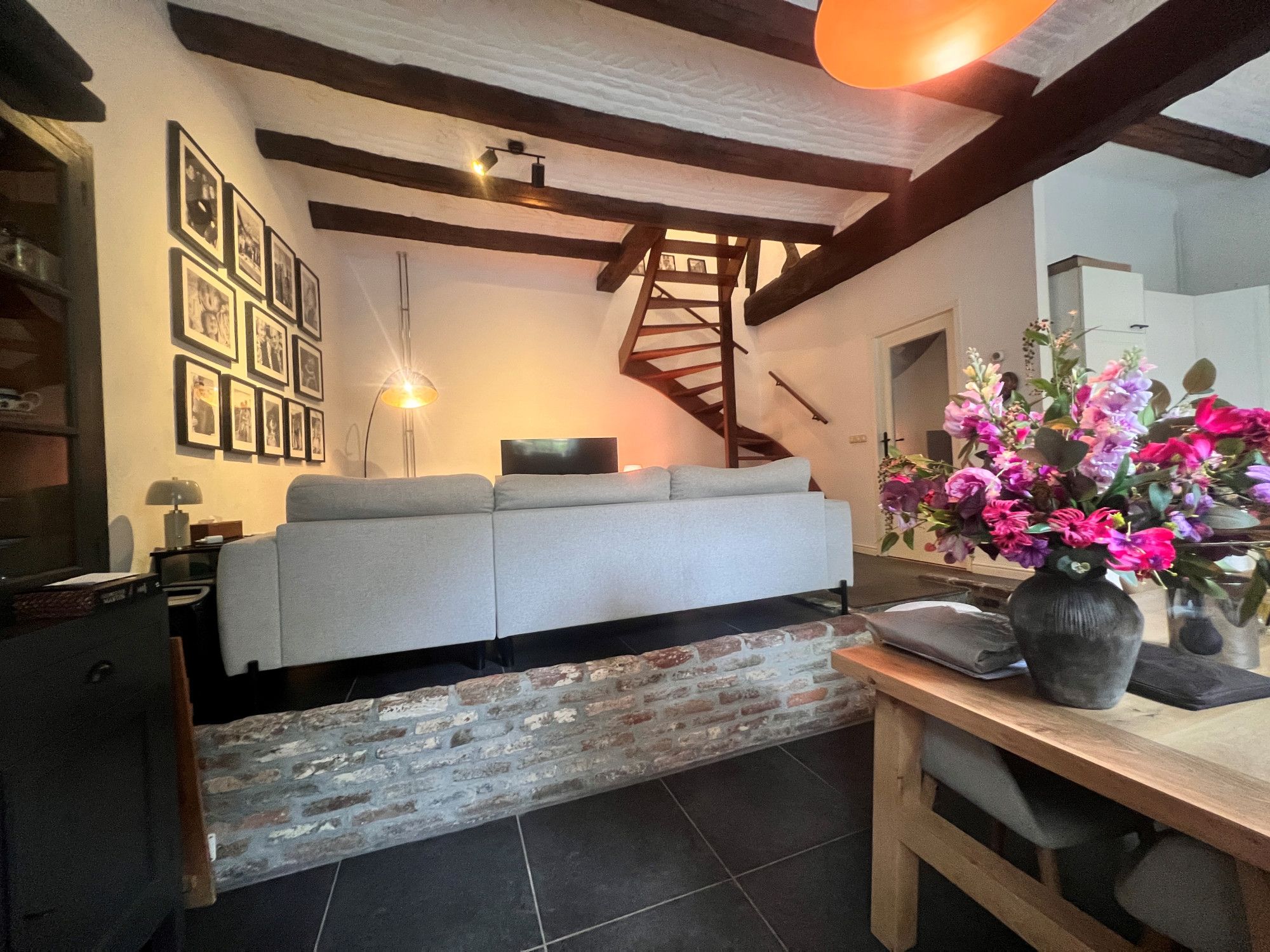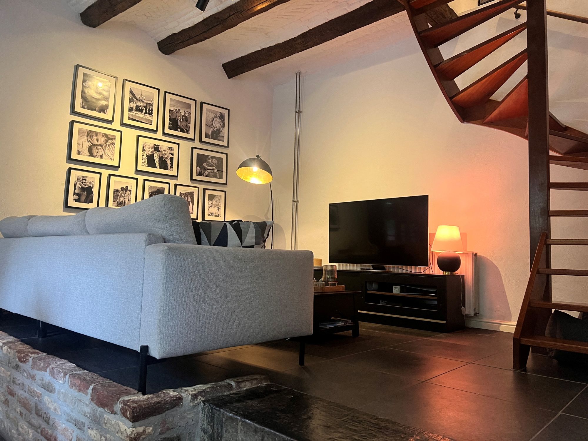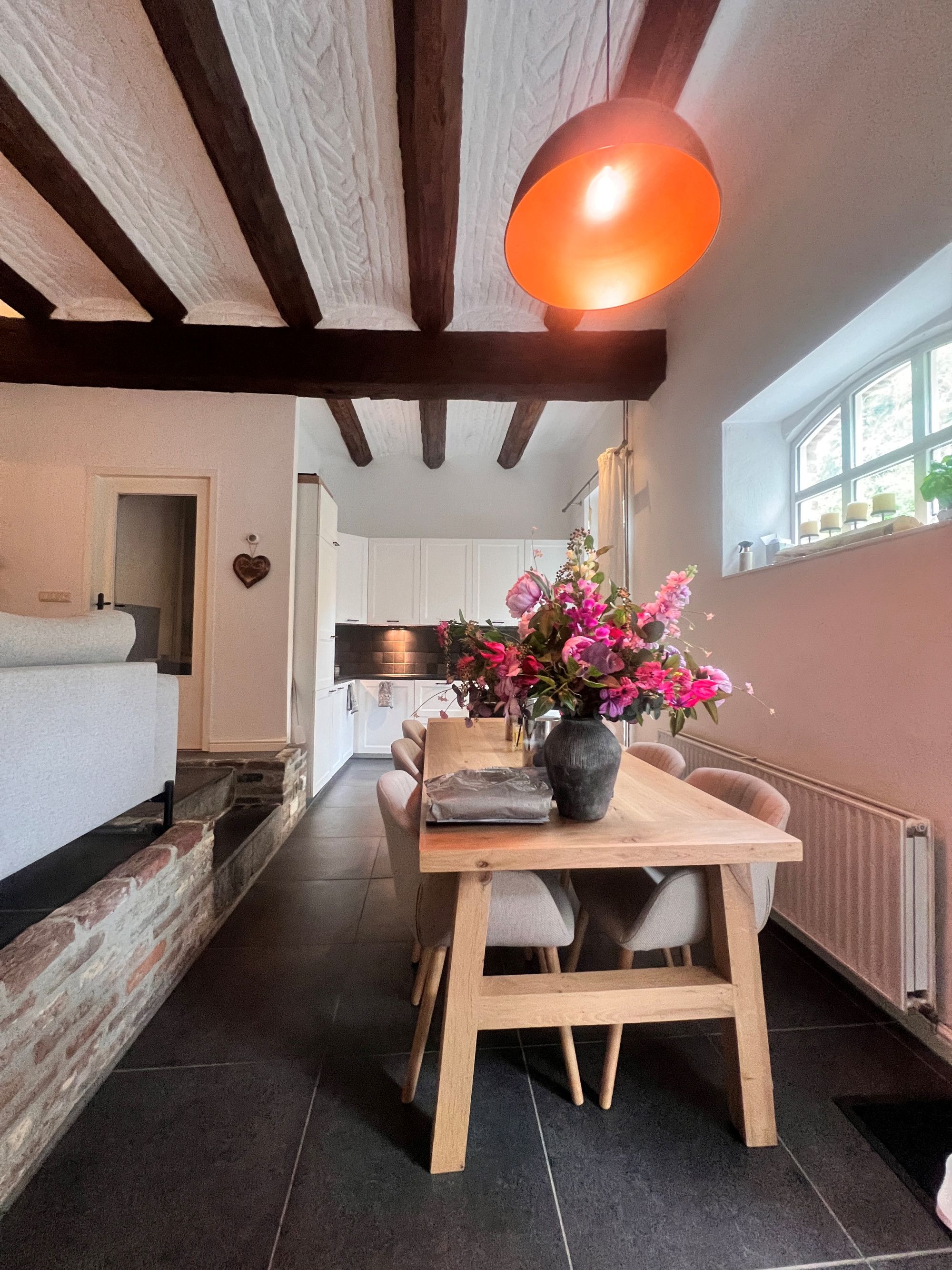 Inkomhal met toegang tot de sfeervolle, speelse woonkamer. De moderne landelijke keuken is voorzien van een koelkast, vaatwasser, combi oven, inductie kookplaat en afzuigkap. Toilet met fontein. Meterkast.