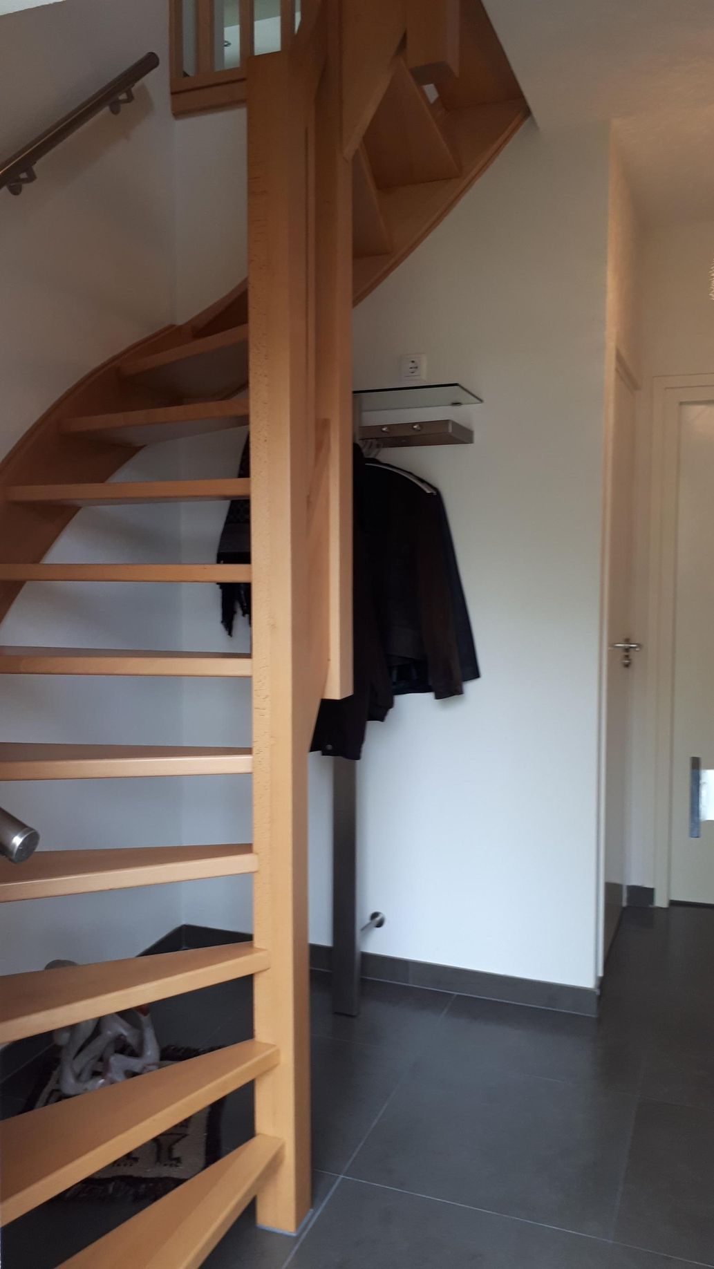 Ground floor: covered entrance, hall, meter cupboard, modern toilet with wall closet and designer fountain, staircase with wardrobe underneath and access to the living room/kitchen.