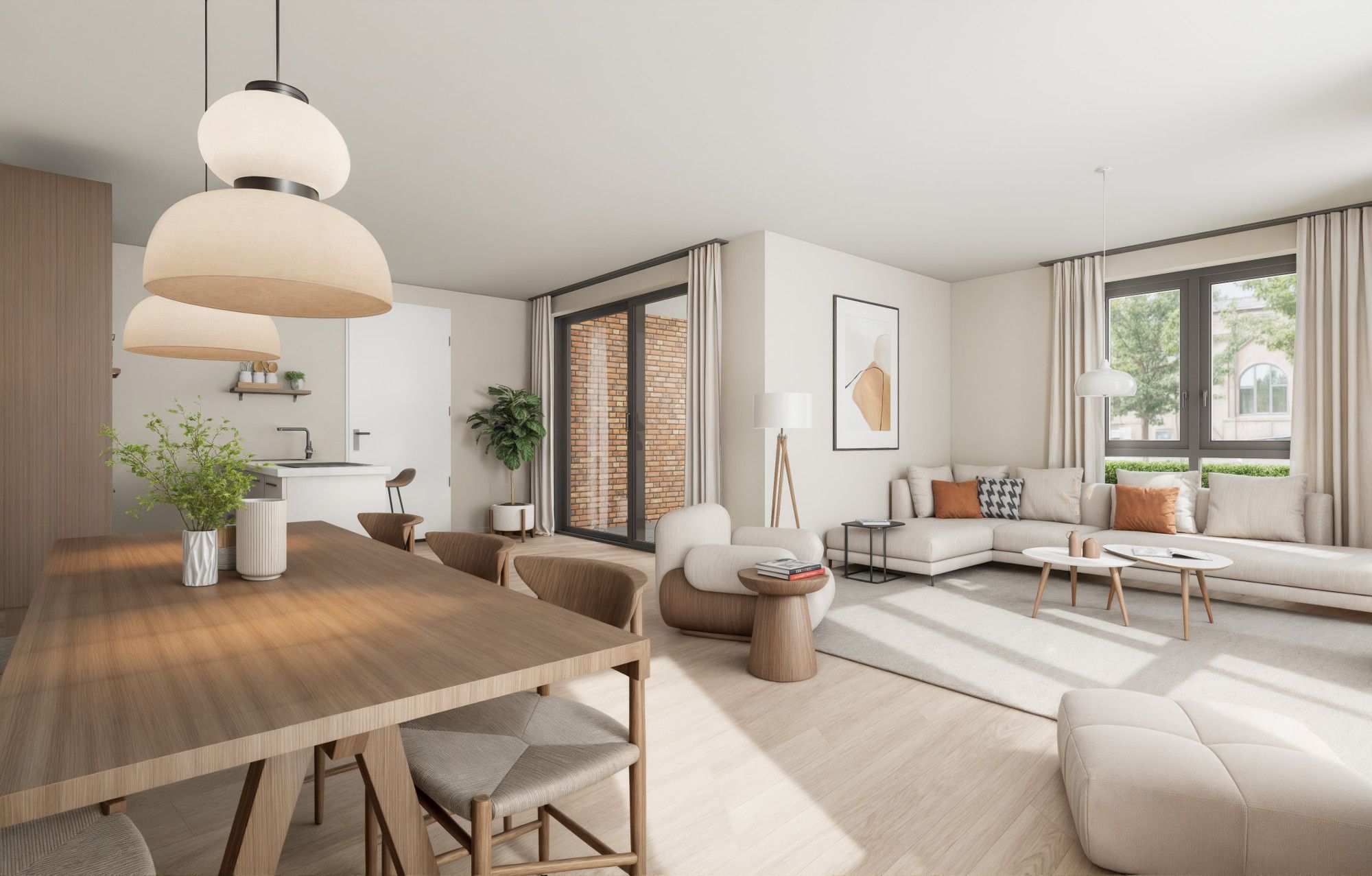 Appartement 3 is op de begane grond gelegen en bevindt zich aan de linker achterzijde van de centrale hal. De riante living van maar liefst 43 m2 bestaat uit een zitgedeelte en een eetgedeelte. De hoge raampartijen laten een grote hoeveelheid daglicht binnen en geven toegang tot de mooie en royale tuin die zonlicht en privacy biedt.