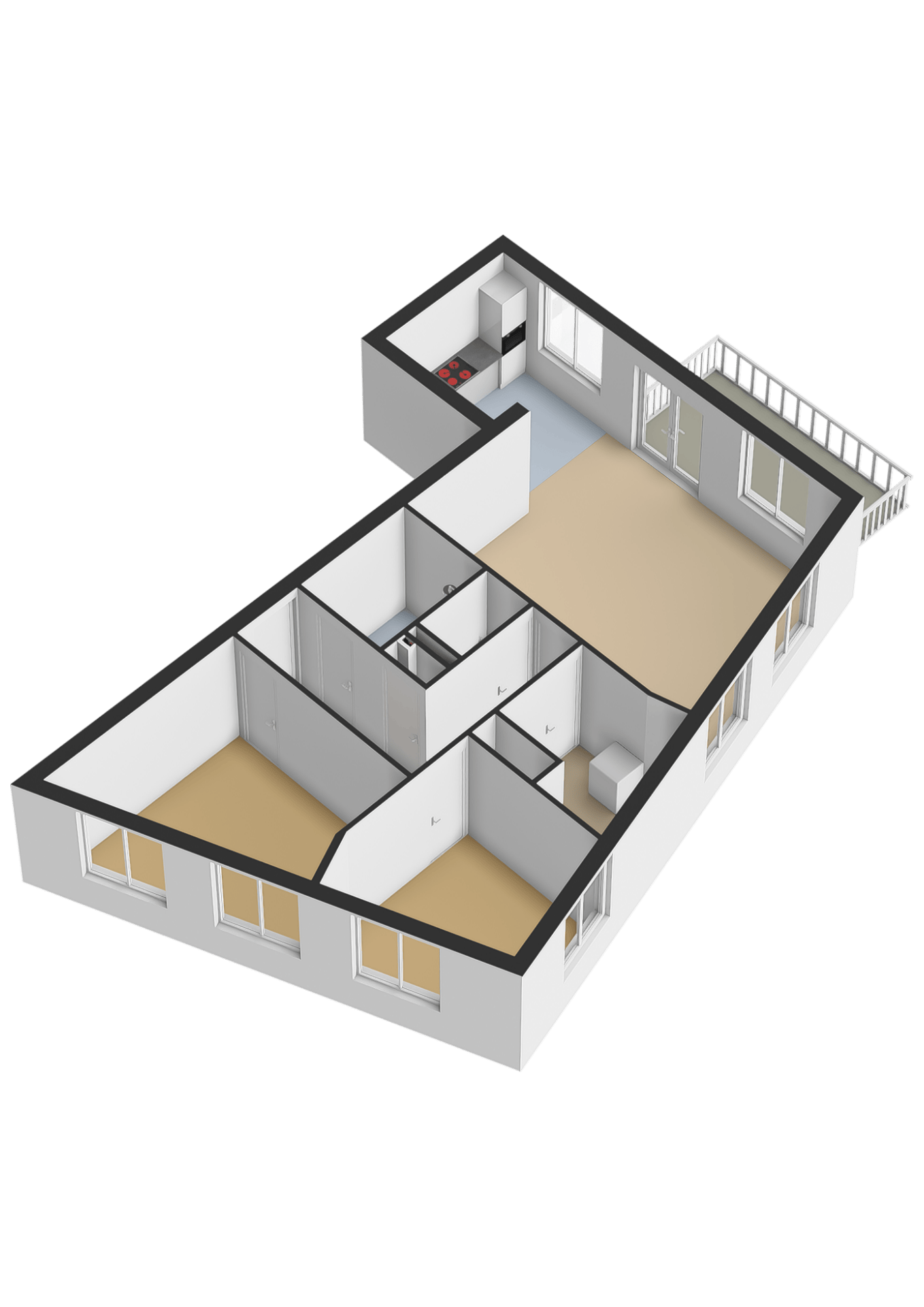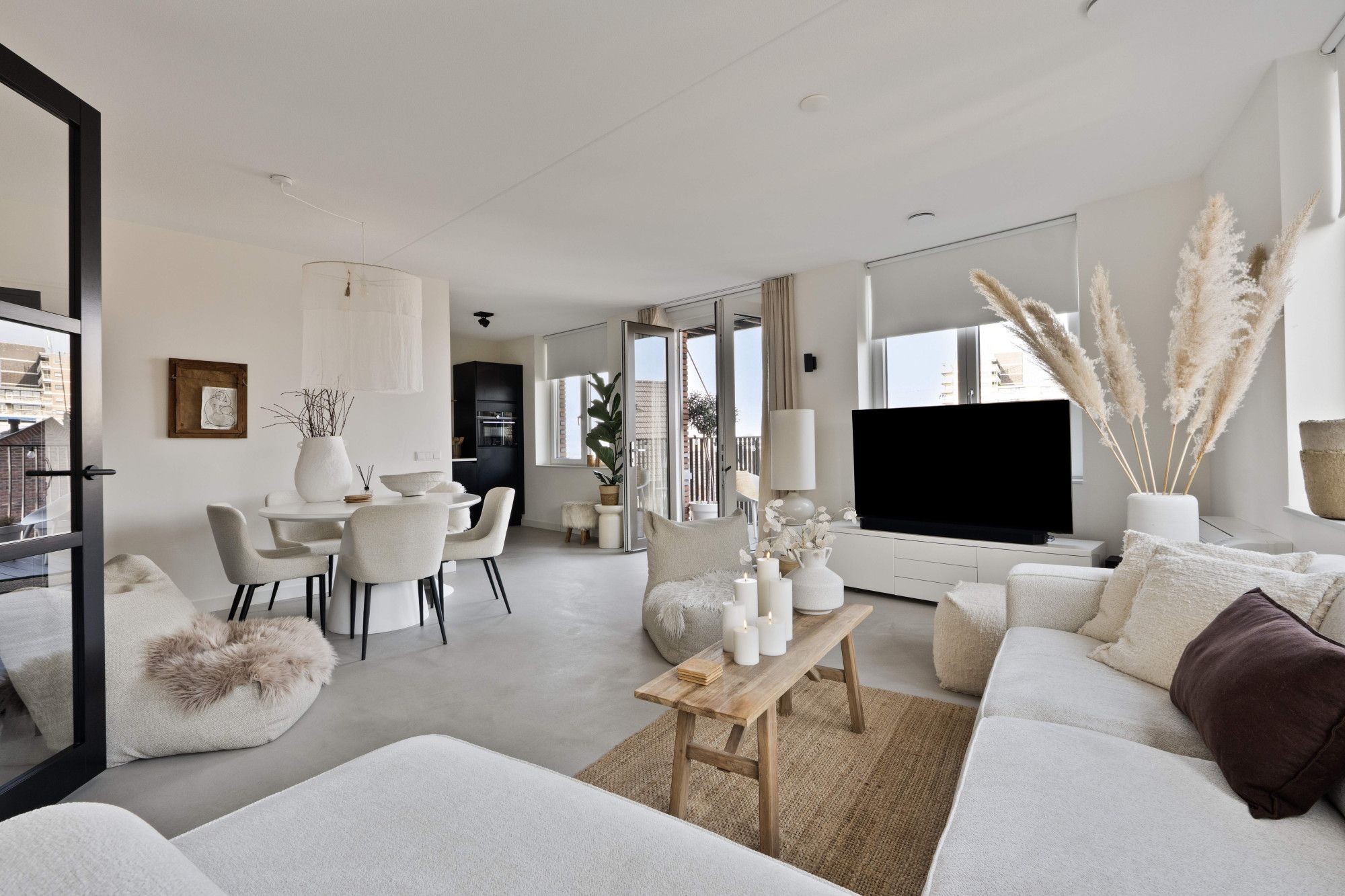 De ruime woonkamer met open keuken vormt het hart van het appartement. Dankzij de grote raampartijen en de twee openslaande deuren naar het balkon geniet u hier van een prachtige lichtinval en een prachtig uitzicht op de maas.