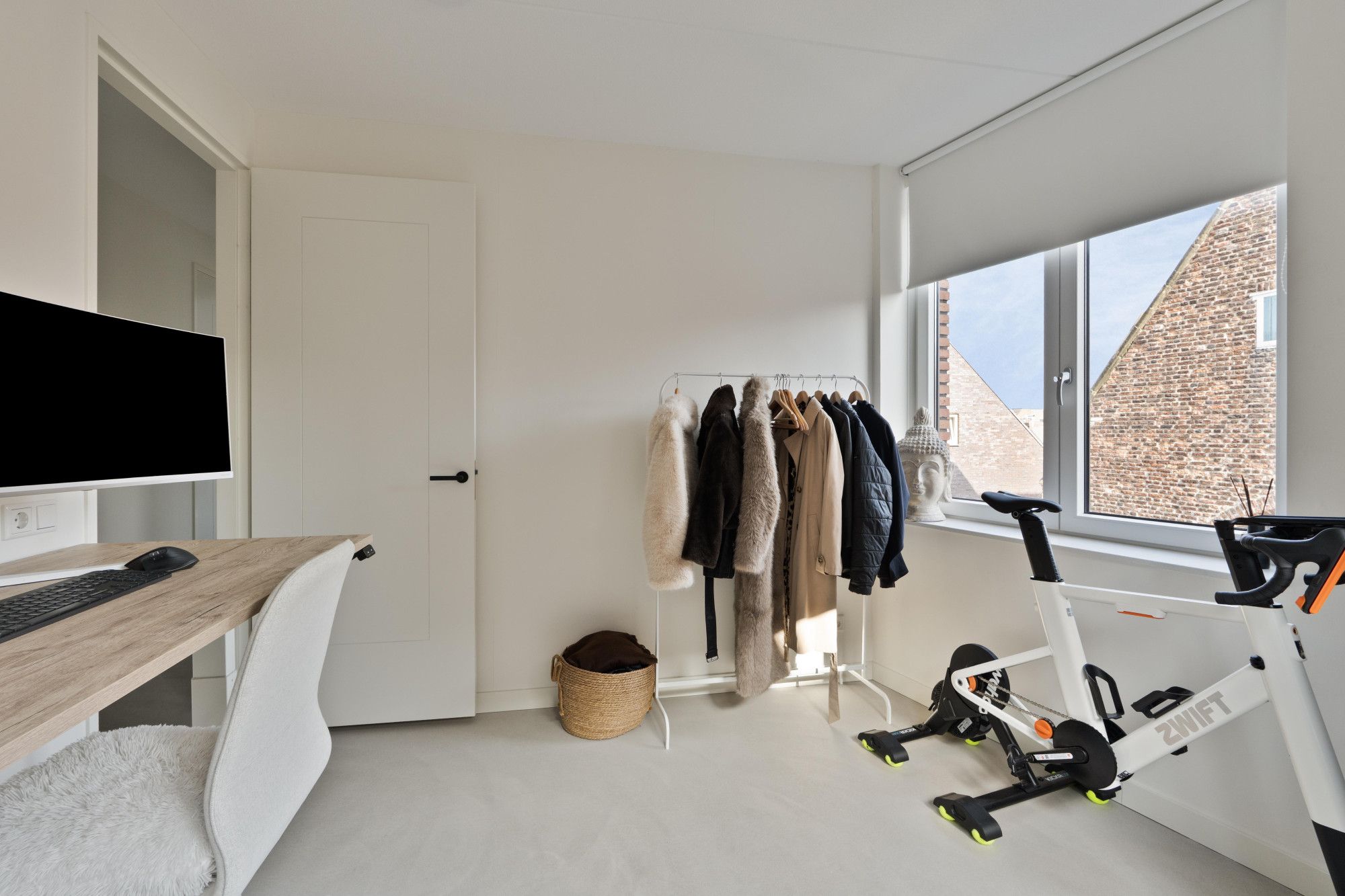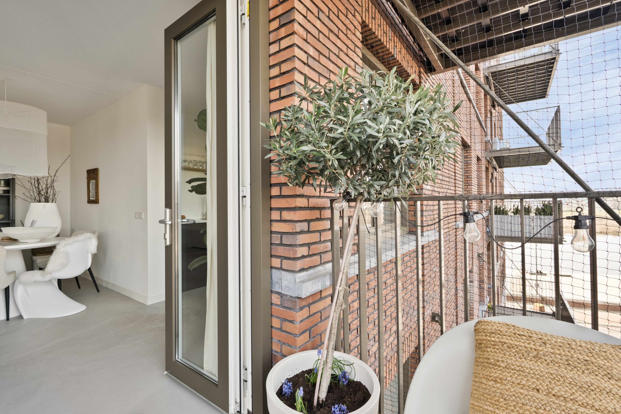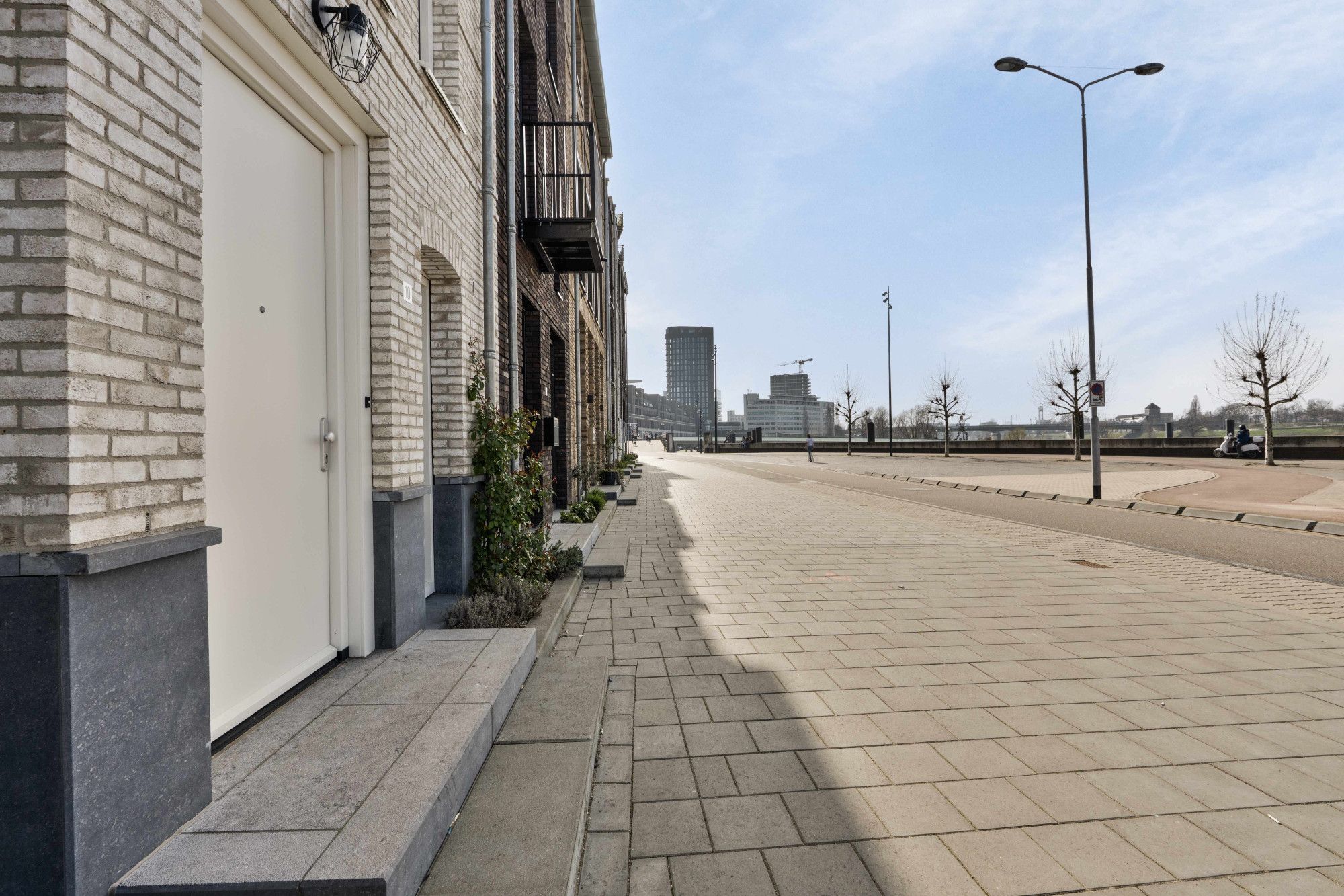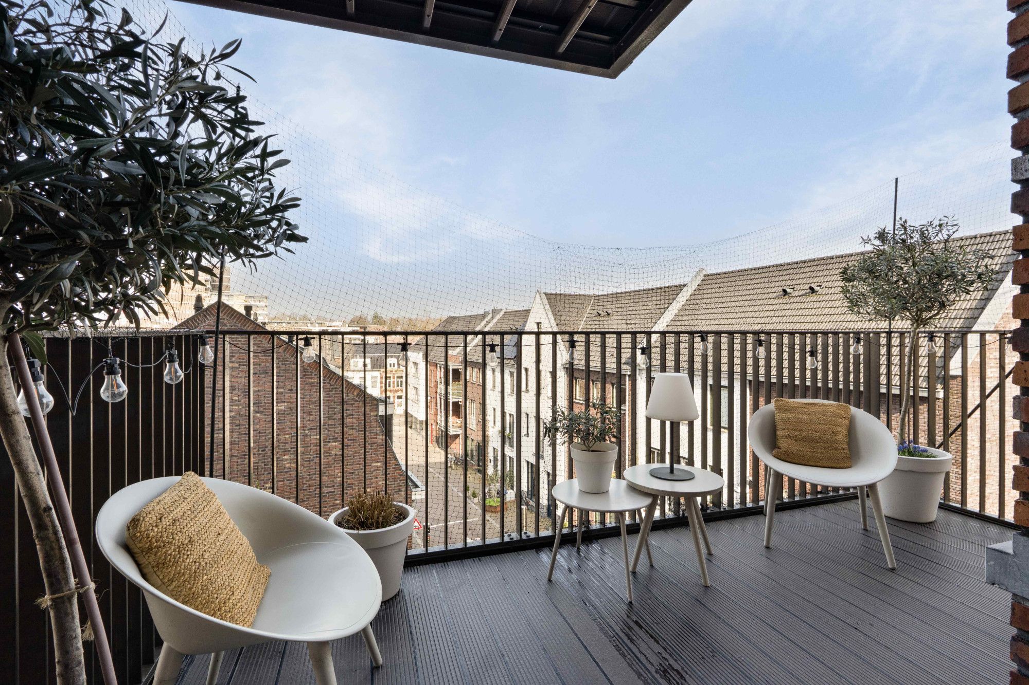 Via de openslaande deuren bereikt u het balkon, waar u kunt genieten van een prachtig panoramisch uitzicht over de binnenstad en de Maas. Een unieke plek om te ontspannen en te genieten van het uitzicht.