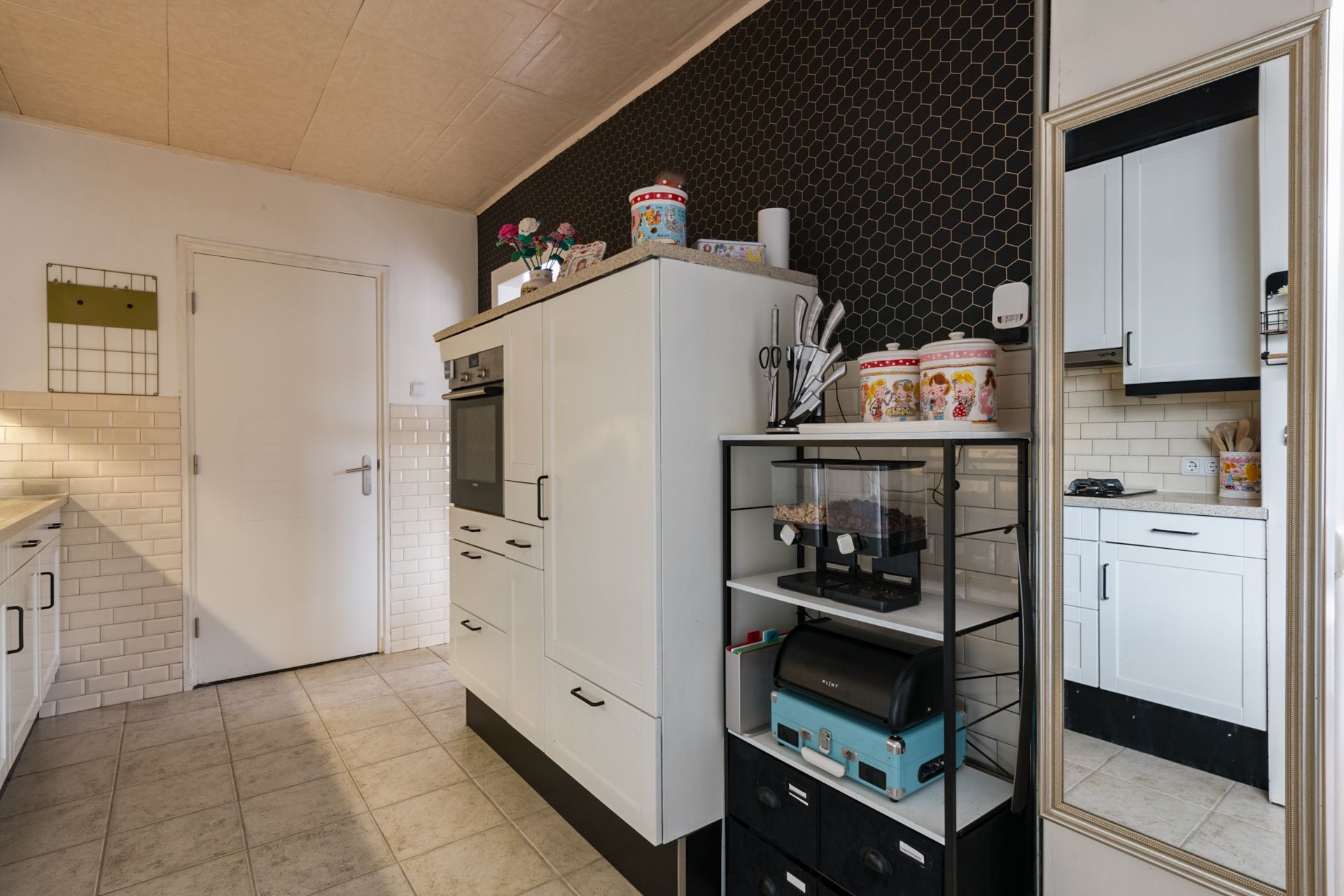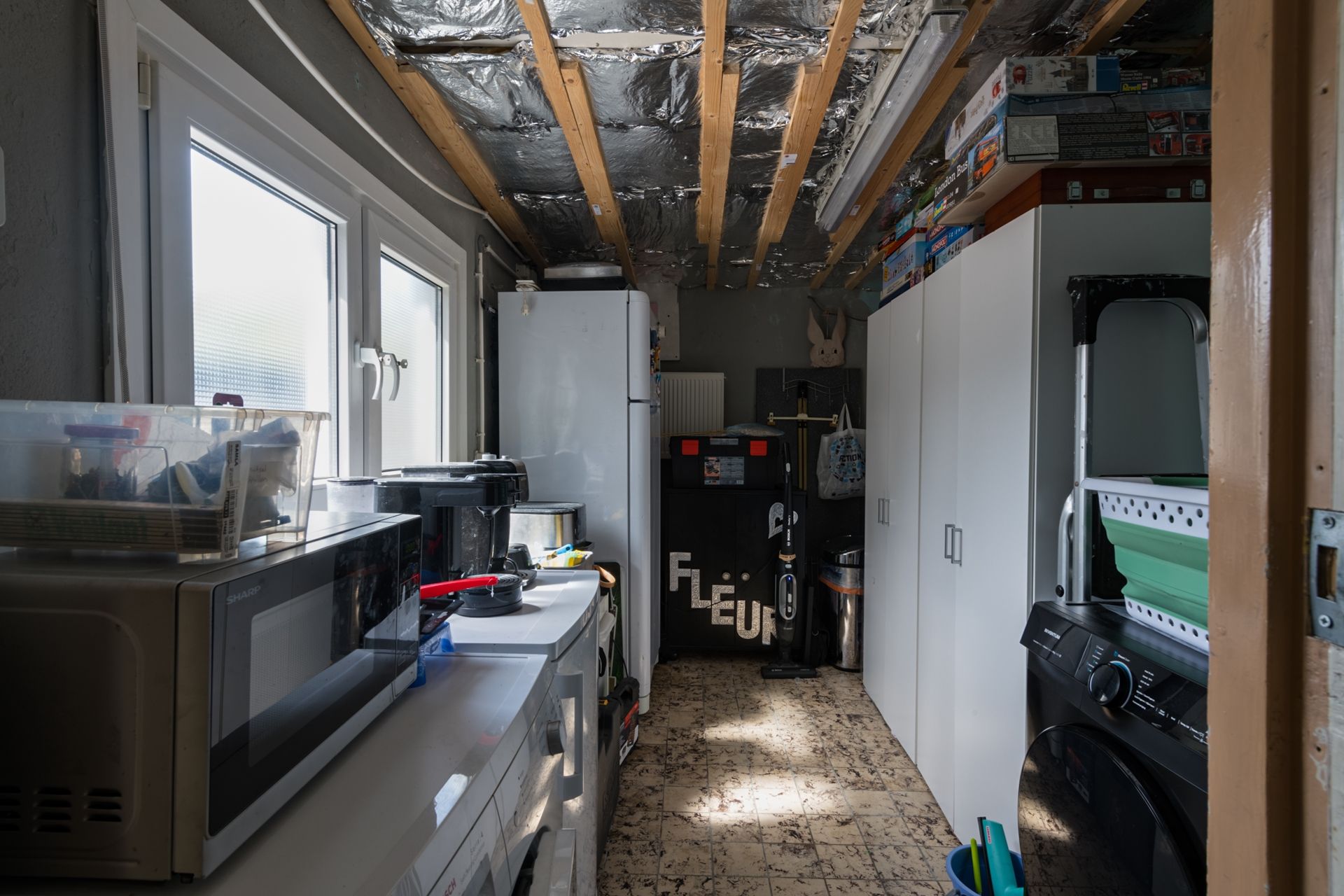 Achter de keuken zijn 2 ruimtes aangebouwd. Hier is de voorste uitgevoerd als verlenging van de keuken. Je kunt ook via deze ruimte de serre in. Helemaal achterin is de feitelijke bijkeuken met wasvoorzieningen.