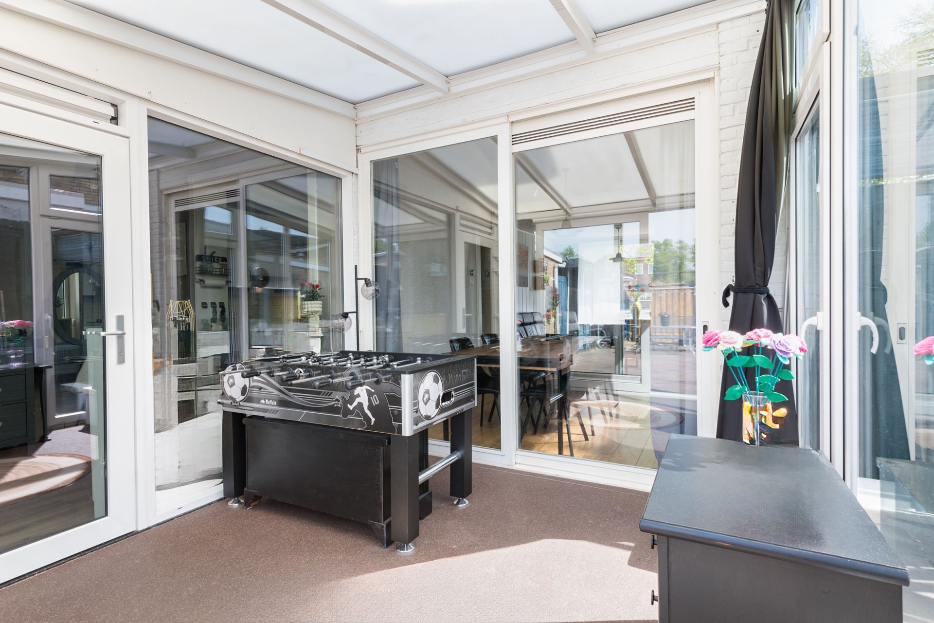 Aan de achterzijde is de lichte serre met schuifpui naar de tuin. De extra ruimte welke benut kan worden als speelkamer, maar ook kan worden ingericht als wintertuin, terras o.i.d. In ieder geval een fraaie verbinding vanuit de woonkamer naar de achtertuin.