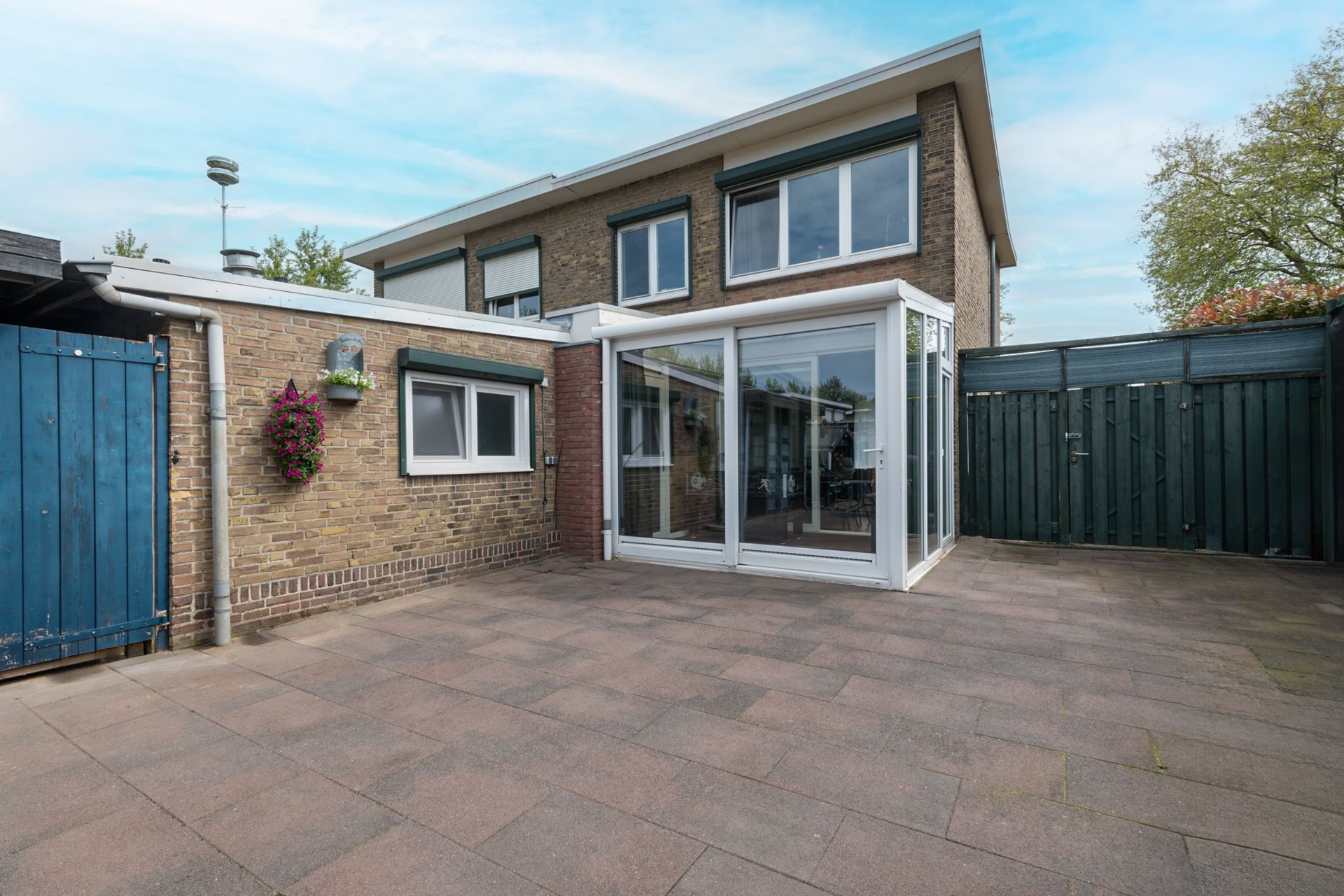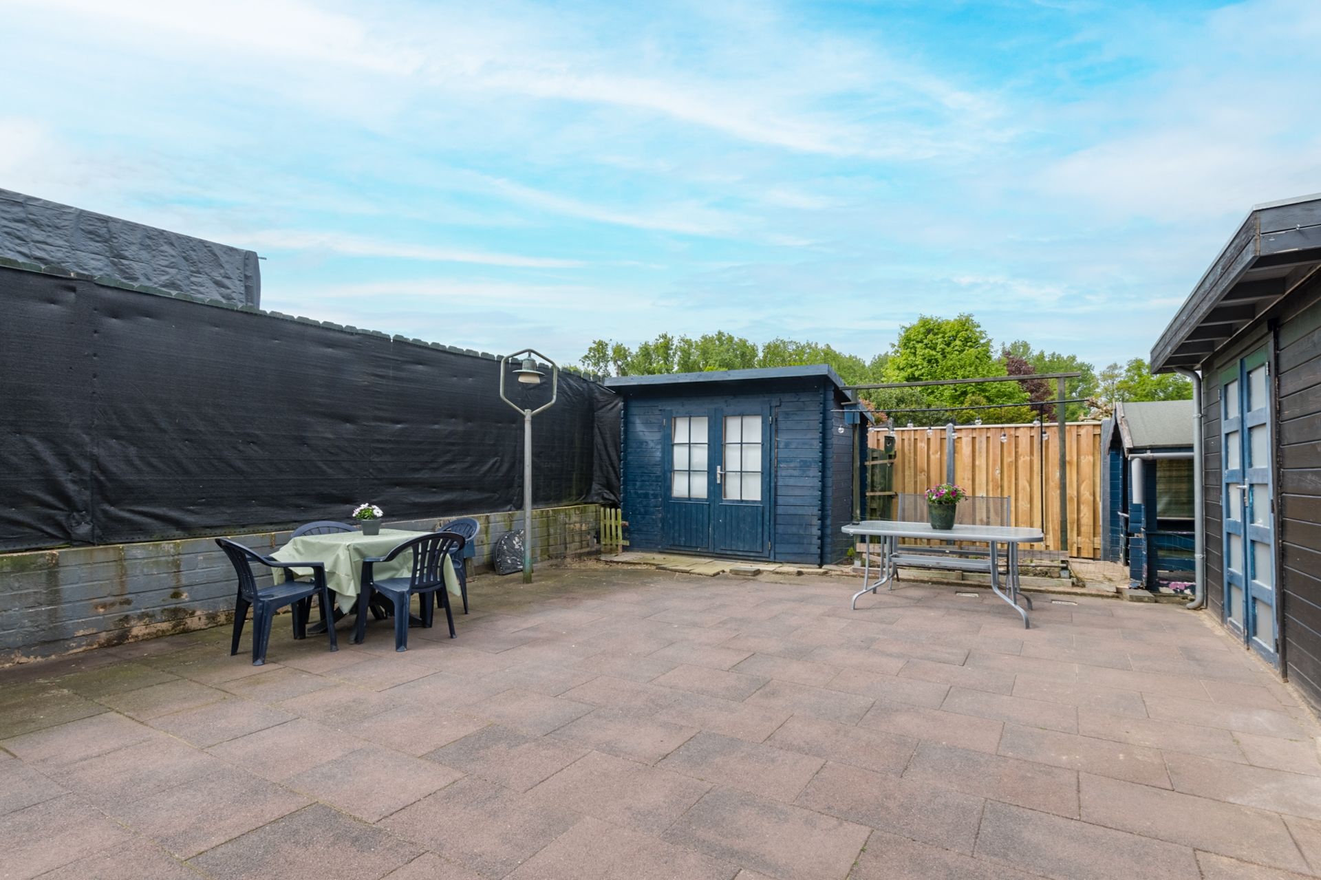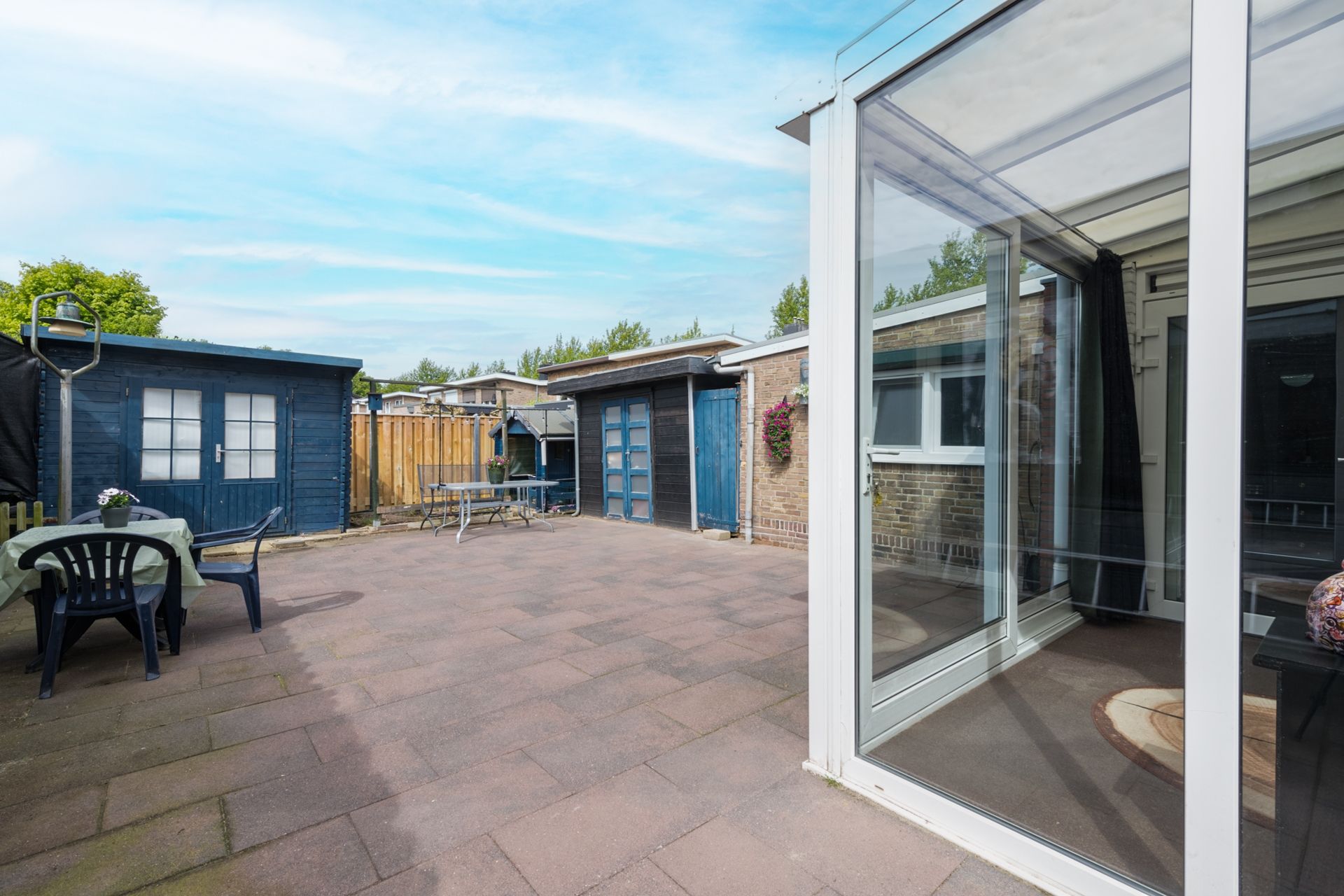 De zonnige achtertuin is geheel bestraat. In de 2 houten bergingen kunnen fietsen, scooters e.d. worden gestalt, terwijl de andere ruimte biedt aan het tuinmeubilair en -gereedschap.