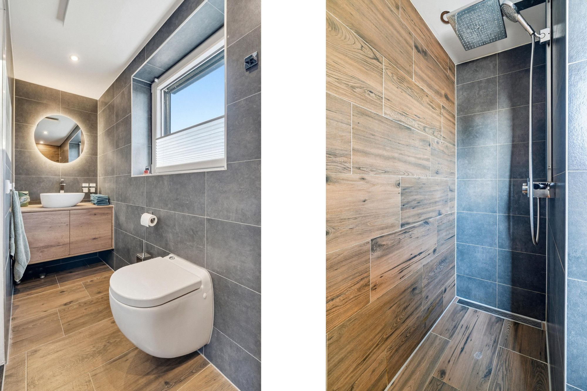 Volledig betegelde badkamer(3.74mx1.00m) met douche, vaste wastafel en 2e toilet.