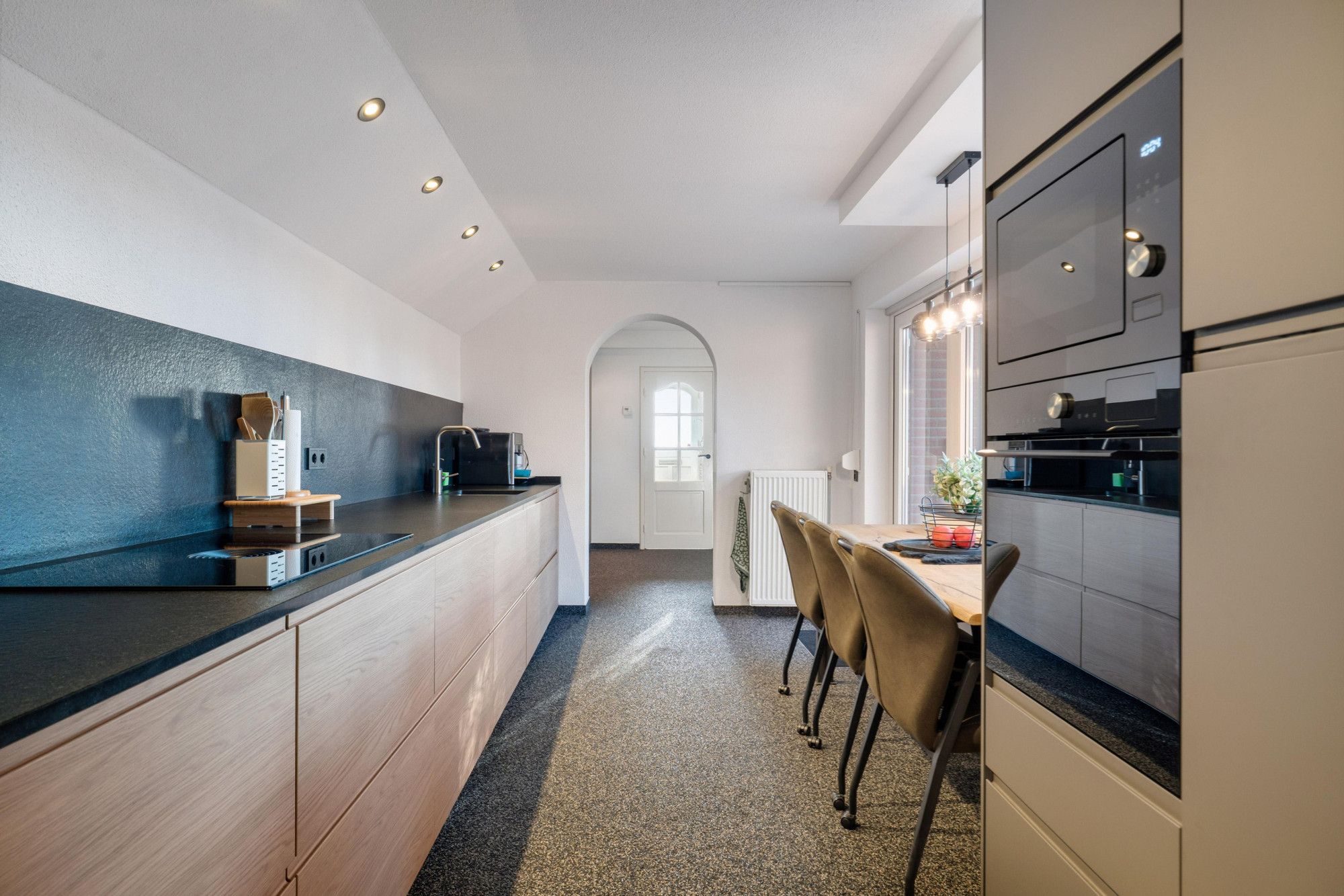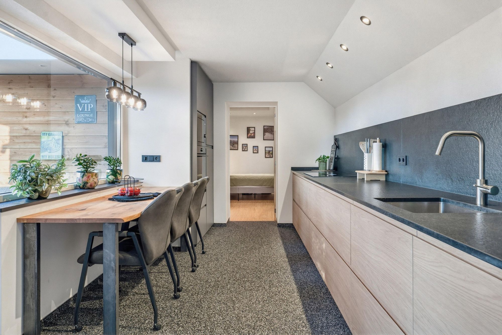 Keuken(4.80mx2.81m) met grindvloer, schitterende aanbouwkeuken is voorzien prachtig keukenblad en vaatwasser, inductiekookplaat, afzuigkap in de kookplaat, combi oven/magnetron, koelkast.