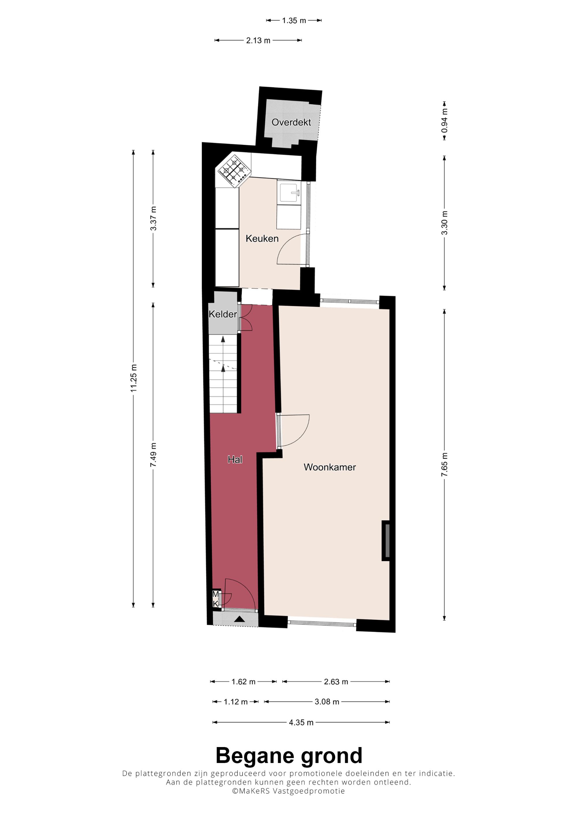 Ruime hal met tegelvloer, trapopgang met bordes naar de eerste verdieping en de meterkast. Vanuit de hal betreedt u de ruime woon-/eetkamer, keuken en de provisiekelder. De keuken heeft een eenvoudige, maar nette opstelling met (inbouw)apparatuur, waaronder een 4-pits gaskookplaat, afzuigkap en een vaatwasser. De begane grond is voorzien van een houten vloer en een tegelvloer.
