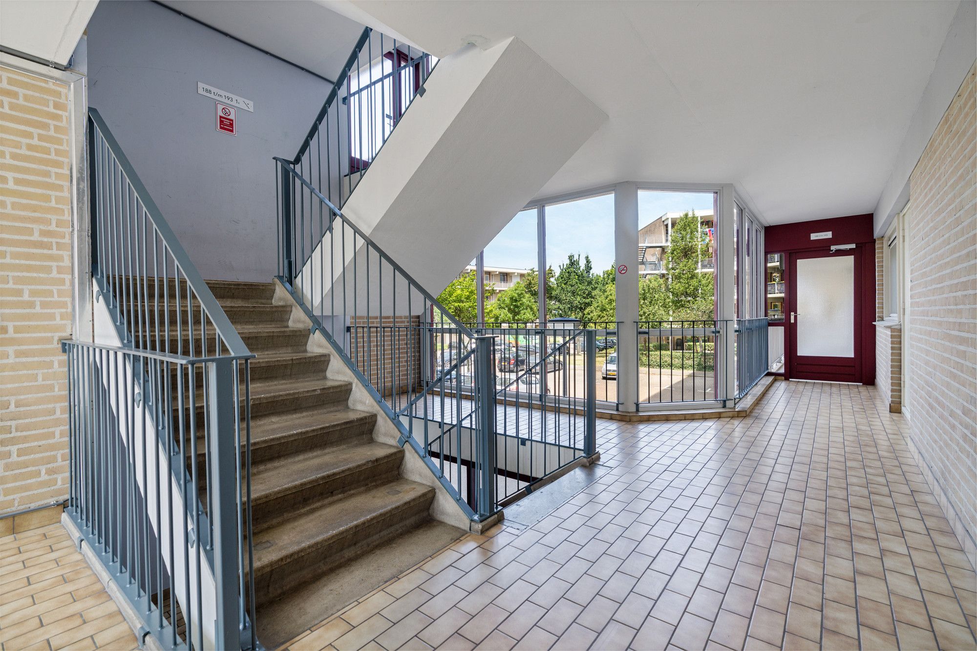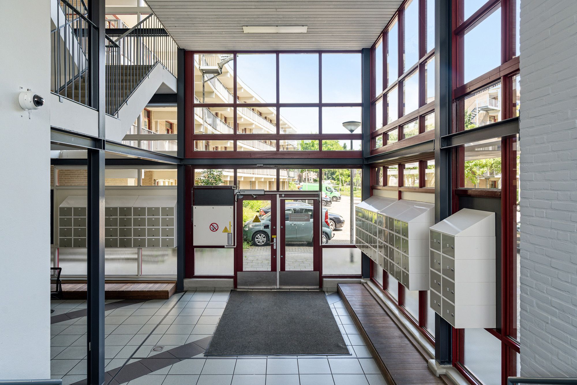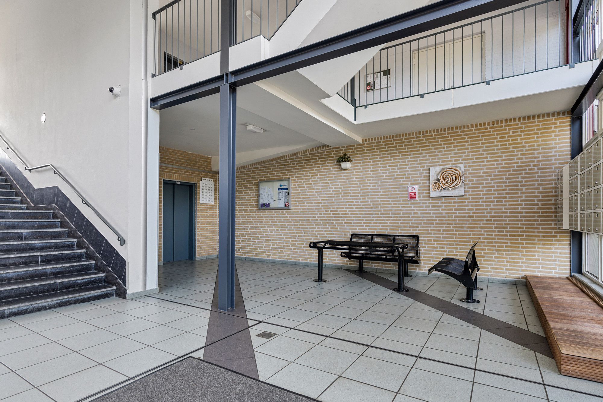 Via de centrale entree met bellentableau en brievenbussen is er toegang tot de privé berging en het appartement.