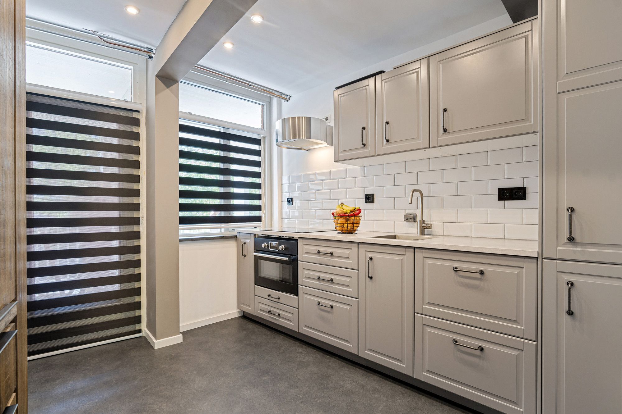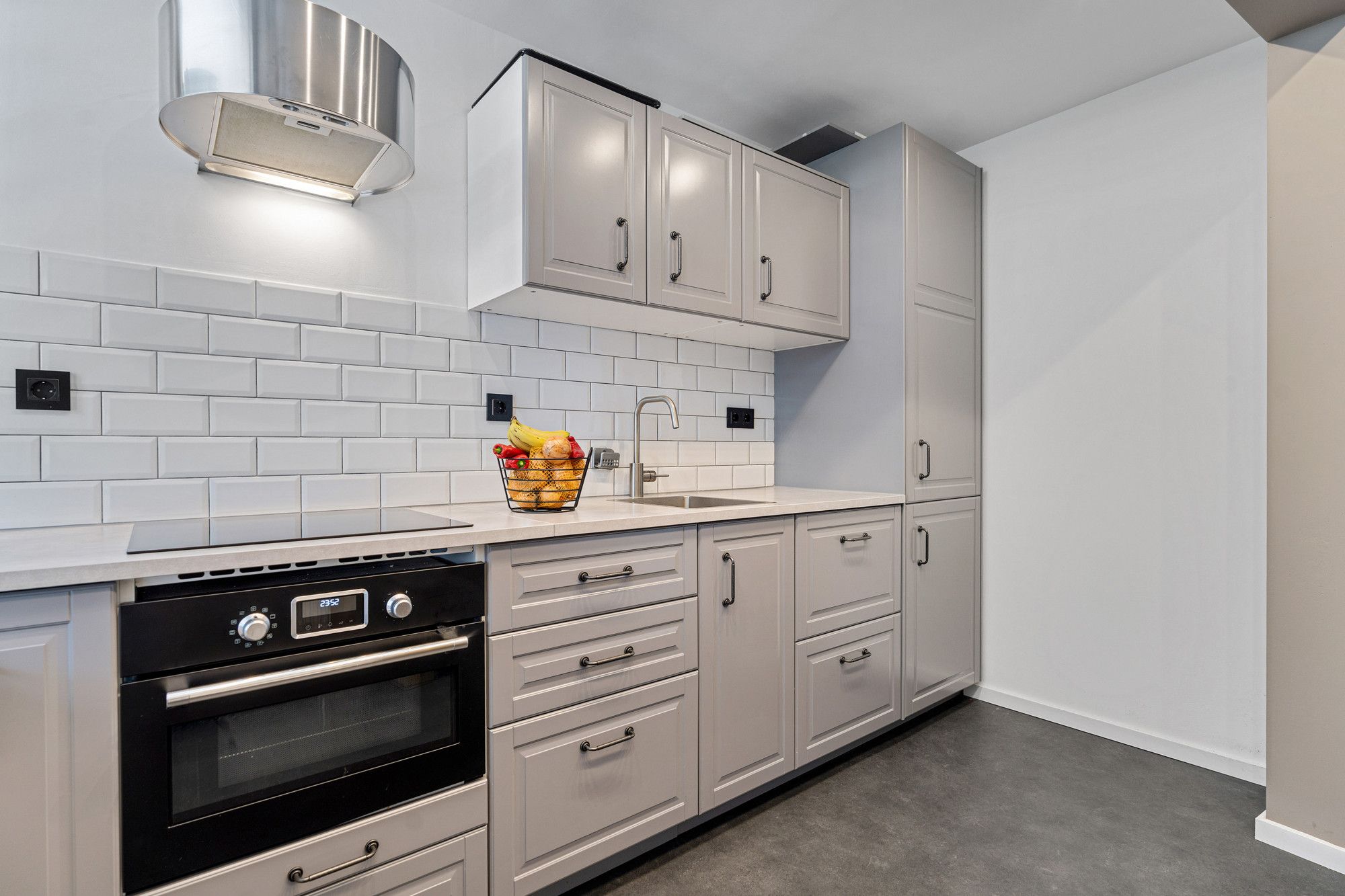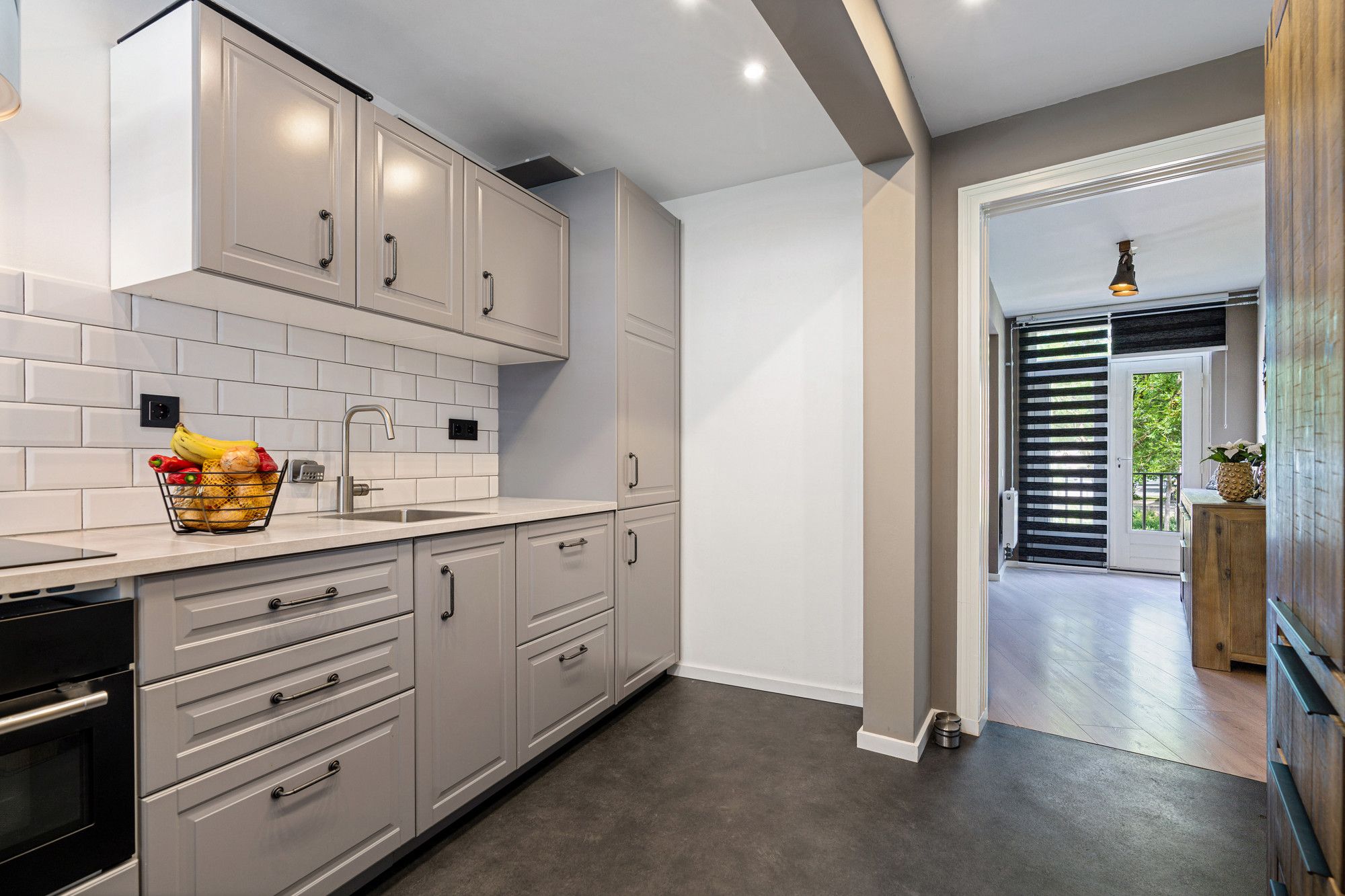 De keuken is modern afgewerkt en voorzien van een inductiekookplaat (4 pits), heteluchtoven, afzuigkap, koelkast met vriesvak en diverse boven- en onderkasten.