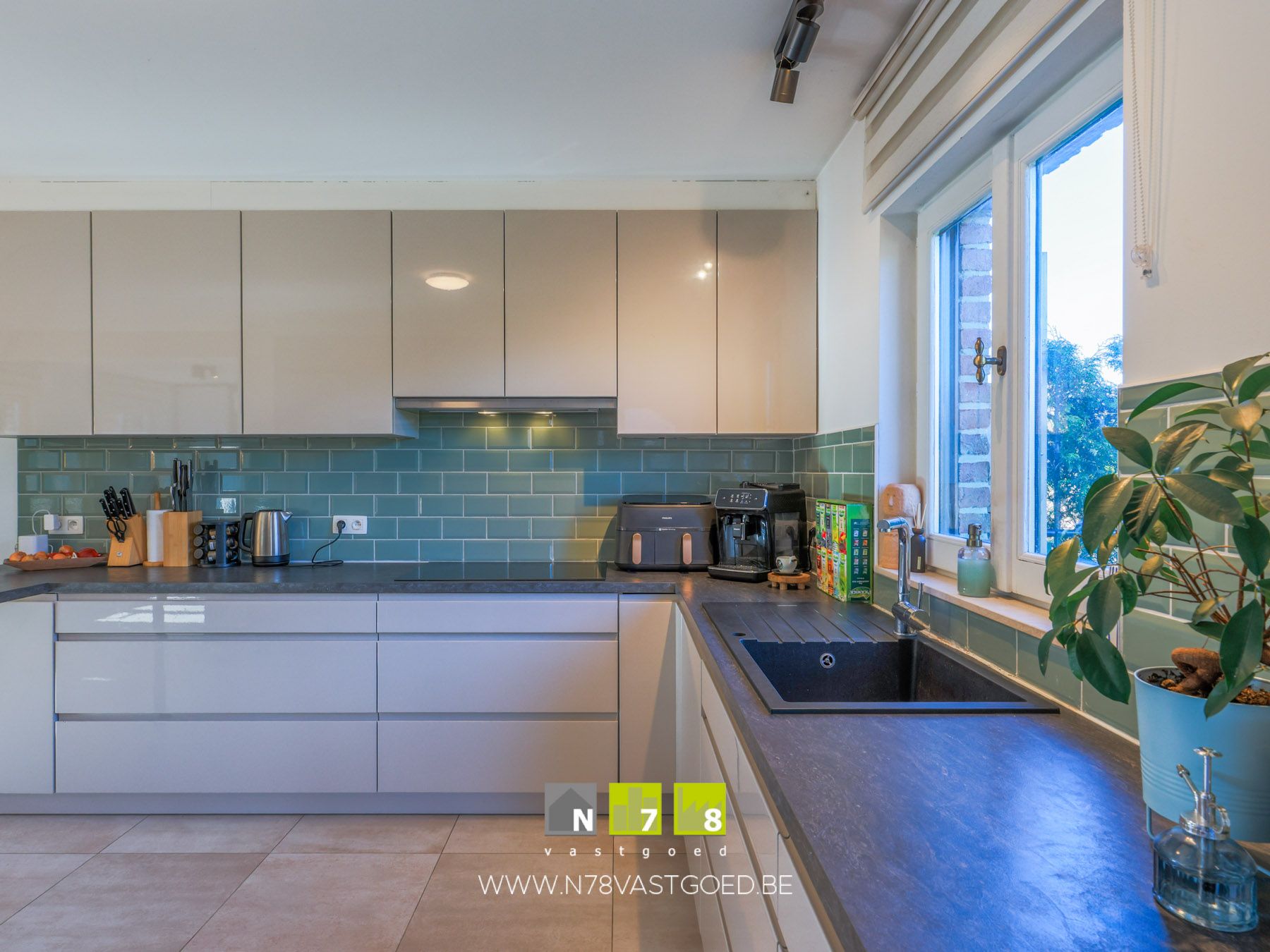 - Keuken (3,78m x 7,42m = 28,05m²) geïnstalleerd met onder- en bovenkasten, lades, vaatwasser, microgolf- en heteluchtoven, inductiekookplaat en dampkap, achteringang, tegelvloer.