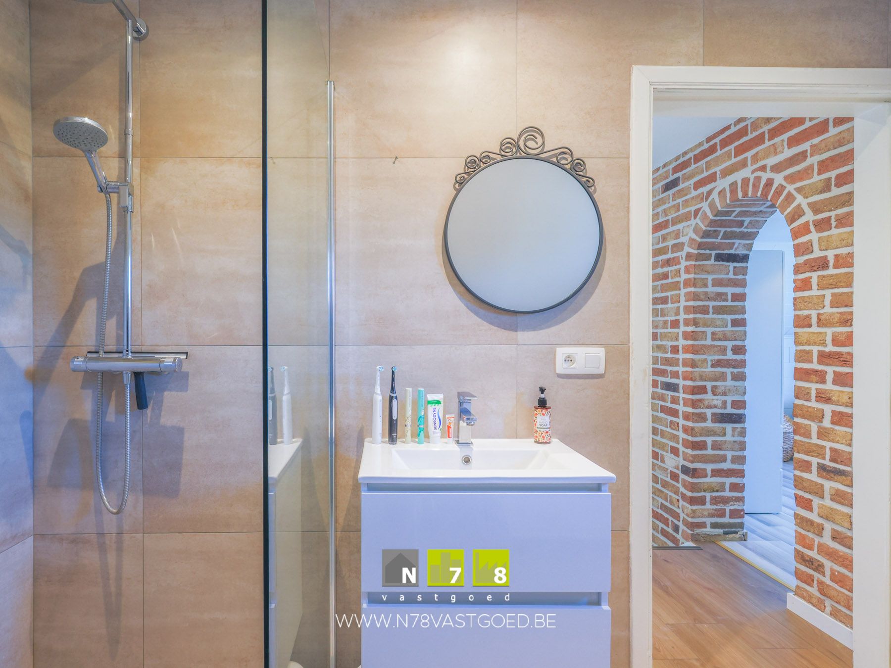 - Badkamer (2,98m x 2,35m = 7,00m²): geïnstalleerd badmeubel met enkele lavabo en onderkast voorzien van lades; inloopdouche, hangtoilet, wandbetegeling, tegelvloer