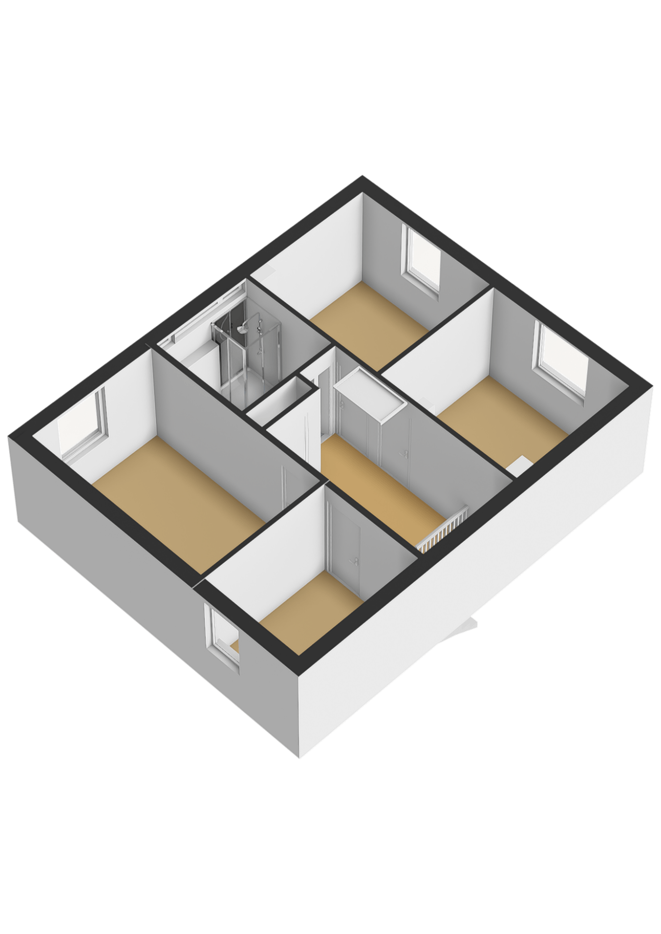 De overloop biedt toegang tot vier slaapkamers en de badkamer.