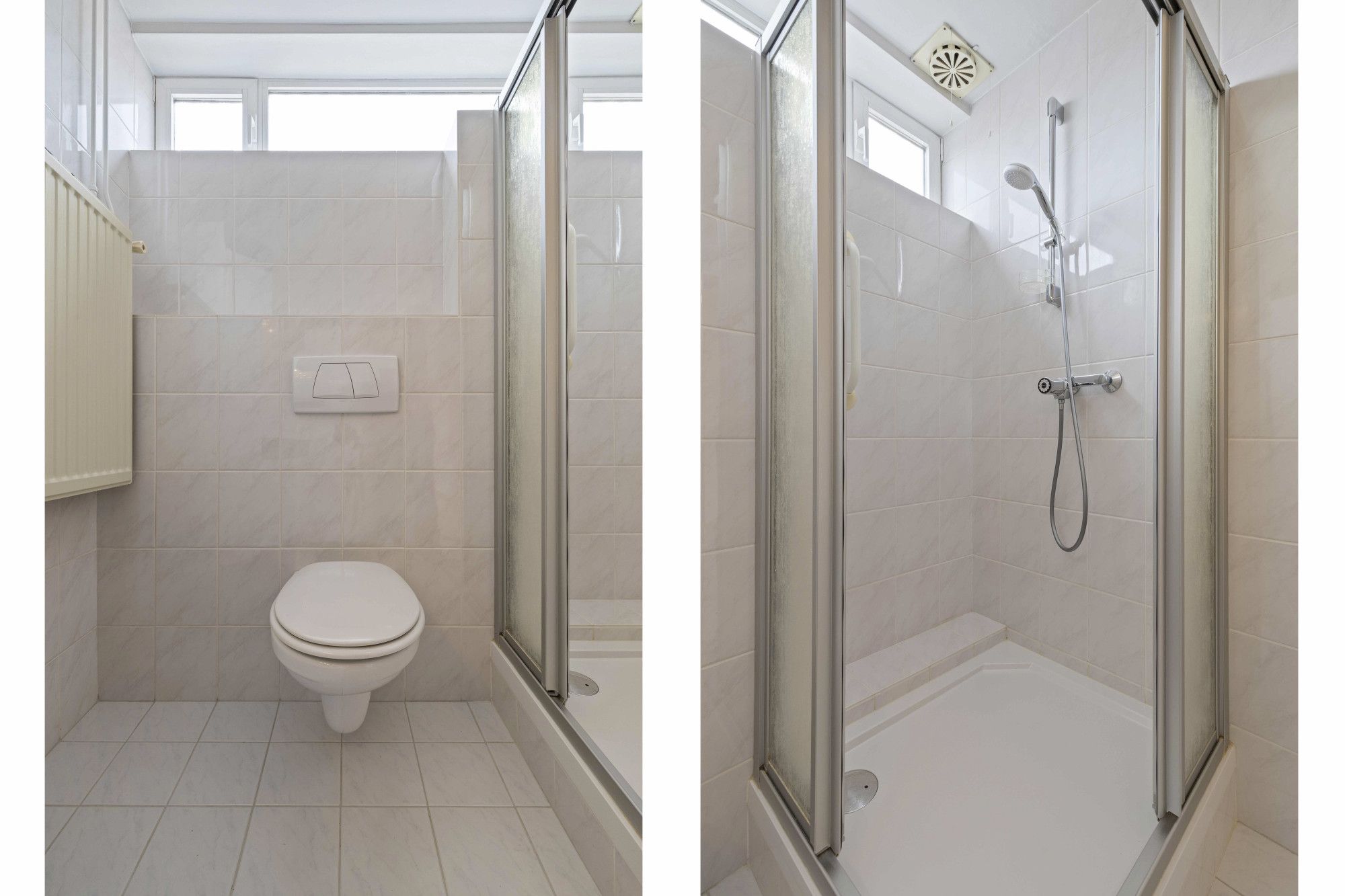 De badkamer beschikt over een douche, tweede toilet en wastafel met meubel.