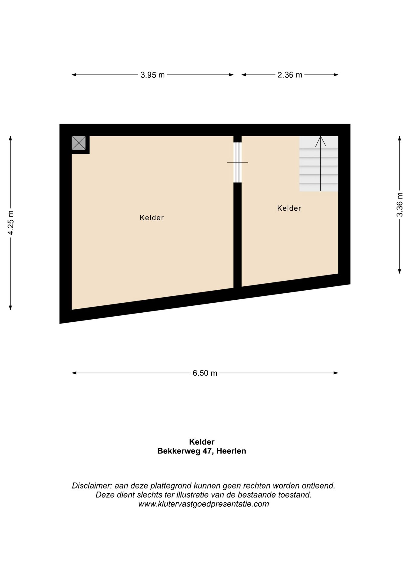 Vanuit de hal te bereiken provisiekelder verdeeld in kelderruimte I (3,97 m x 2,25 m) en kelderruimte II (1,26 m x 2,25 m).