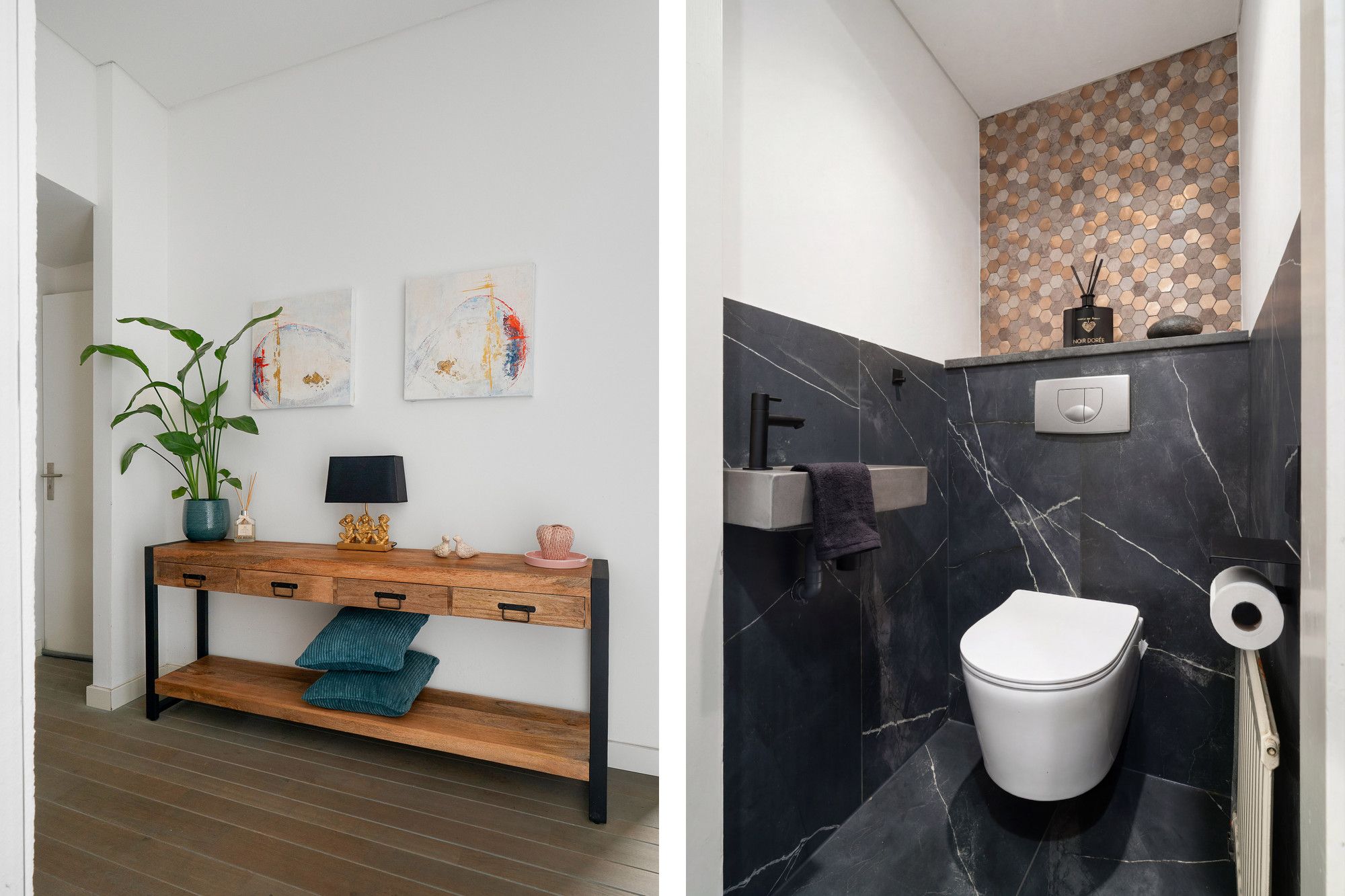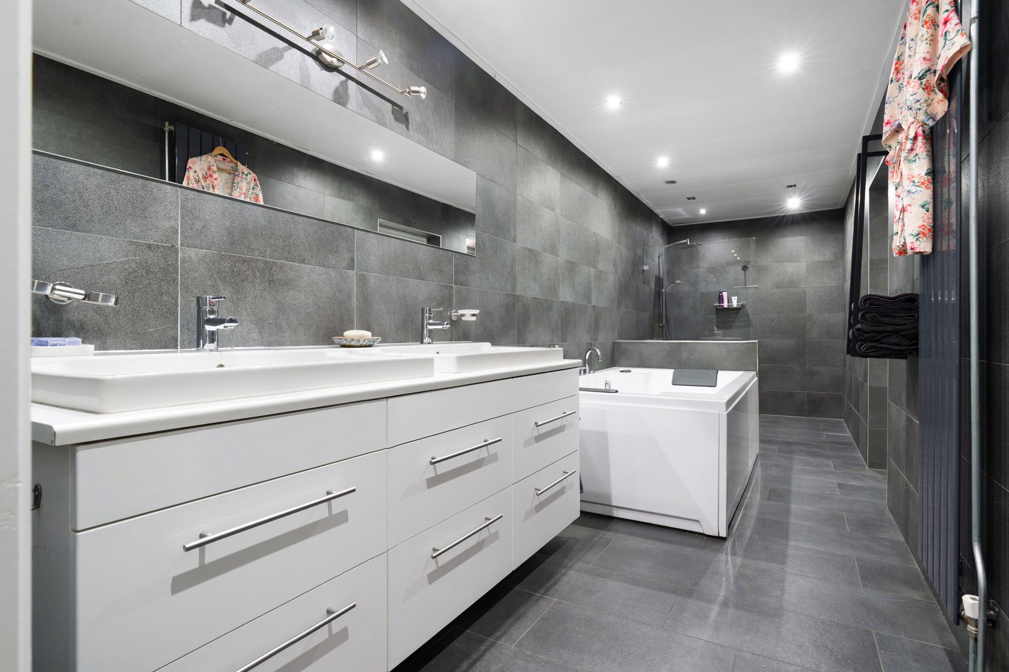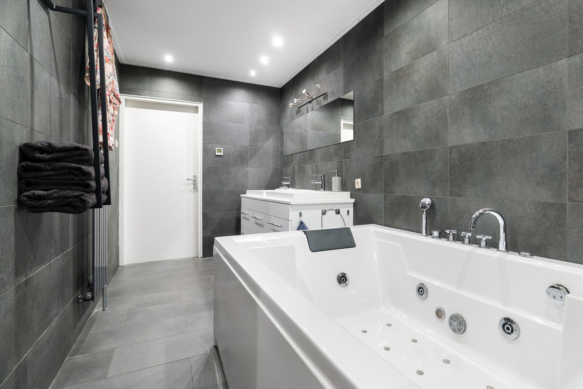 Hal, werkkamer, slaapkamer en 2e geheel betegelde luxe badkamer met whirlpool, inloopdouche, dubbele vaste wastafel en hangcloset.