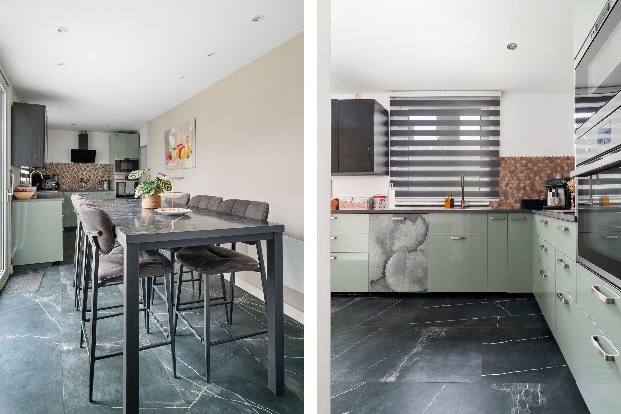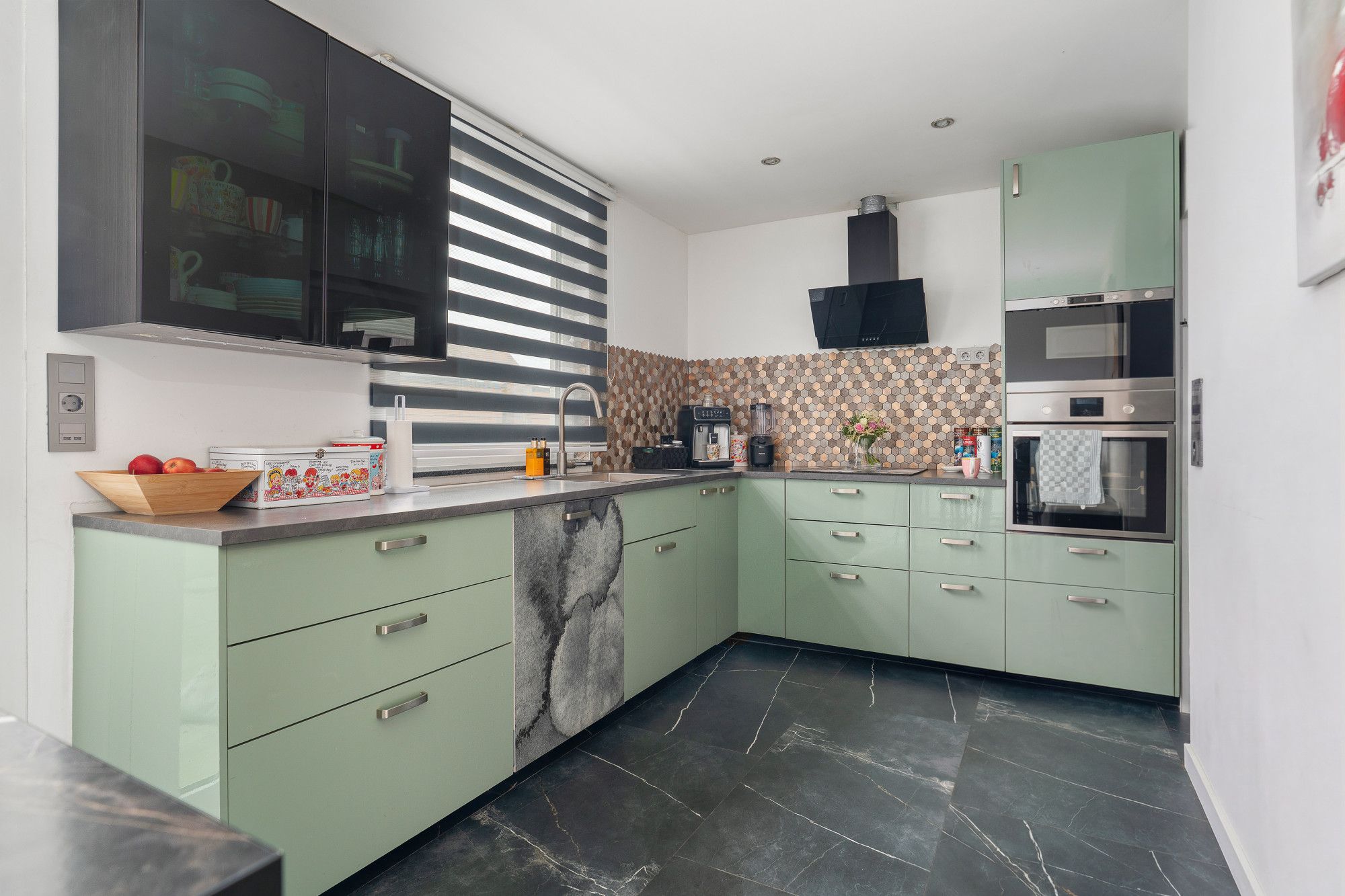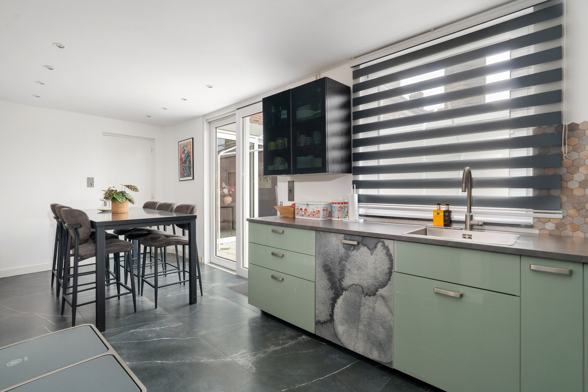 Moderne leefkeuken met keukeninstallatie in L-vorm met apparatuur (afzuiging, oven en vaatwasser) nieuwe plavuizenvloer, schuifpui naar de tuin en doorgang naar bijkeuken.
