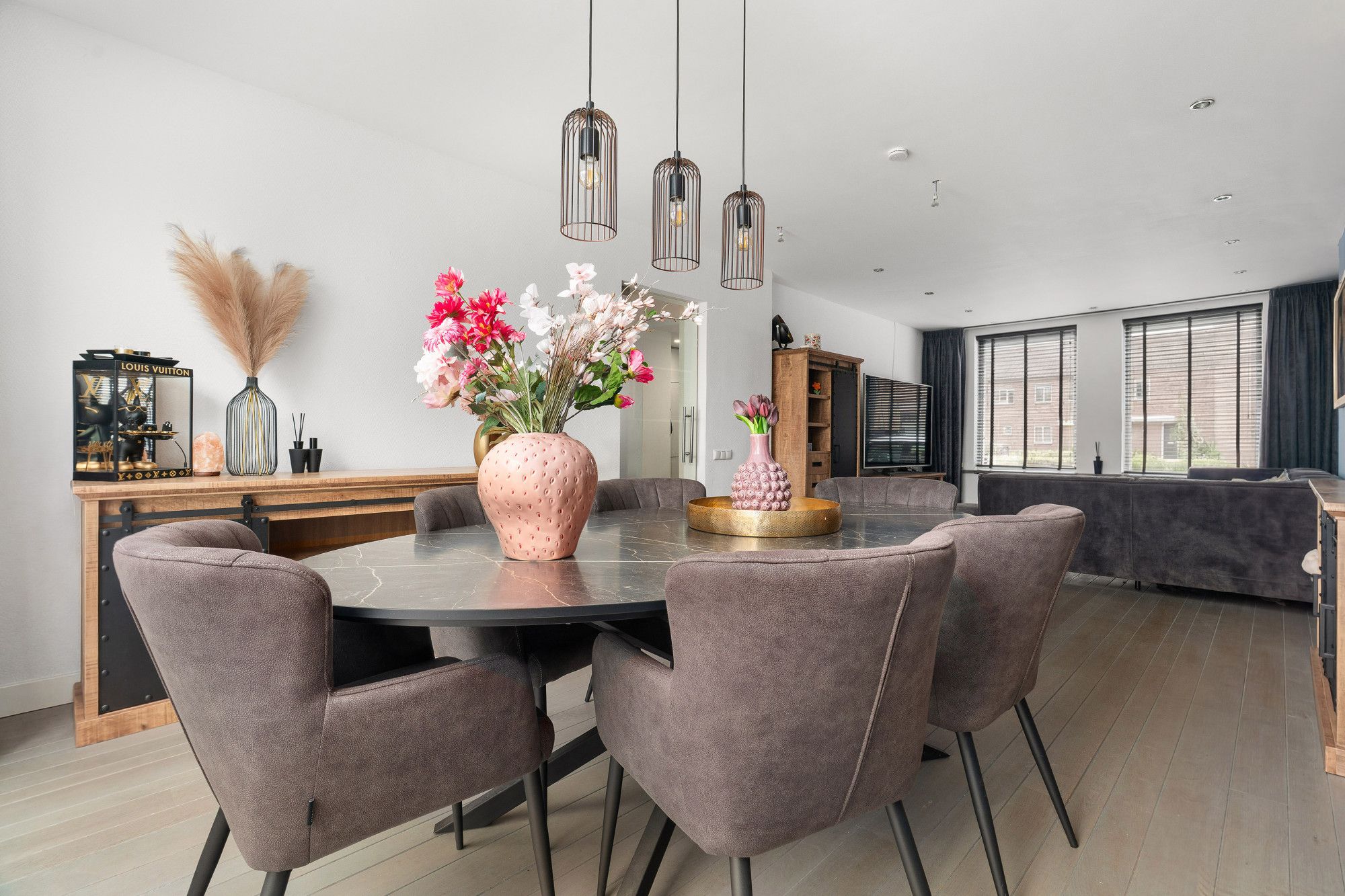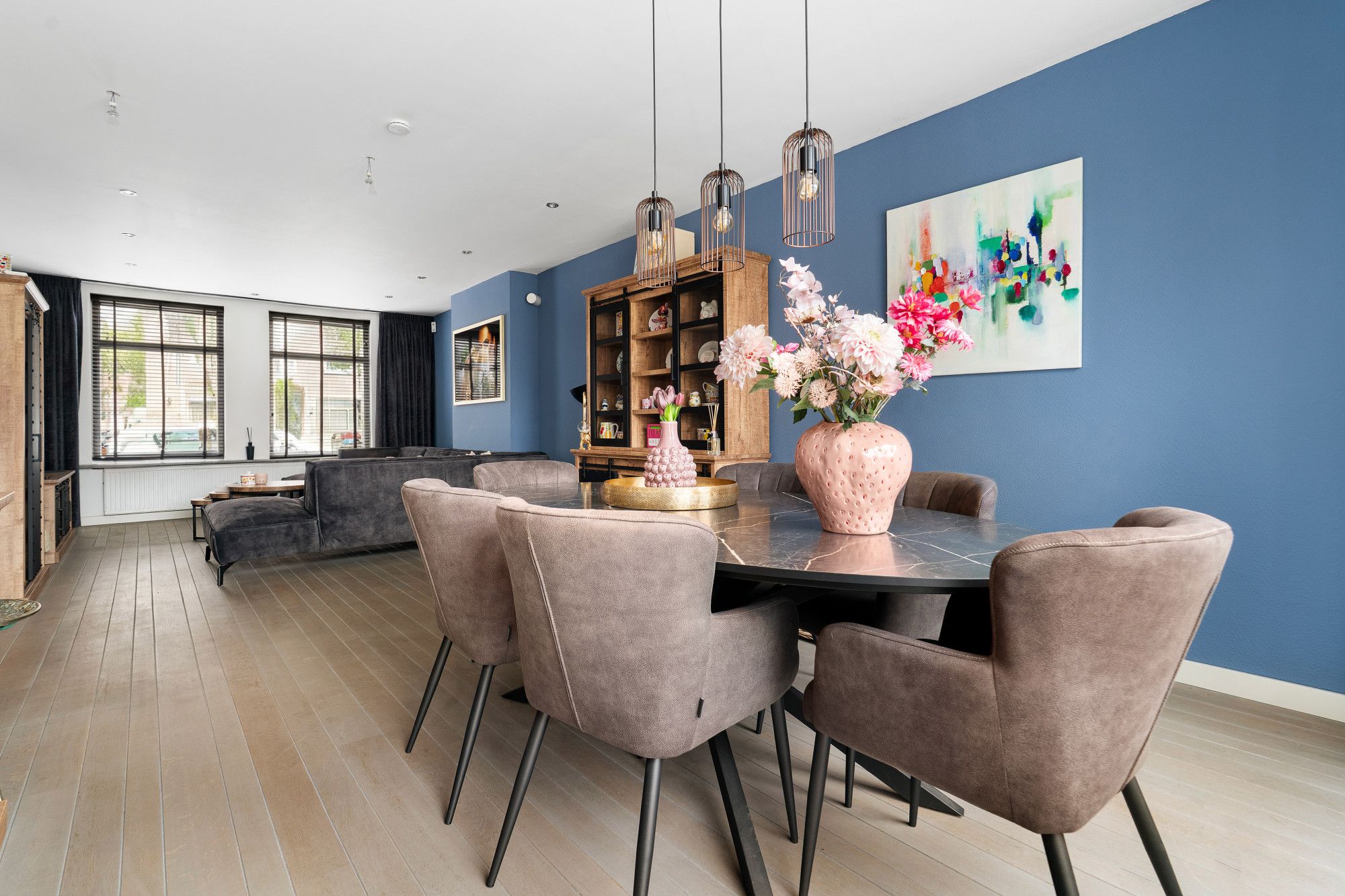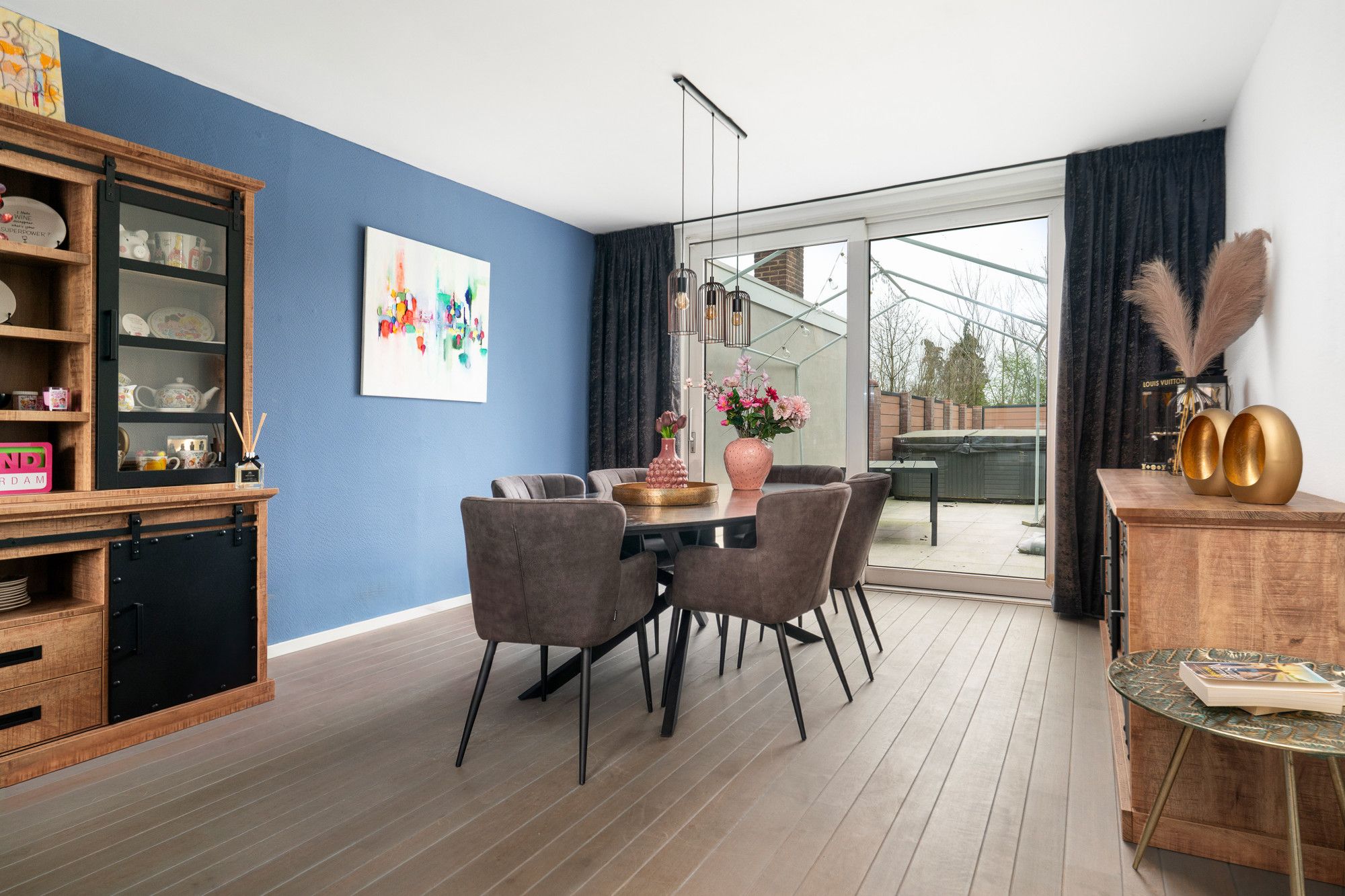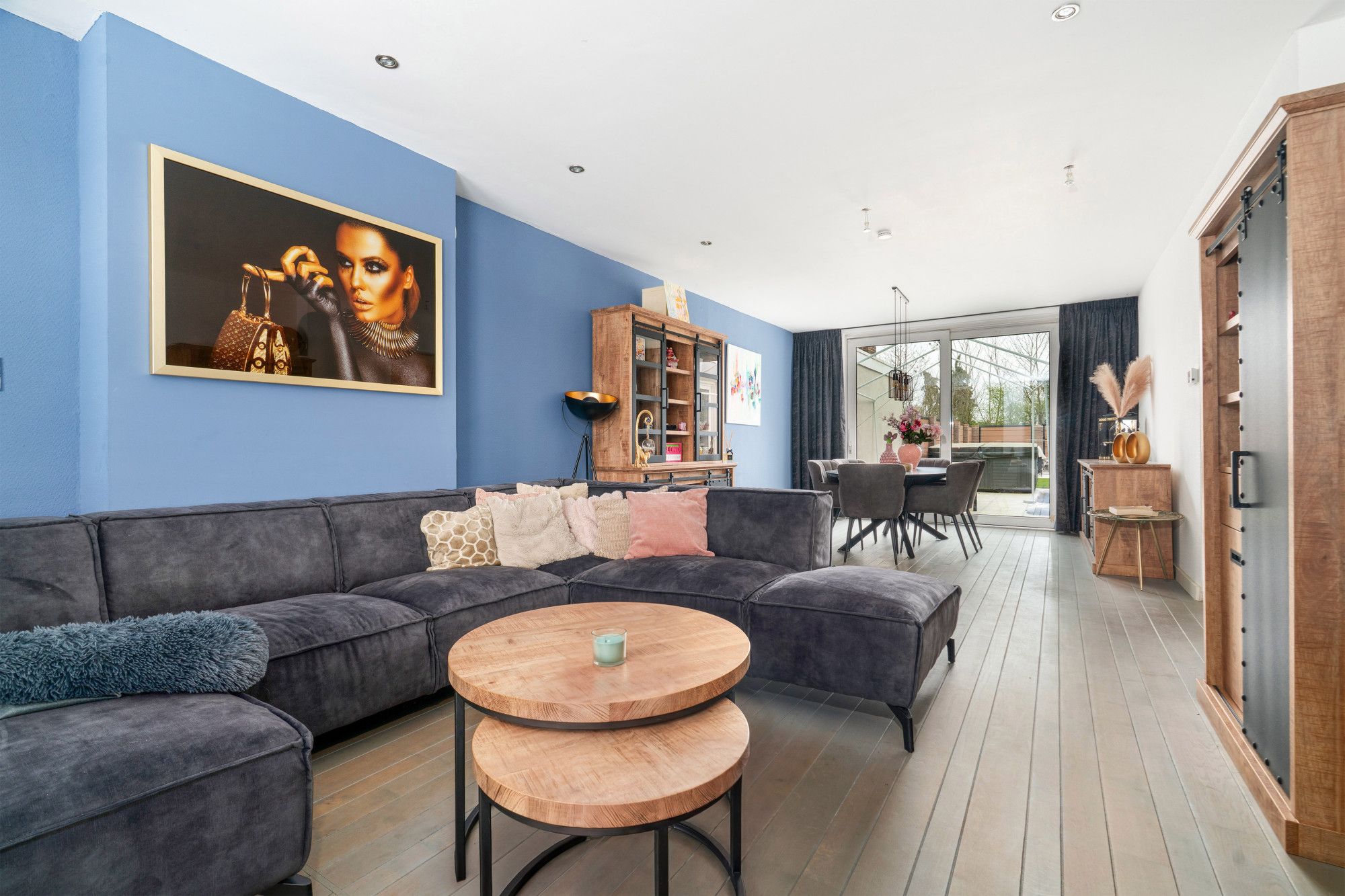 Gerenoveerde woonkamer met parketvloer, schuifpui naar de tuin en doorgang naar gesloten keuken.