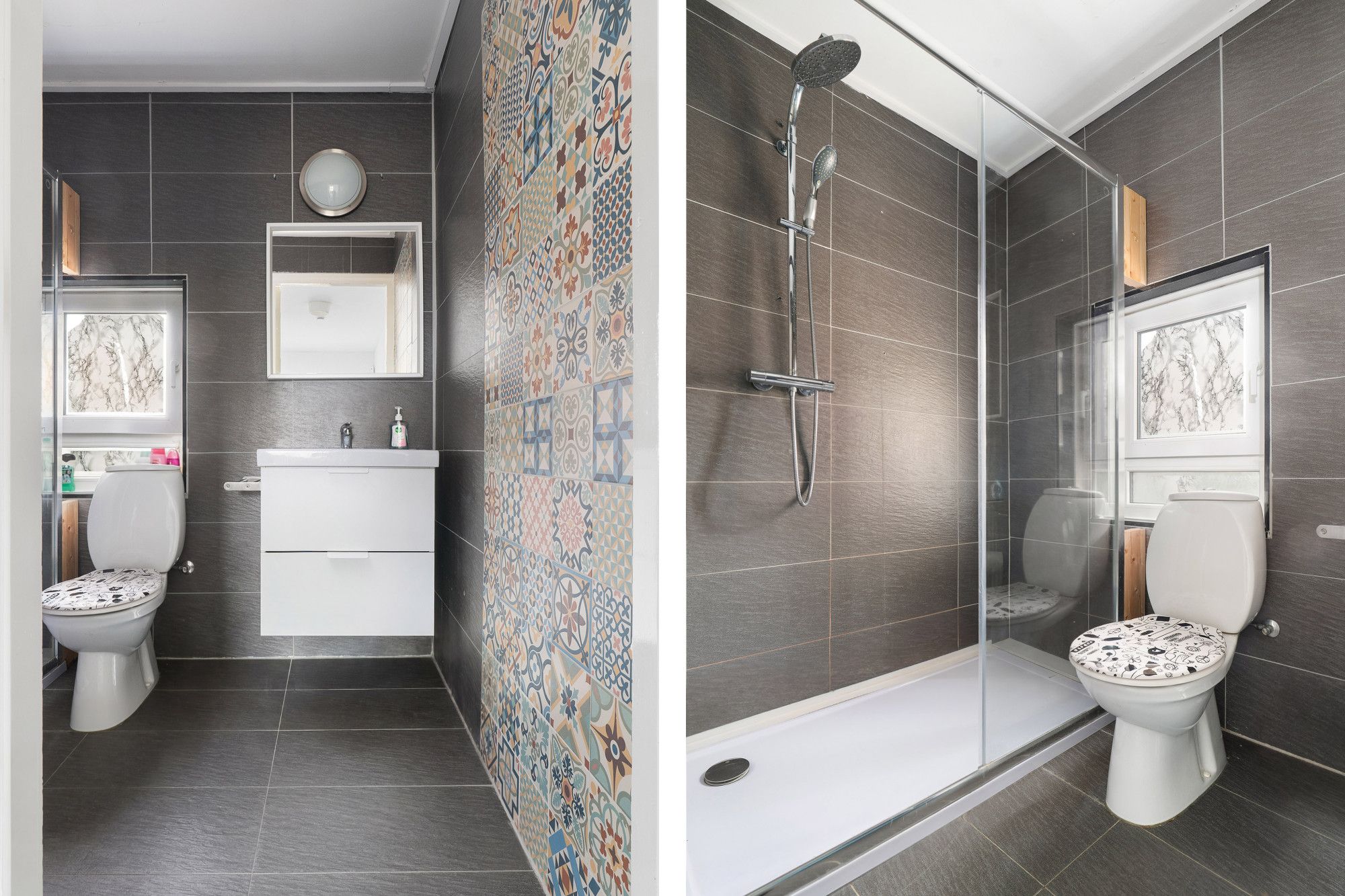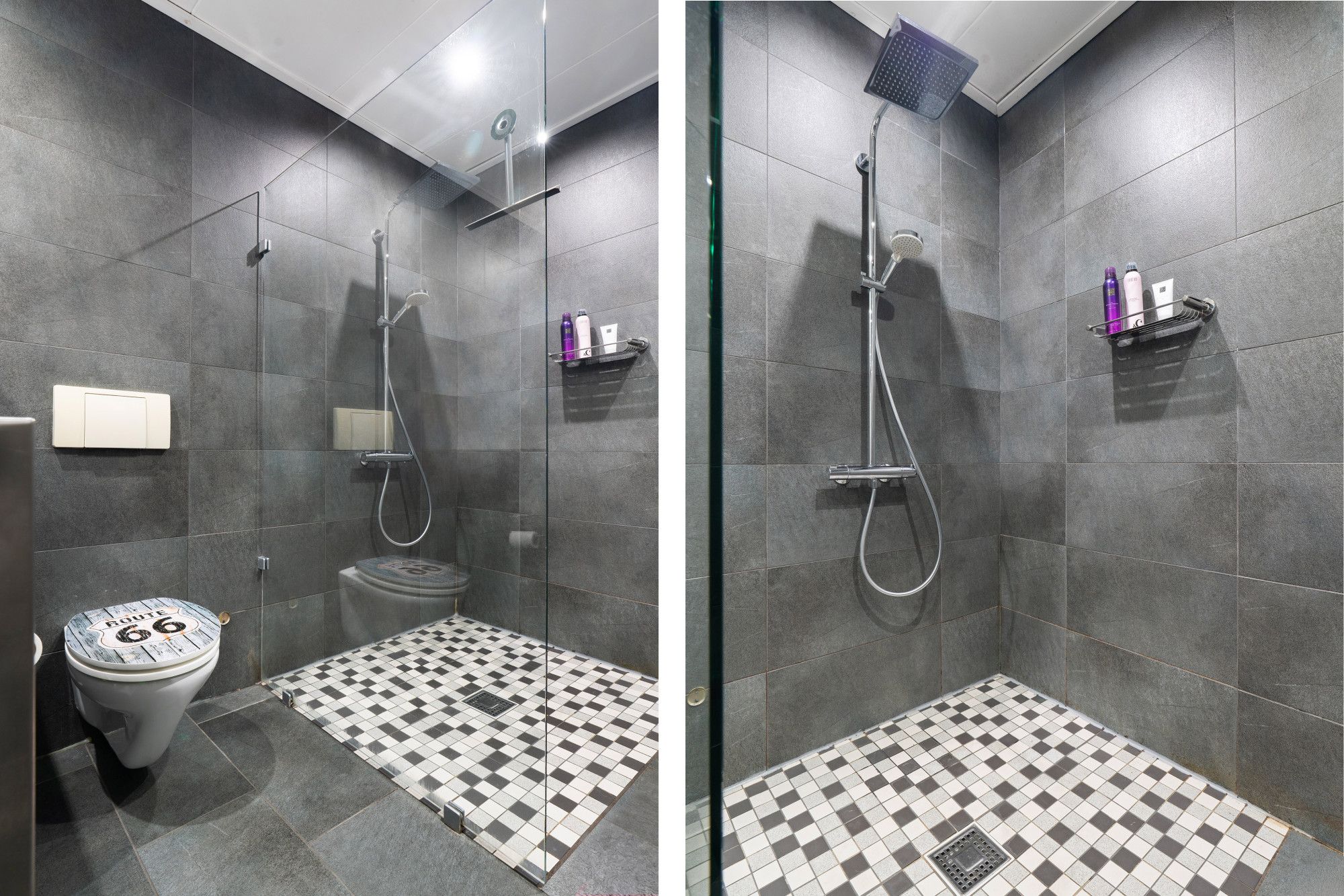 Badkamer met douche, vaste wastafel en toilet.