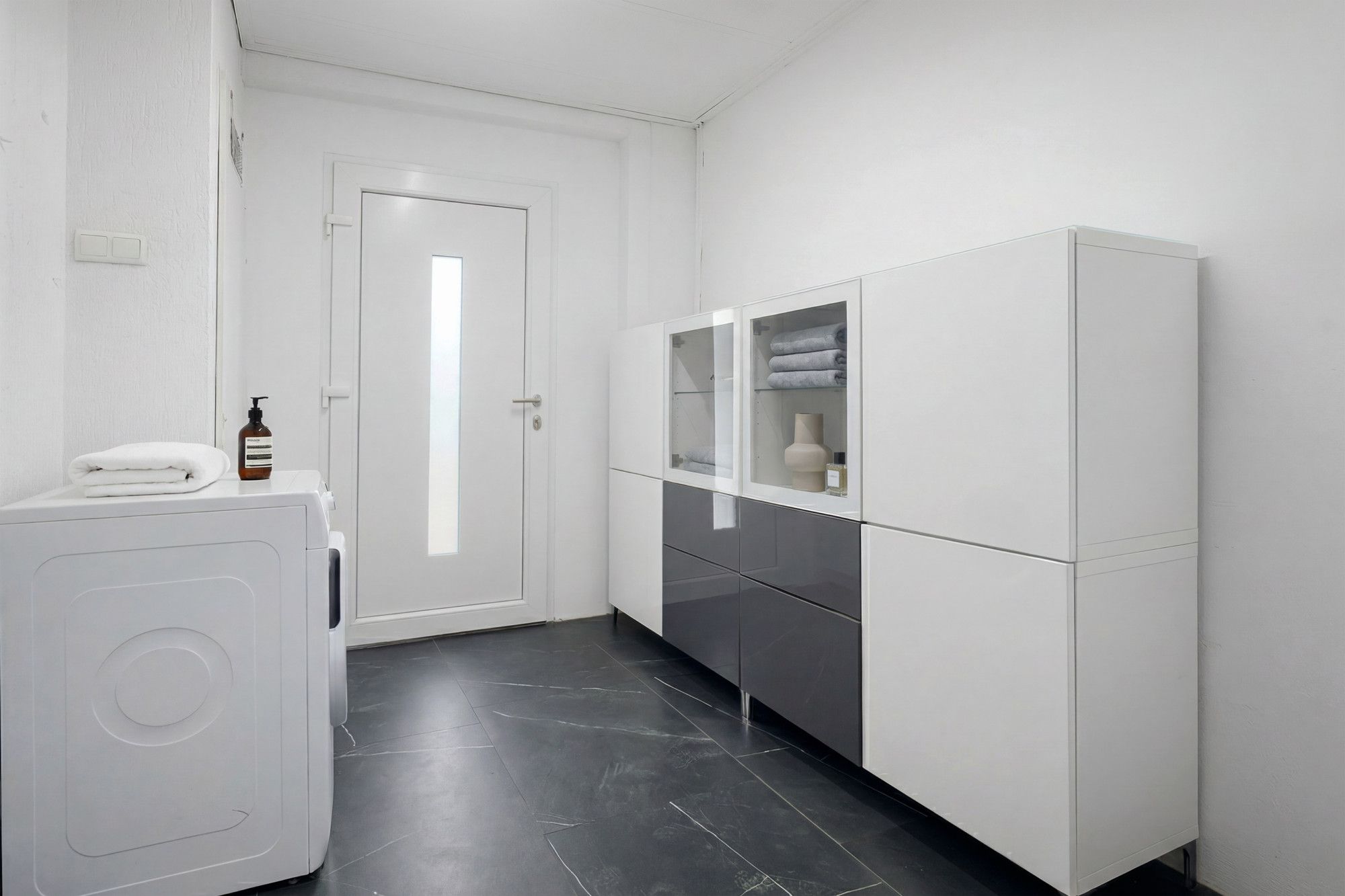 Bijkeuken met wasmachine aansluiting en voldoende opslagruimte.