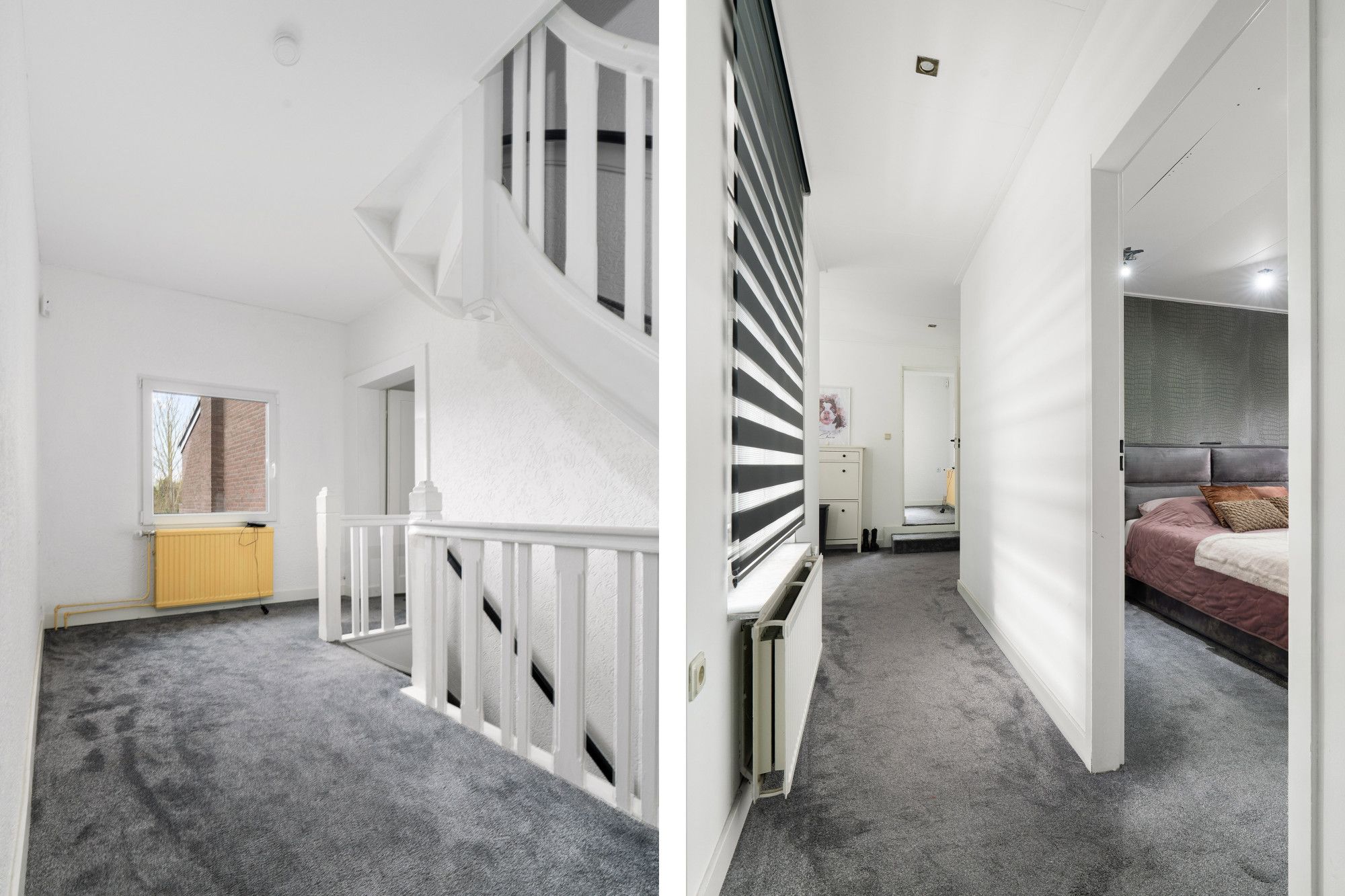 Overloop, twee slaapkamers met inbouwkast, alle voorzien van vloerbedekking.