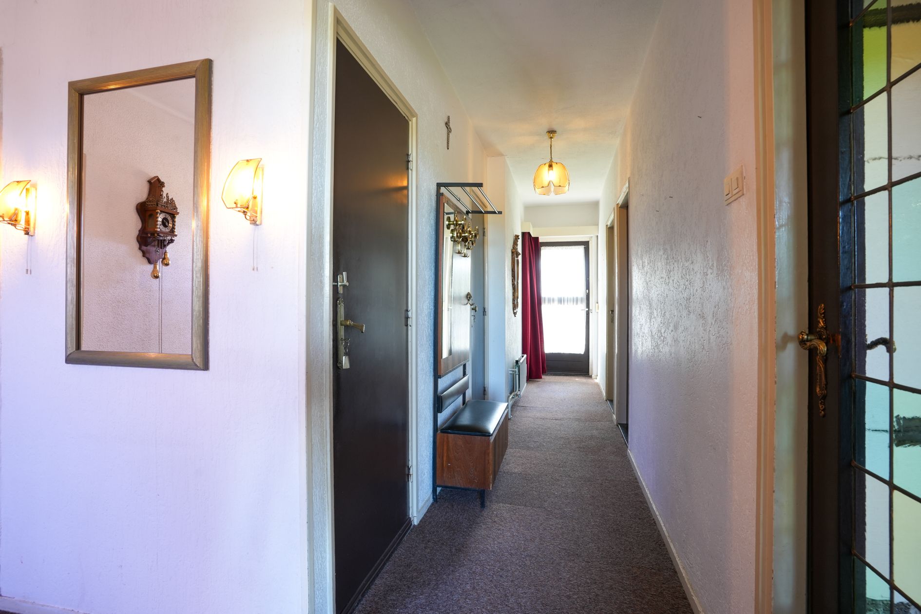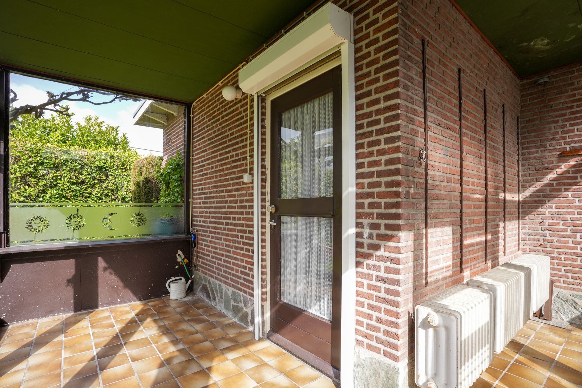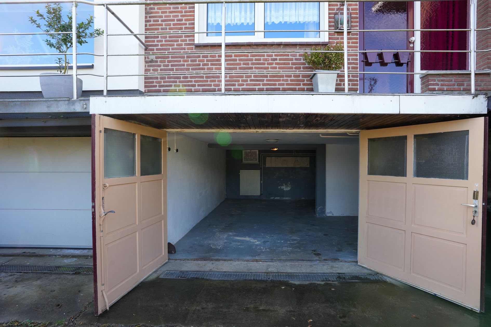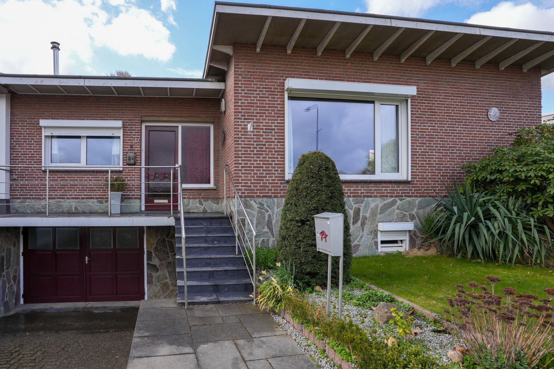 Via de trap aan de voorzijde bereikt u het bordes en de entree van de woning. De brede oprit biedt parkeergelegenheid en geeft toegang tot de onder de woning gelegen garage.